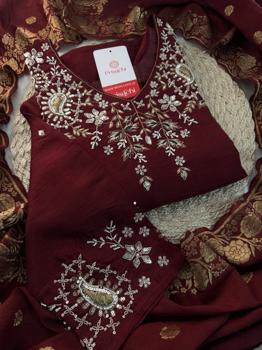 Brown hand embroidered A Line kurta pant with dupatta