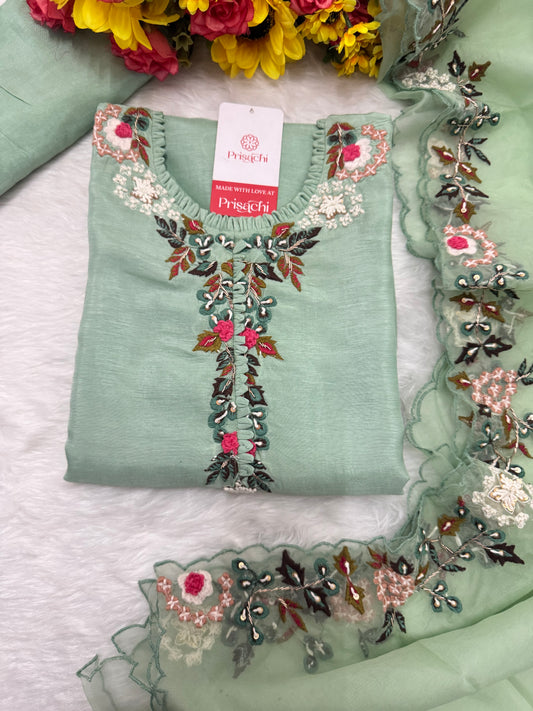 Green Musline Kurti Pant with Organza Dupttaa set