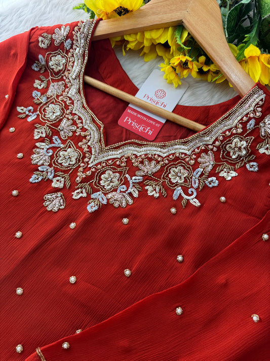 Red Neck Embroidered Muslin kurta set with Full Designed dupatta
