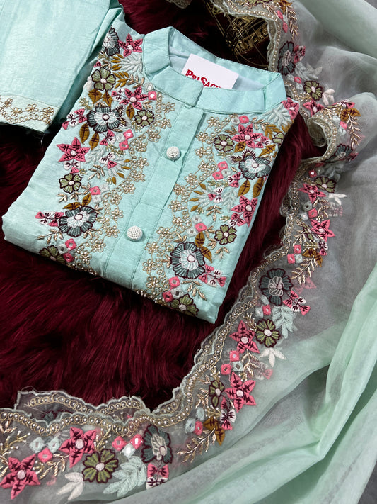 Sky blue Embroidered kurta Pant with dupatta with Zardosi work