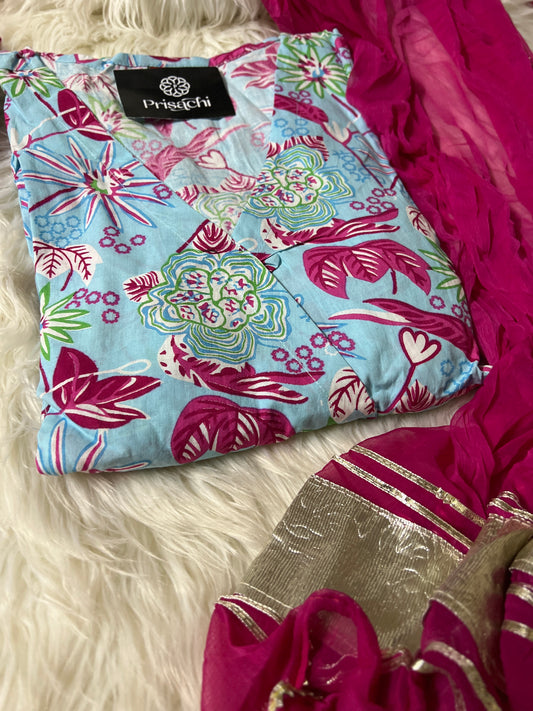 Floral Printed Cotton Kurta With Pants & Dupatta