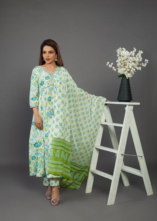 Off white and green Cotton Floral Kurta with Pant and Dupatta
