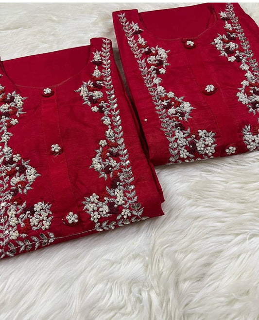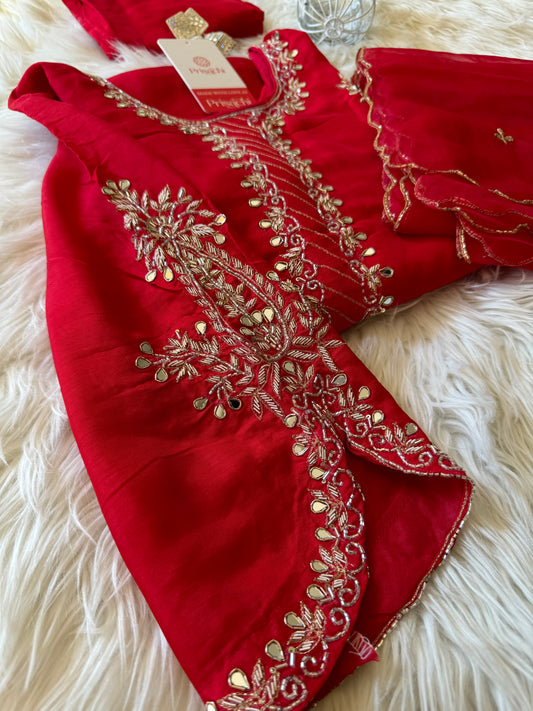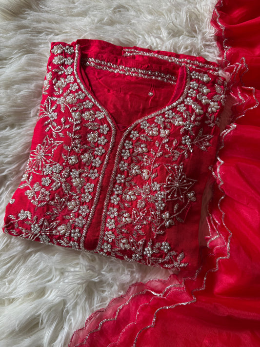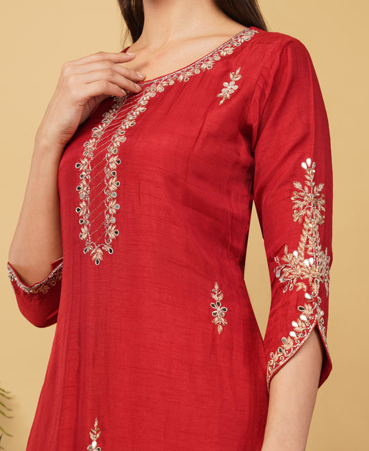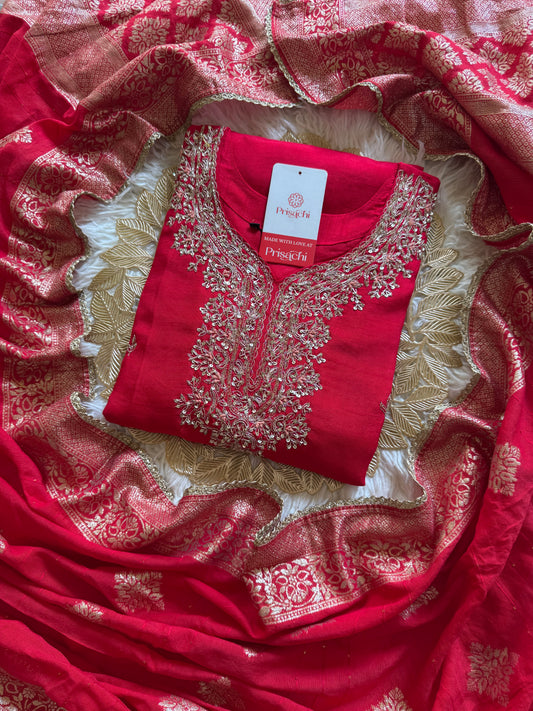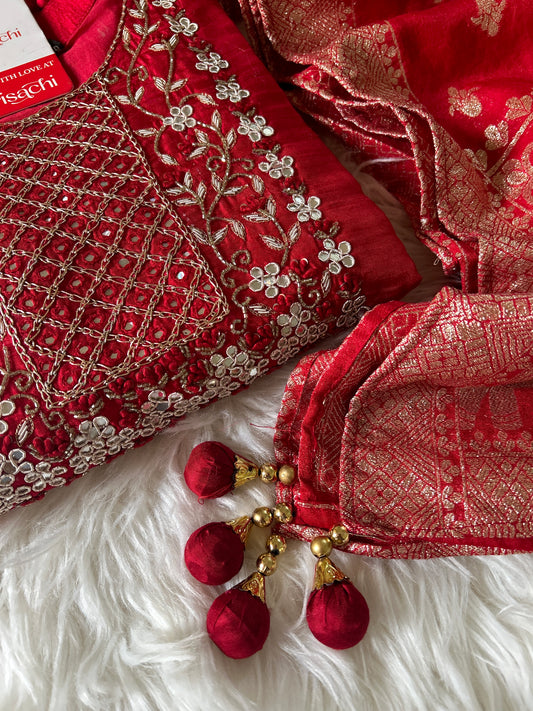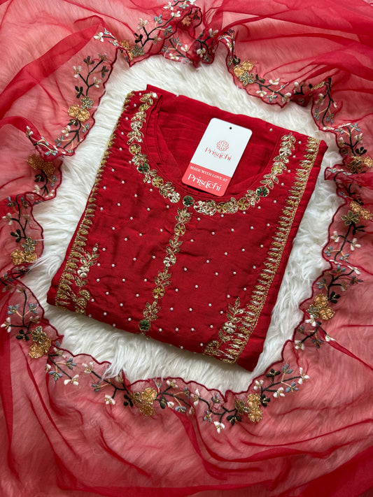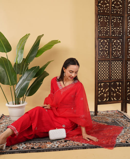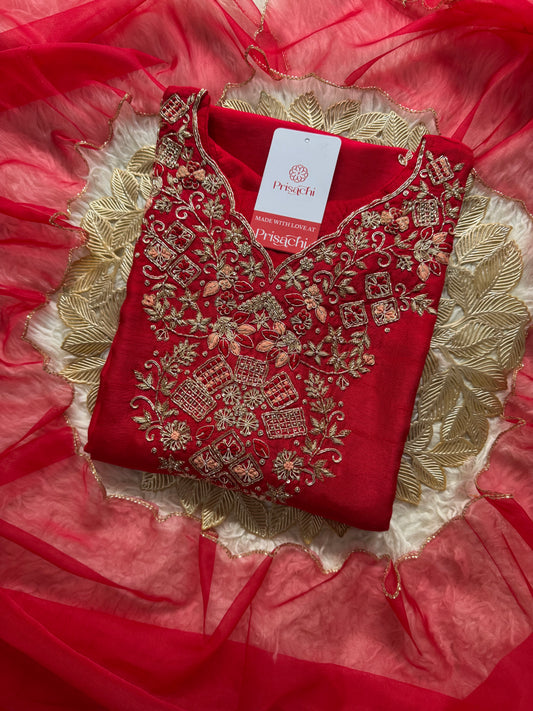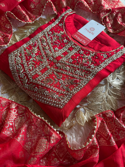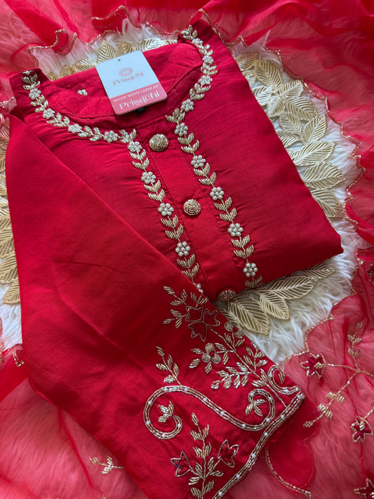 Red embroidered kurta bottom with dupatta with Zardosi work
