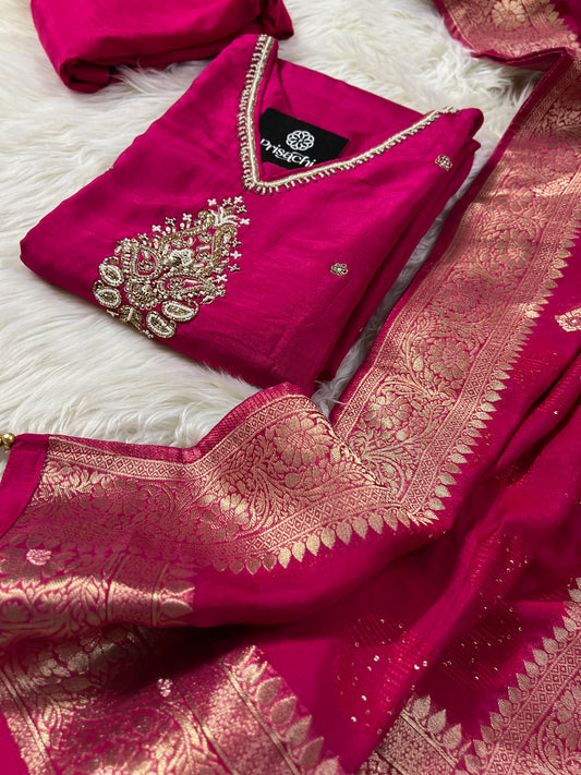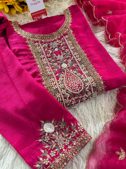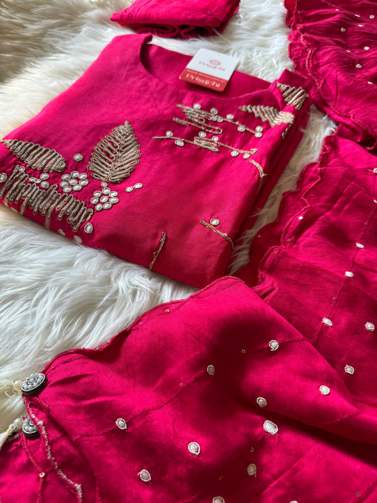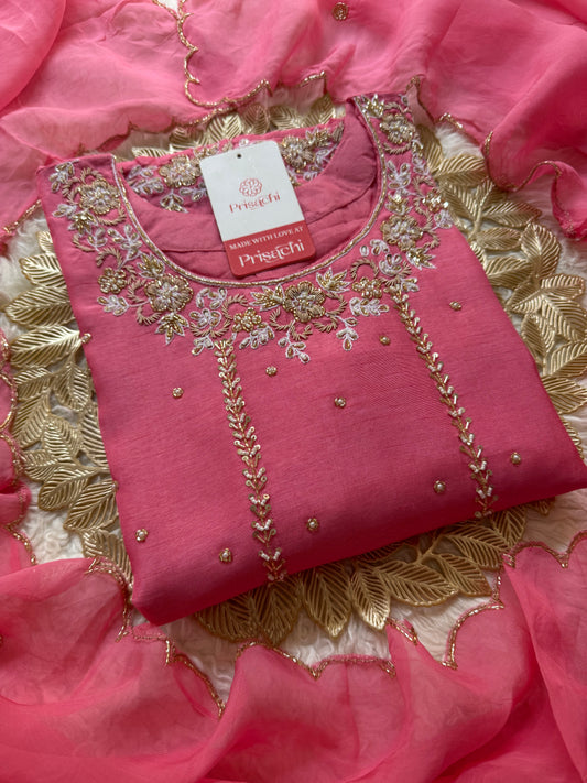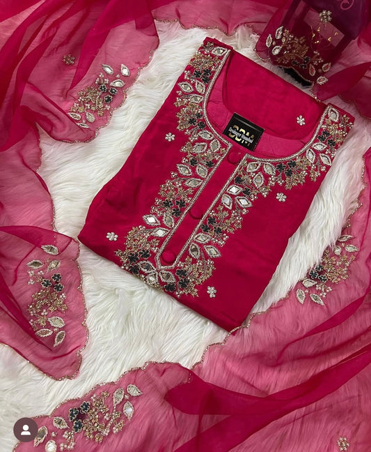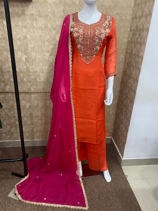 Orange Embroidered Kurta Pant With Contrast Pink Dupatta