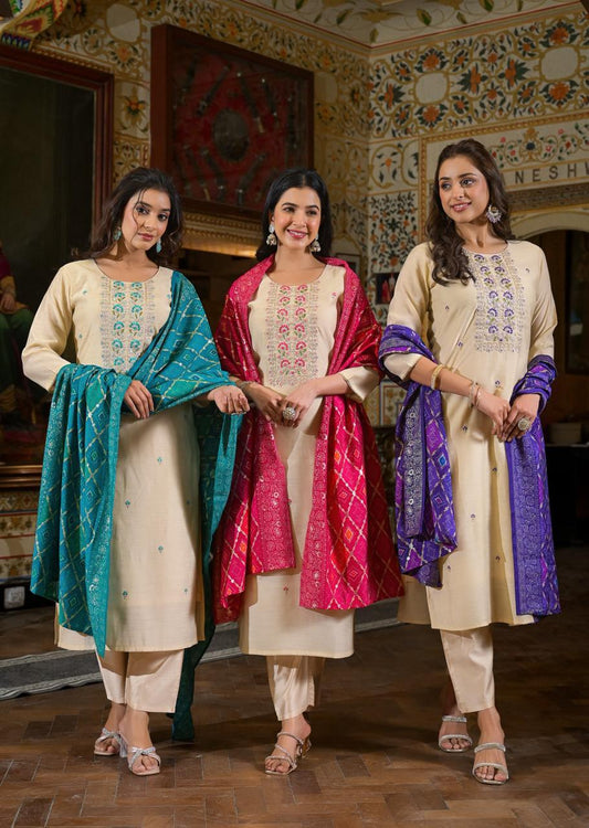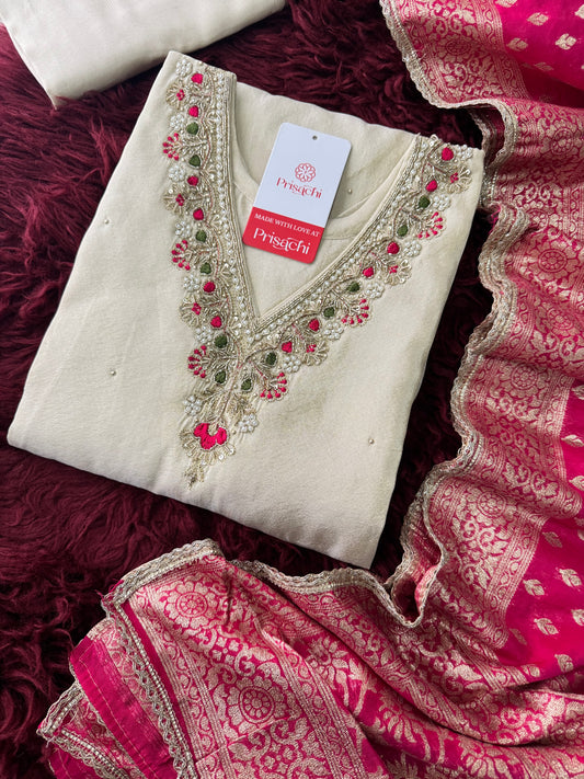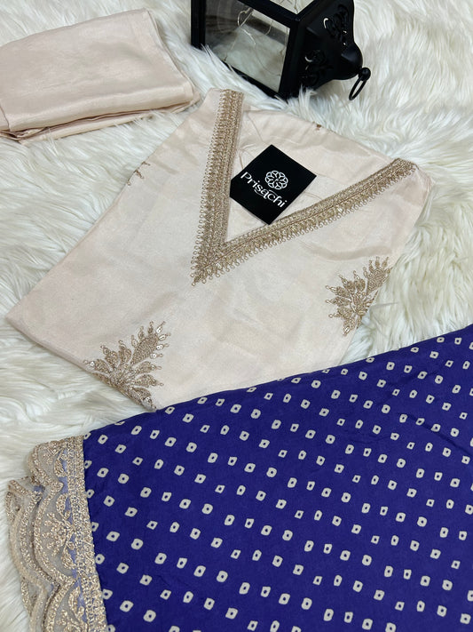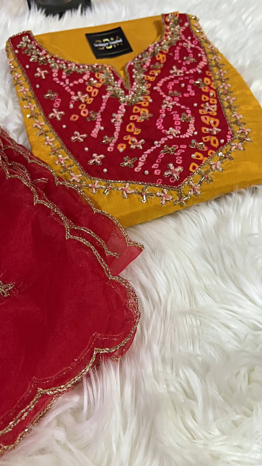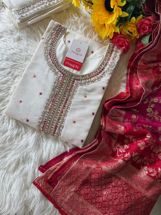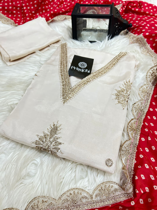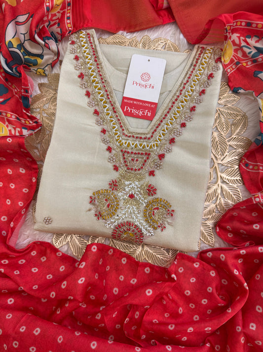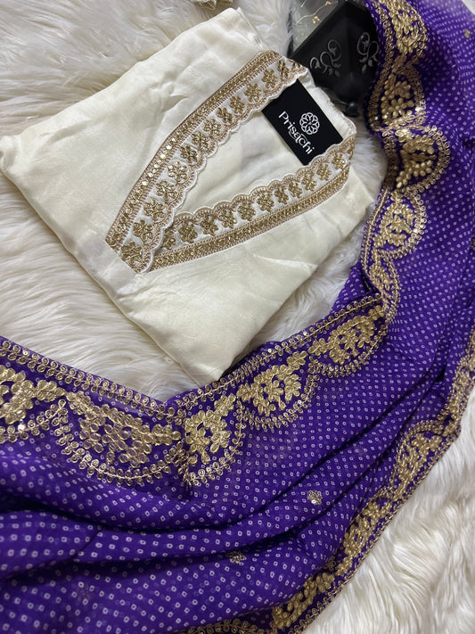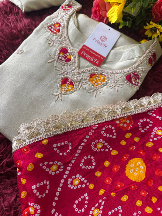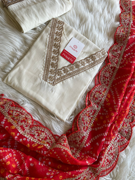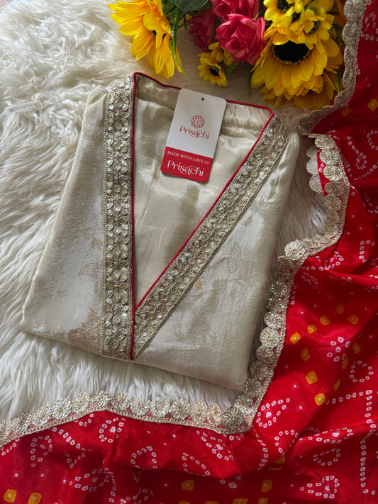 Off White Lilac silk kurta set with Red bandhani dupatta