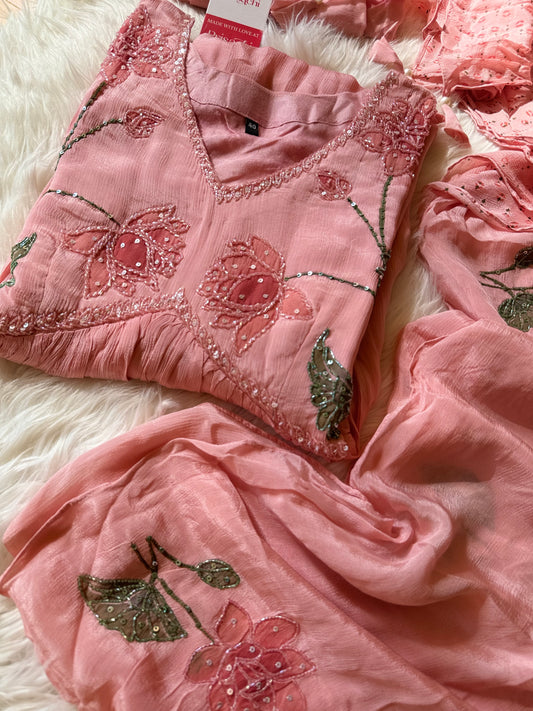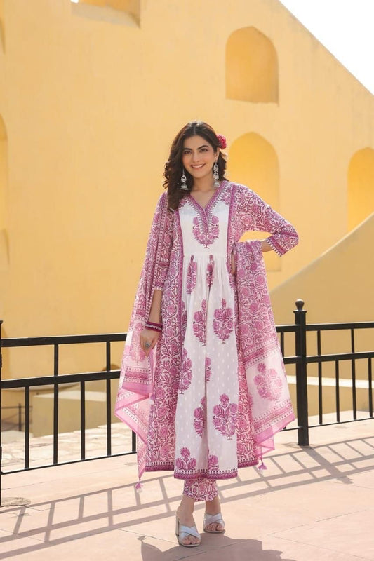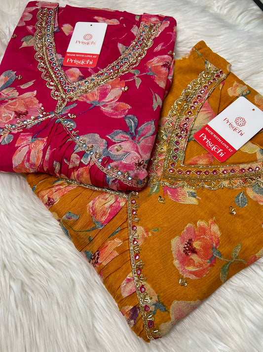 Pink Chinon floral print Alia cut Anarkali dress duppata