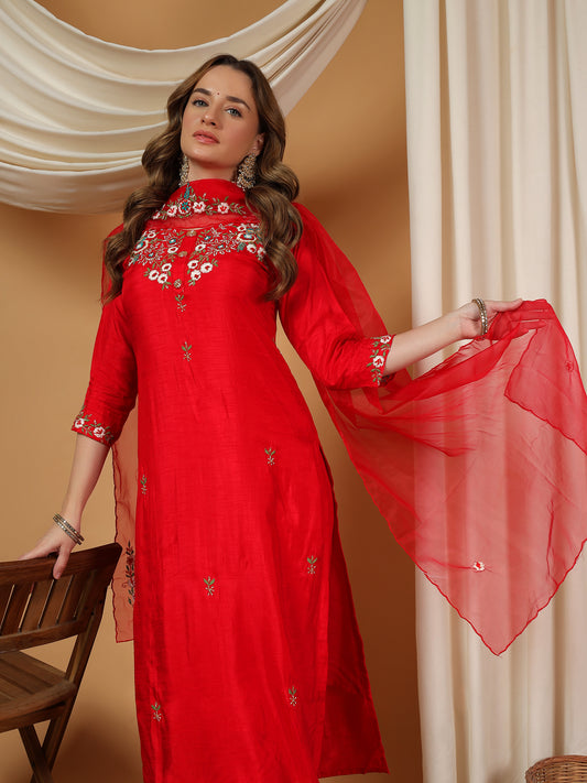 Red Designer Embroidered kurta set with pant & dupatta