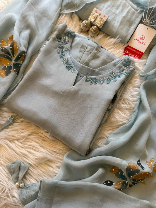 Sky blue Handwork kurta Pant with dupatta