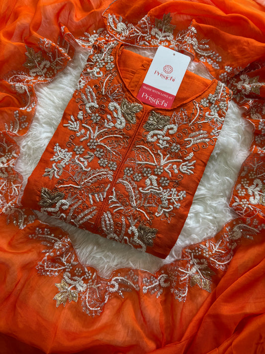 Women Orange Designer Hand Embroidered Kurta set with dupatta with Pant