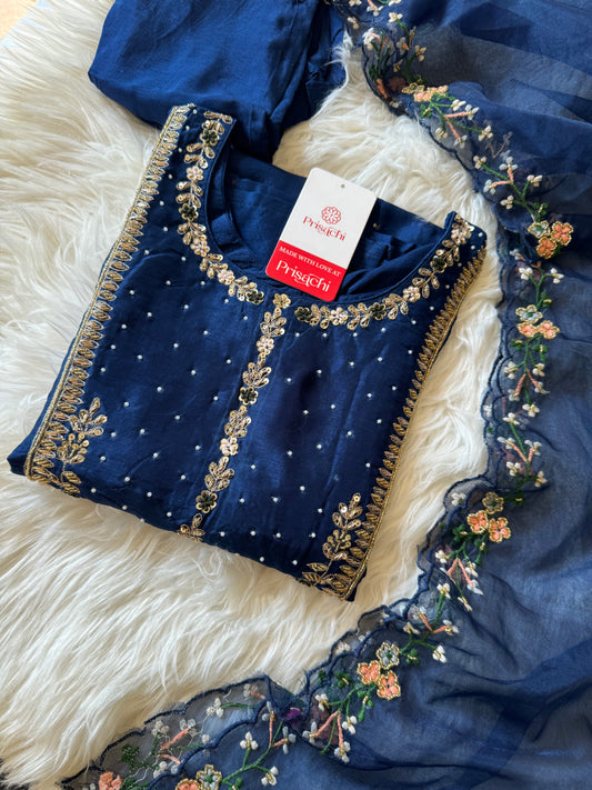 Women Blue Designer Hand Embroidered Kurta set with dupatta with Pant