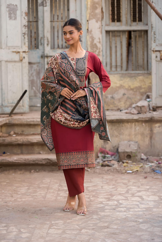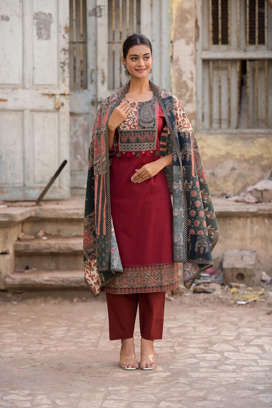 Women Wine Designer Embroidered Kurta set with dupatta with Pant