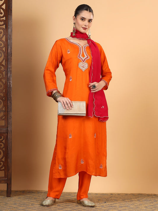 Women Orange Designer Embroidered Kurta set with dupatta with Pant