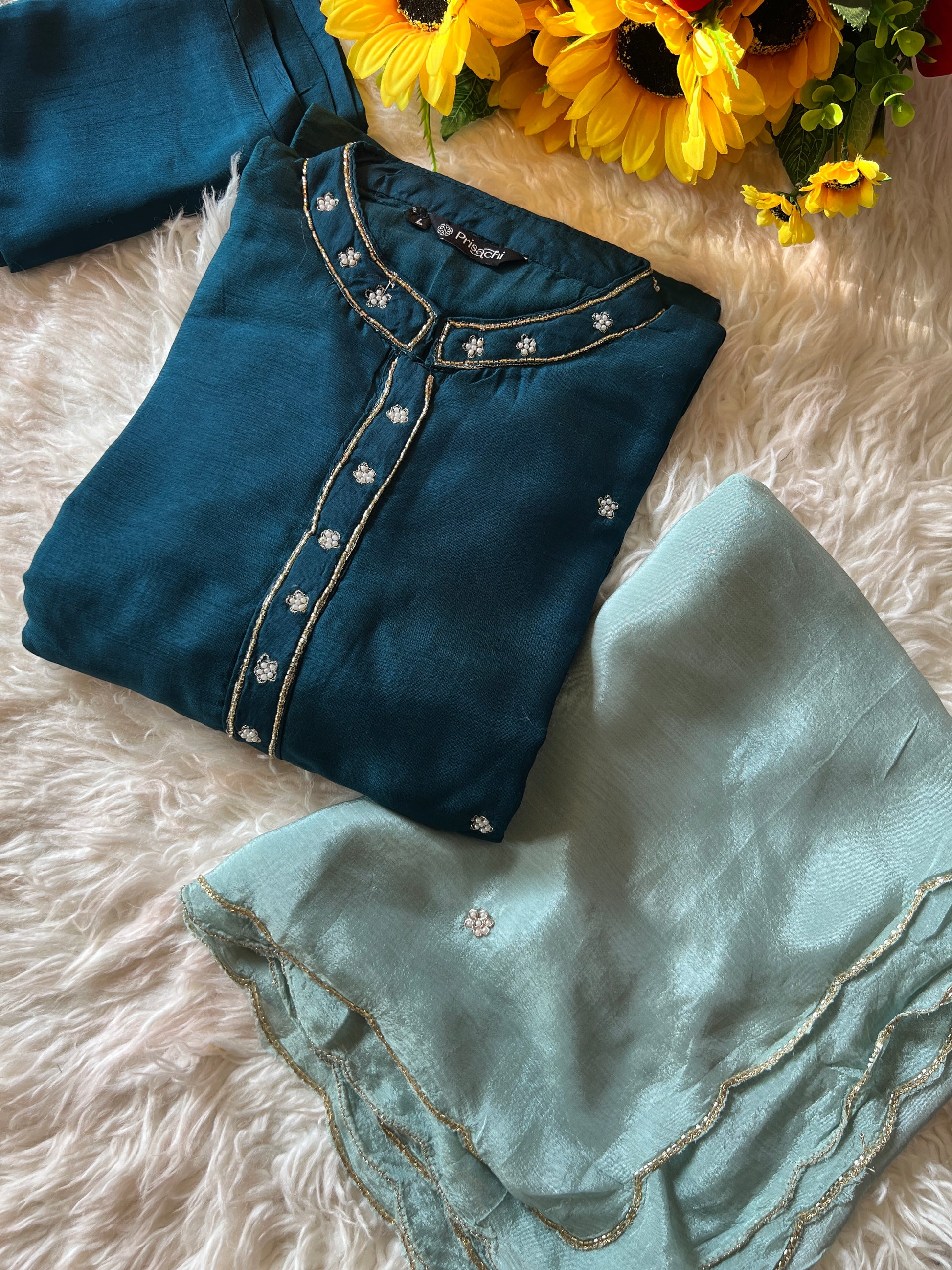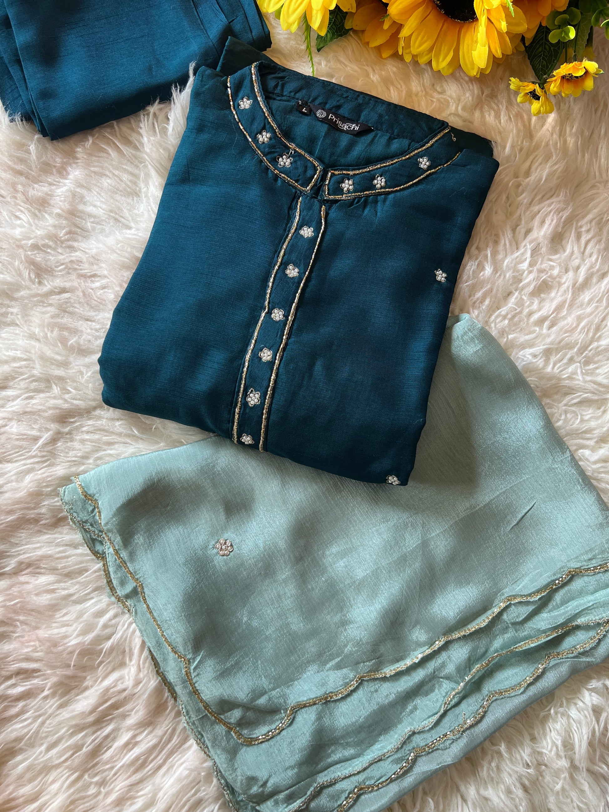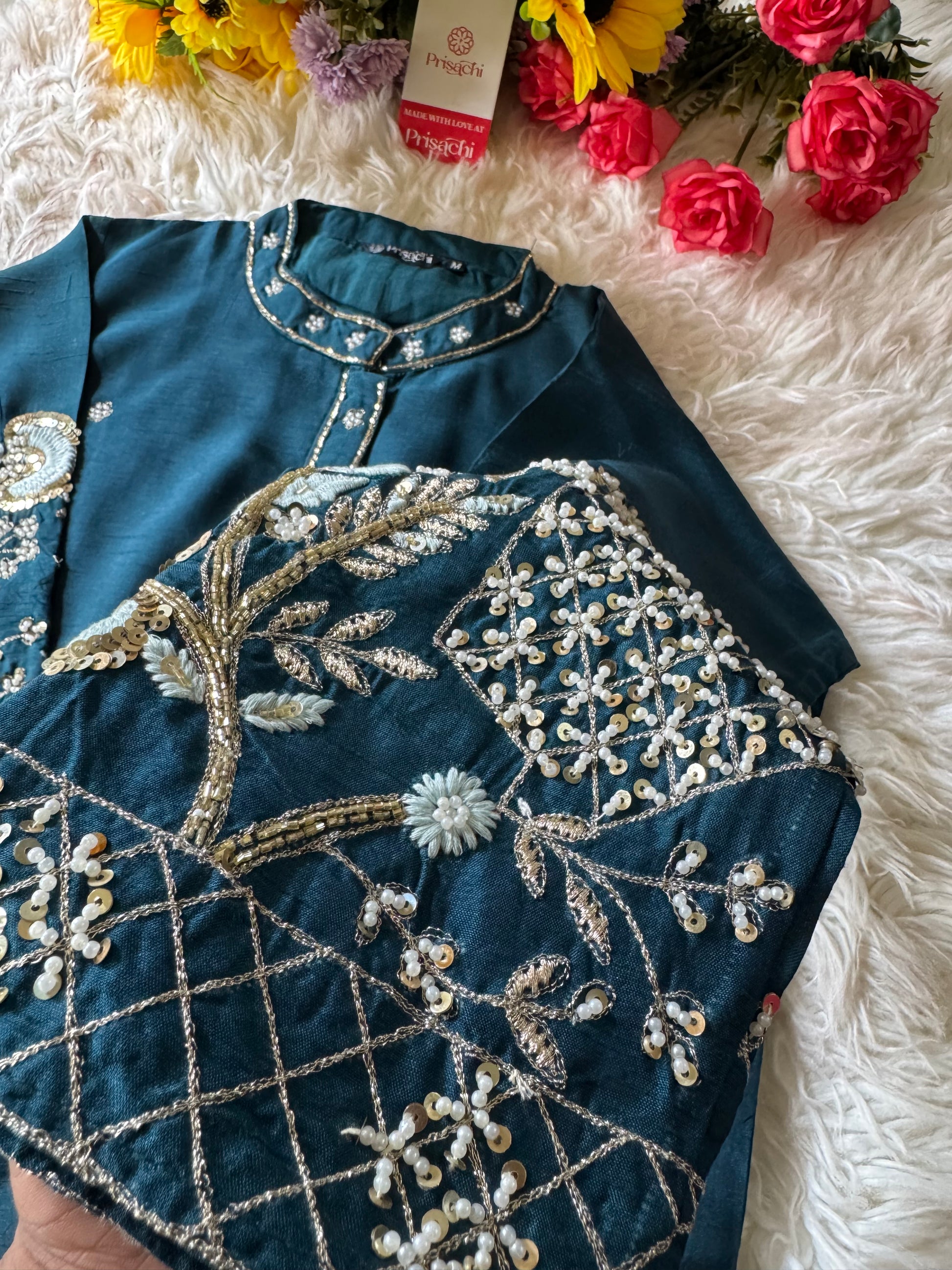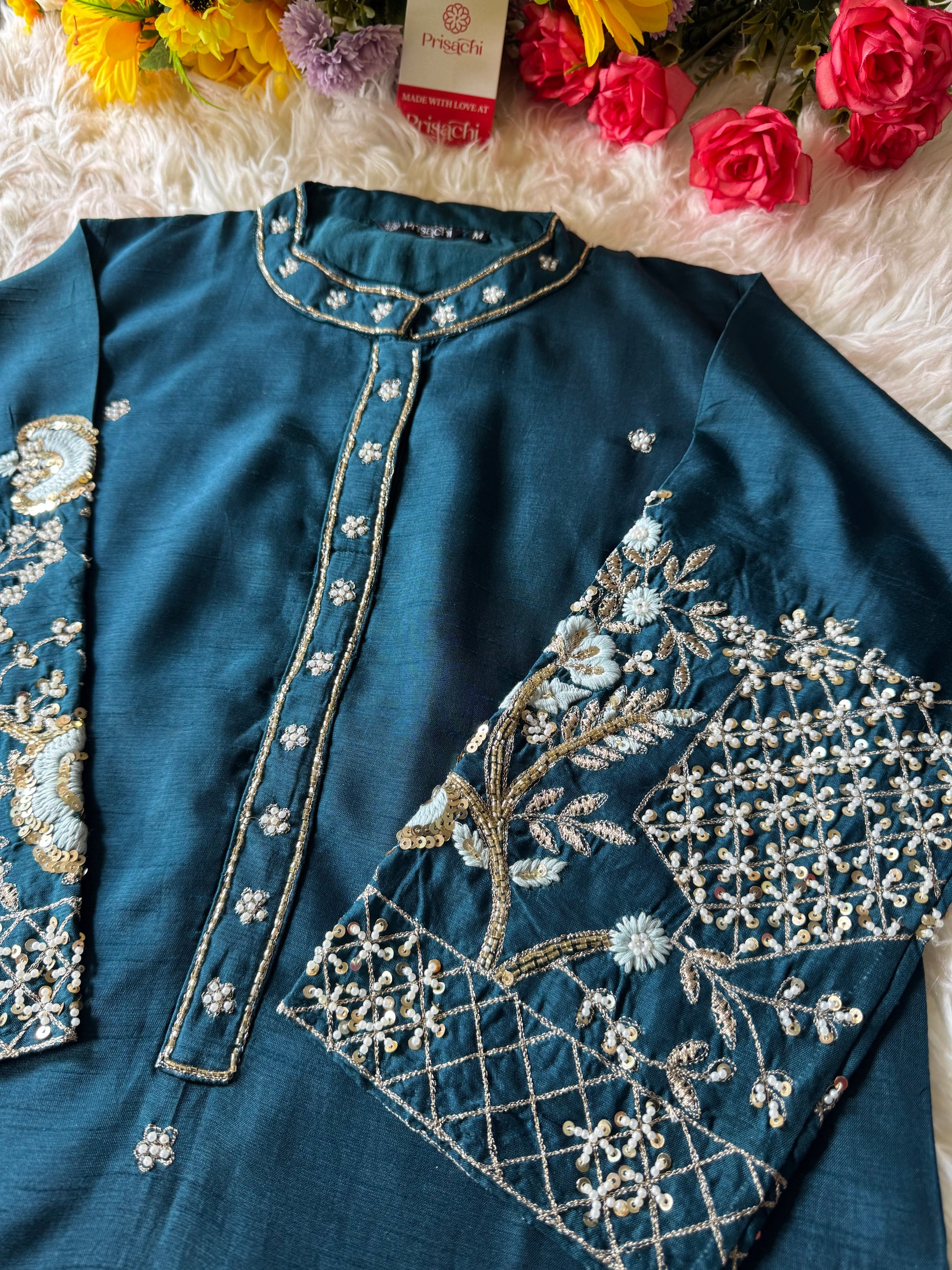 Our Embroidered Kurta Set with Dupatta will have you embracing vivid sophistication. The deep crimson color and elaborate embroidery on this outfit exude elegance. It's a versatile option for any event when paired with a coordinating dupatta, providing the ideal fusion of classic charm and modern flair for the style-conscious.