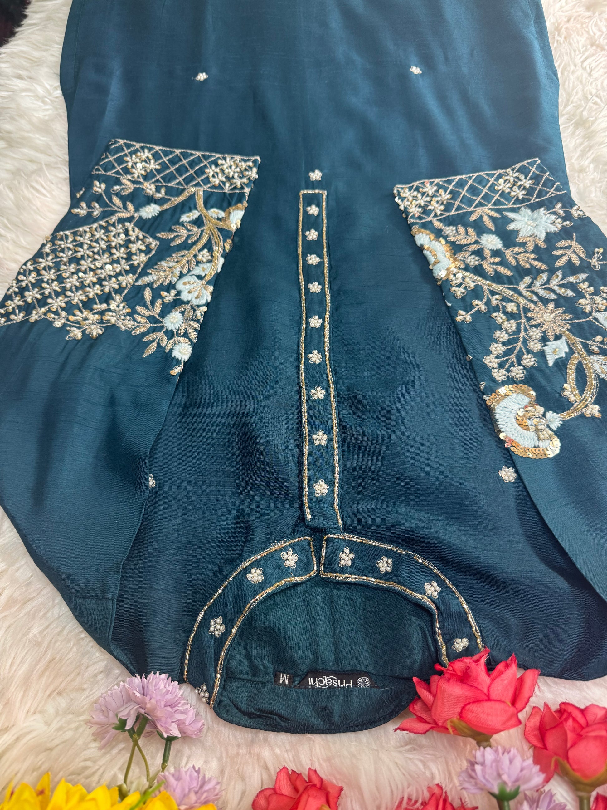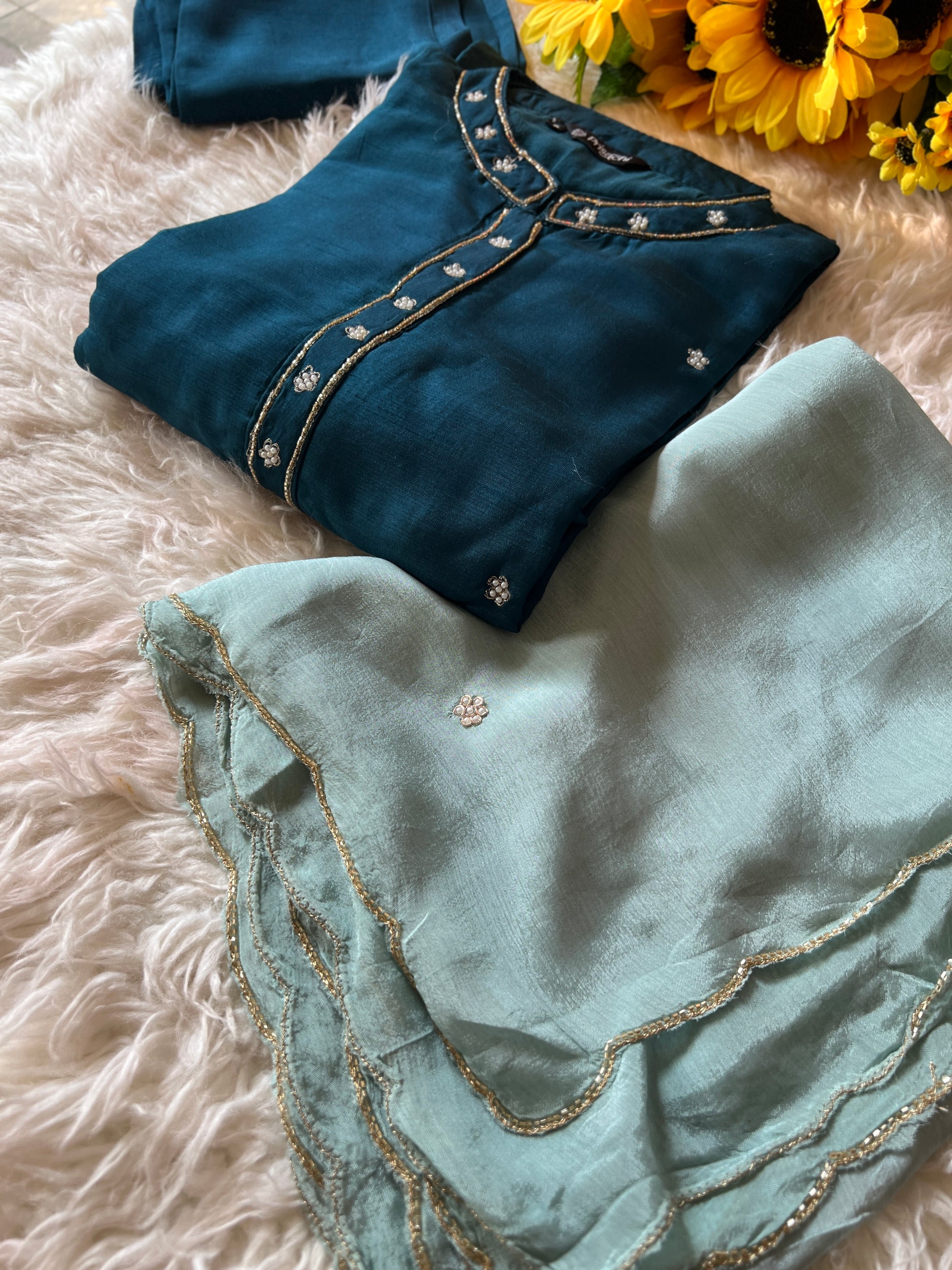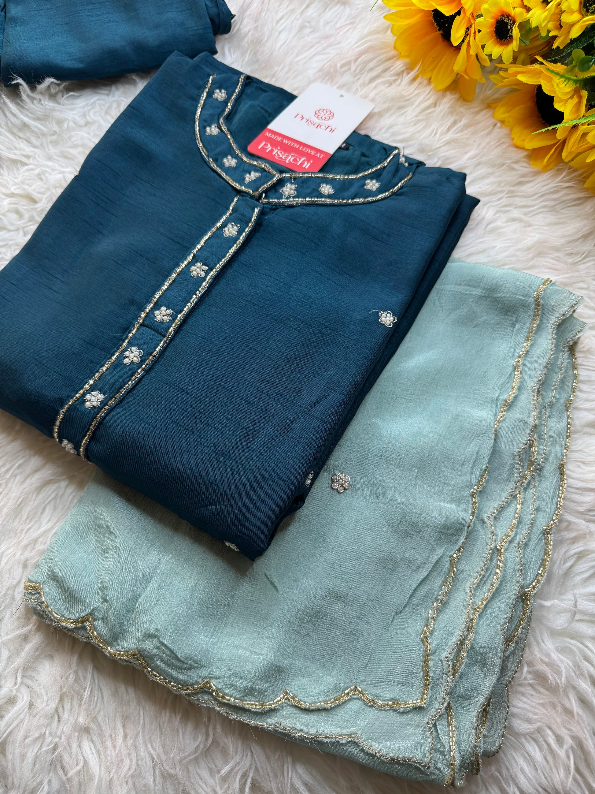 Our Embroidered Kurta Set with Dupatta will have you embracing vivid sophistication. The deep crimson color and elaborate embroidery on this outfit exude elegance. It's a versatile option for any event when paired with a coordinating dupatta, providing the ideal fusion of classic charm and modern flair for the style-conscious.