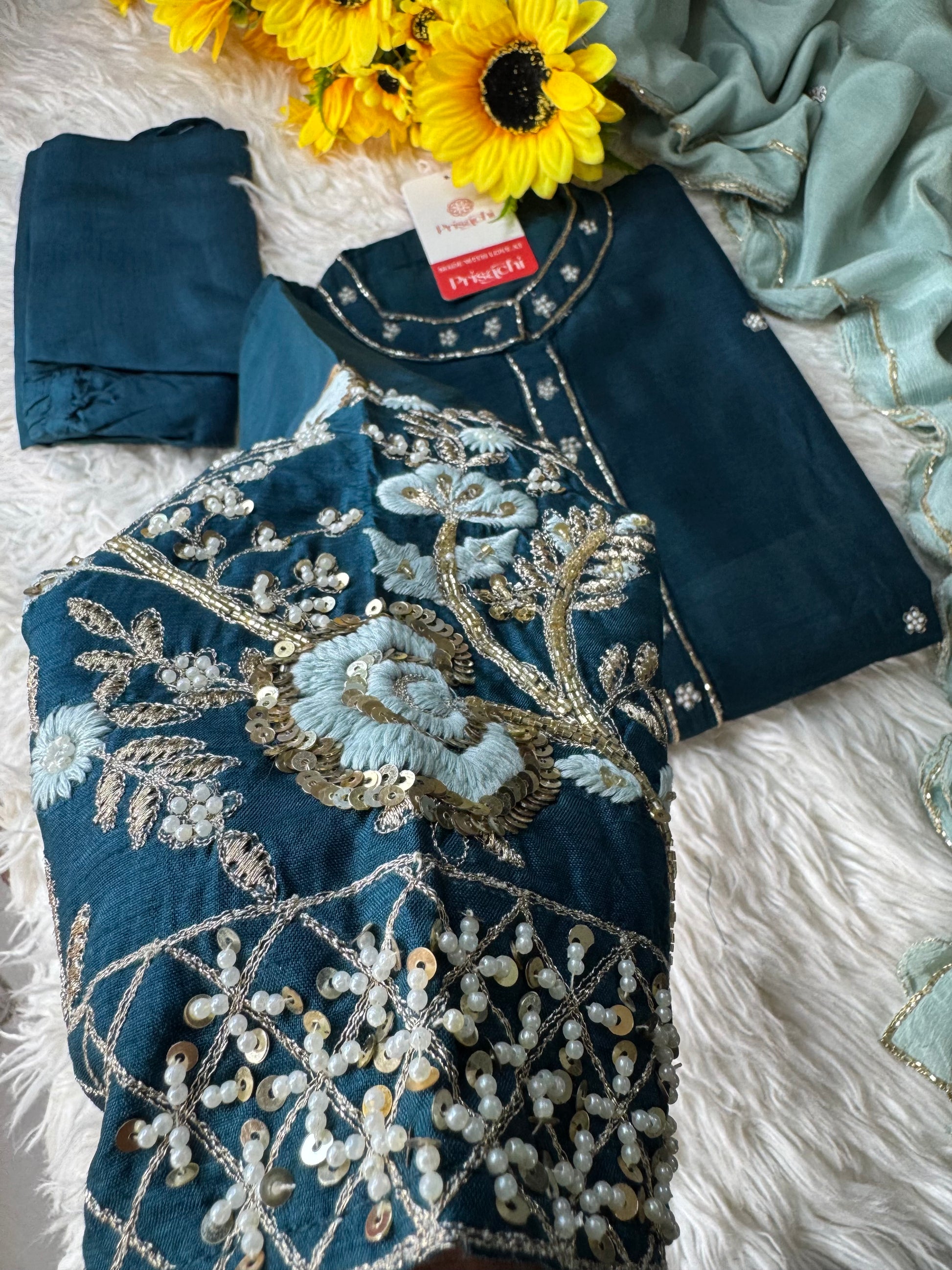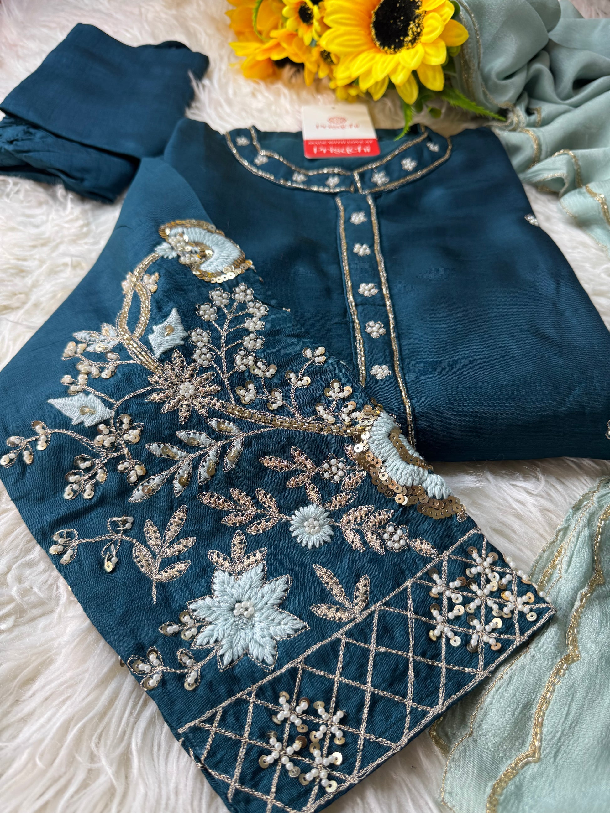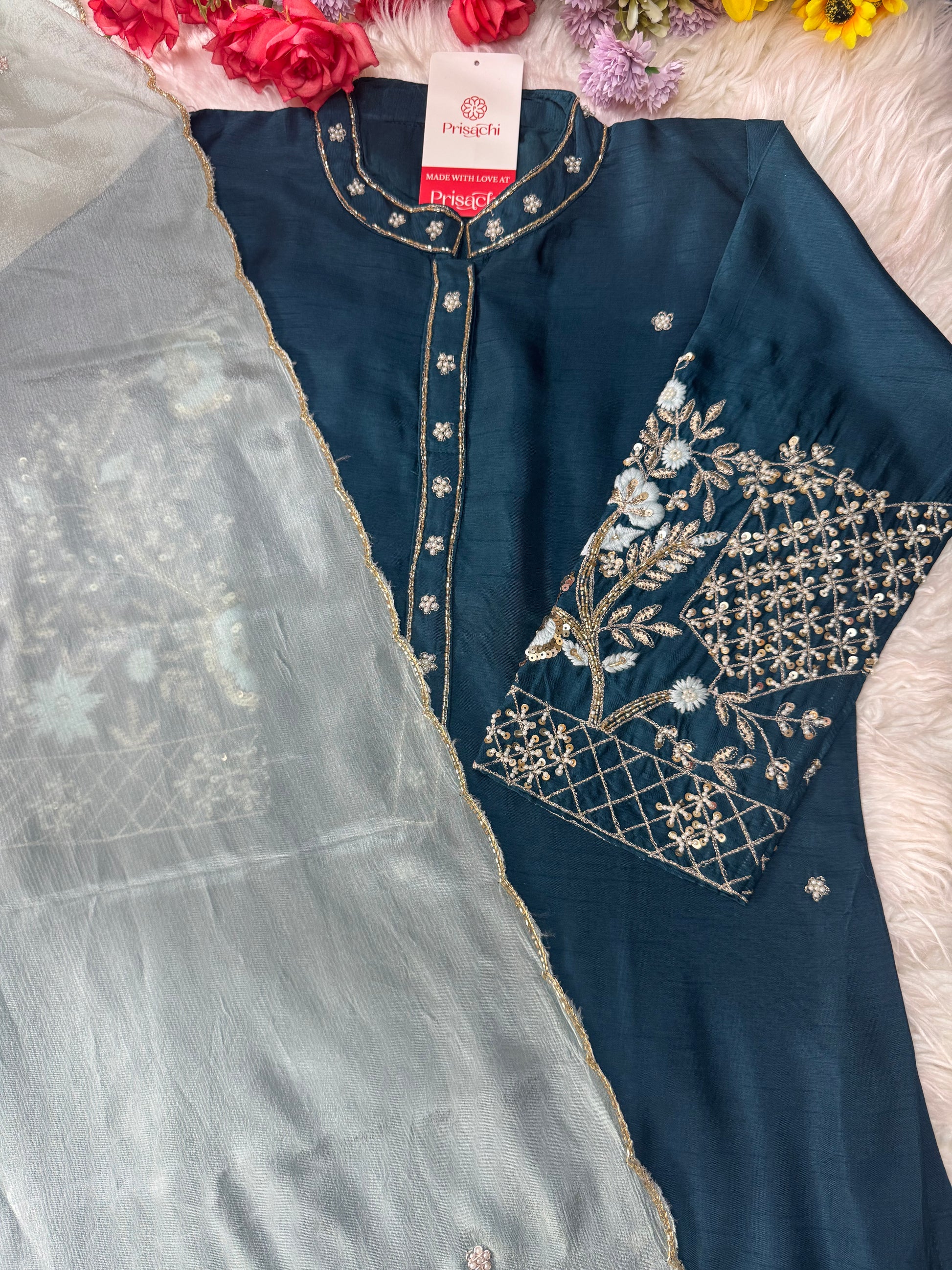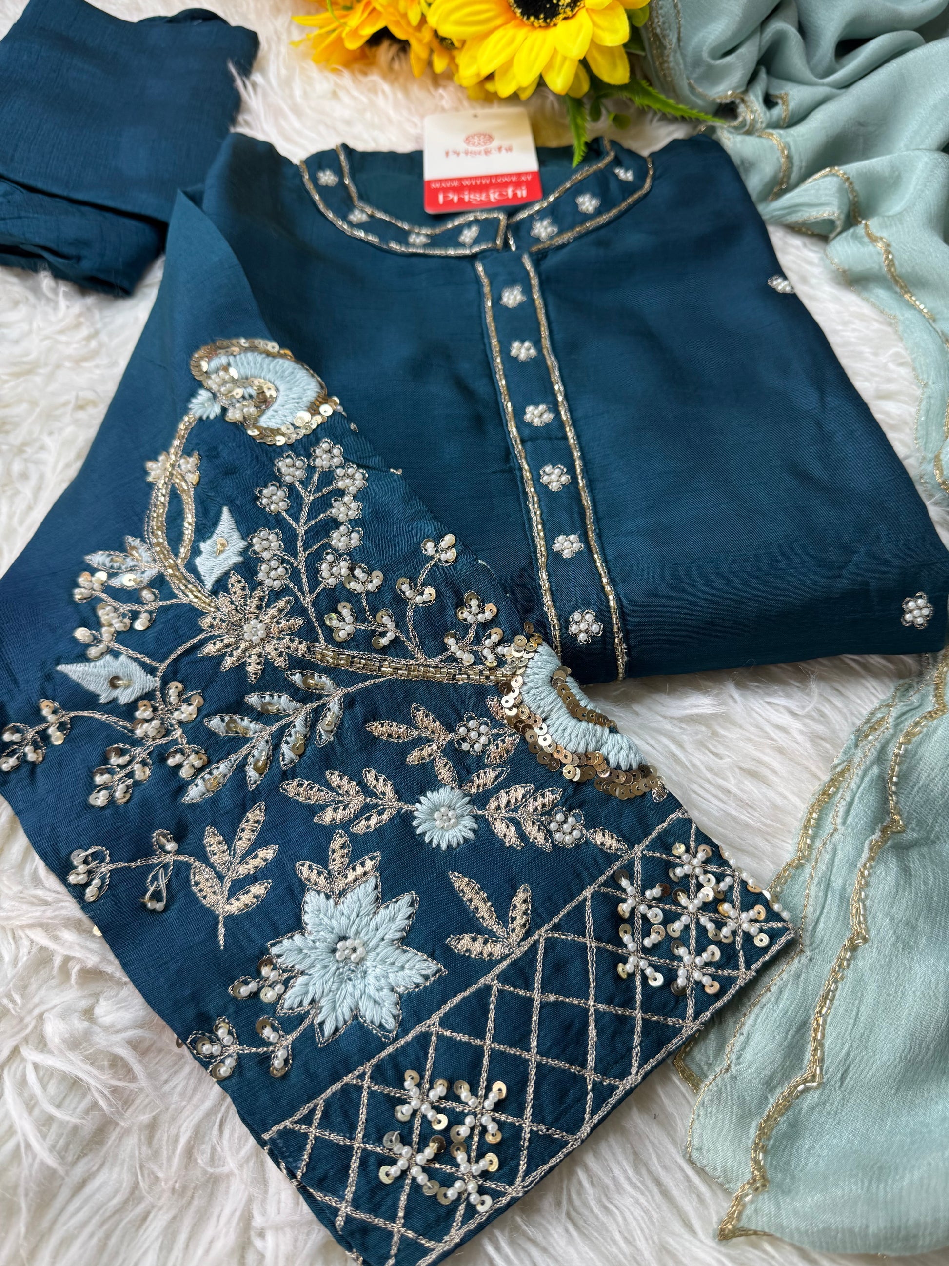 Our Embroidered Kurta Set with Dupatta will have you embracing vivid sophistication. The deep crimson color and elaborate embroidery on this outfit exude elegance. It's a versatile option for any event when paired with a coordinating dupatta, providing the ideal fusion of classic charm and modern flair for the style-conscious.