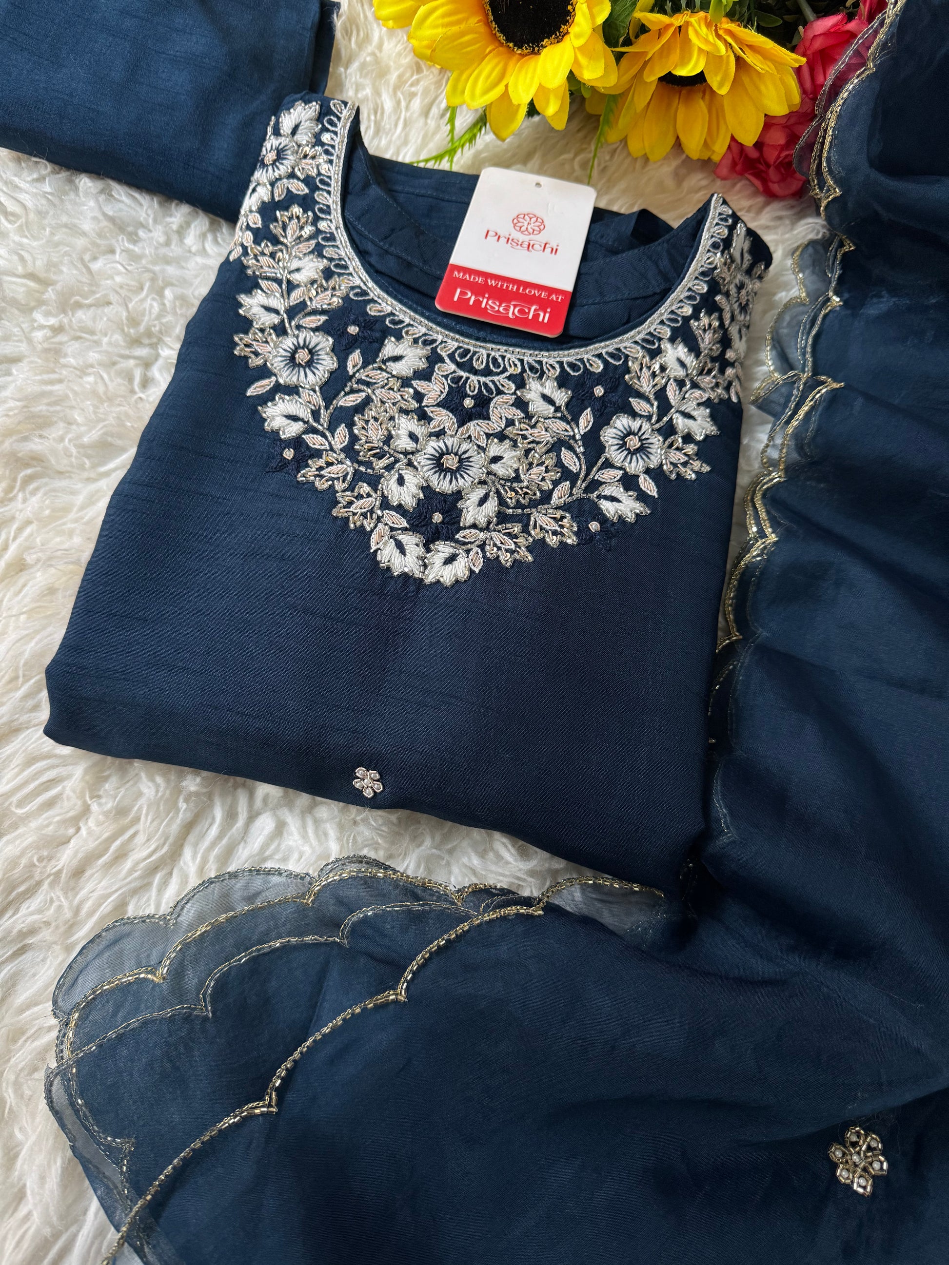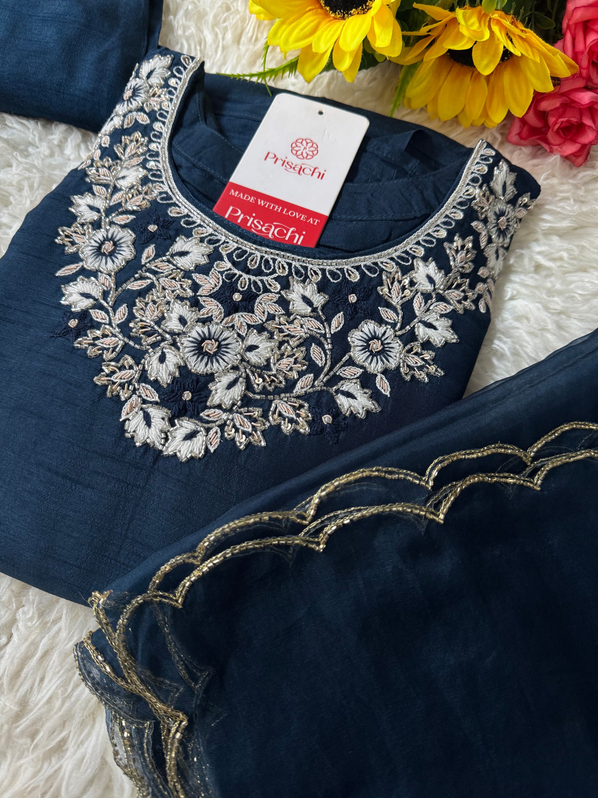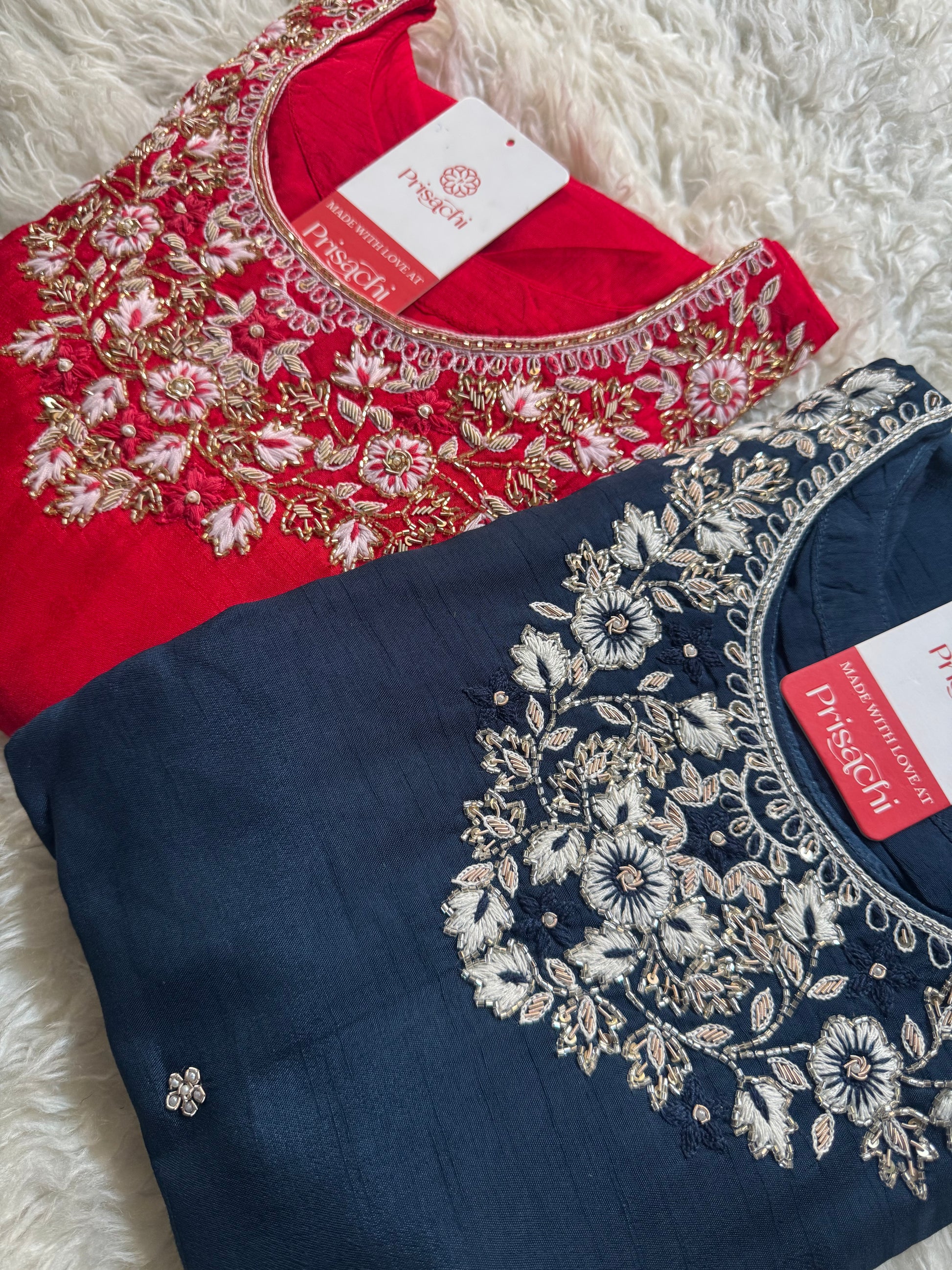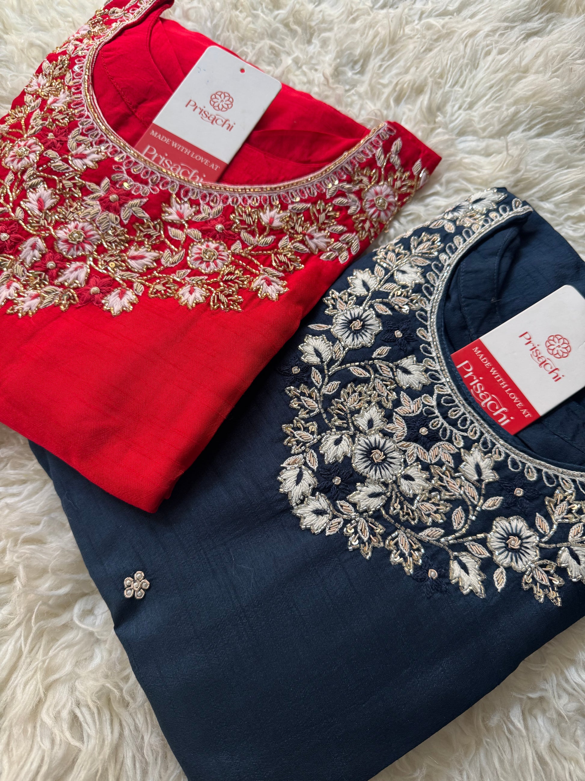 Our Embroidered Kurta Set with Dupatta will have you embracing vivid sophistication. The deep crimson color and elaborate embroidery on this outfit exude elegance. It's a versatile option for any event when paired with a coordinating dupatta, providing the ideal fusion of classic charm and modern flair for the style-conscious.