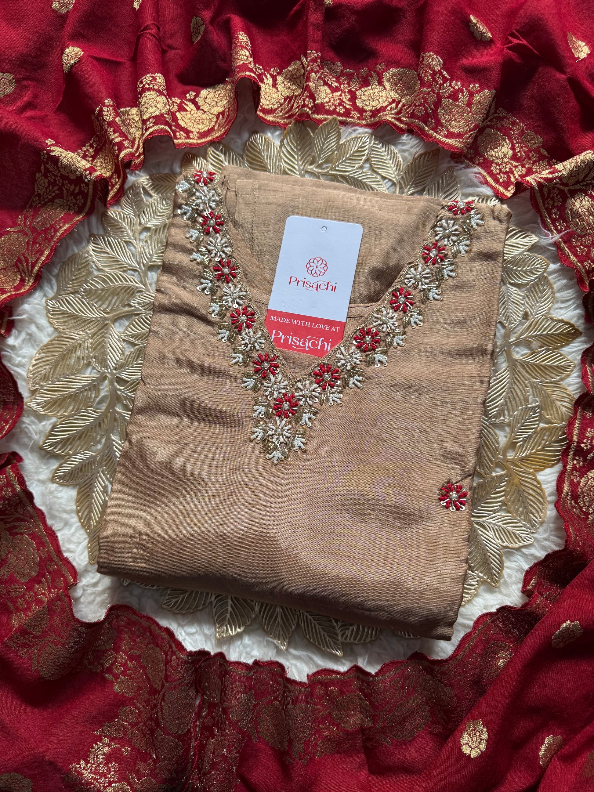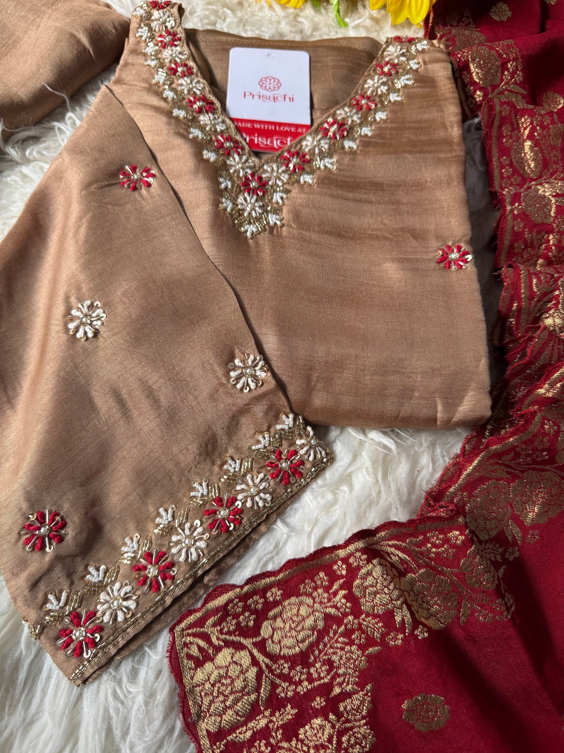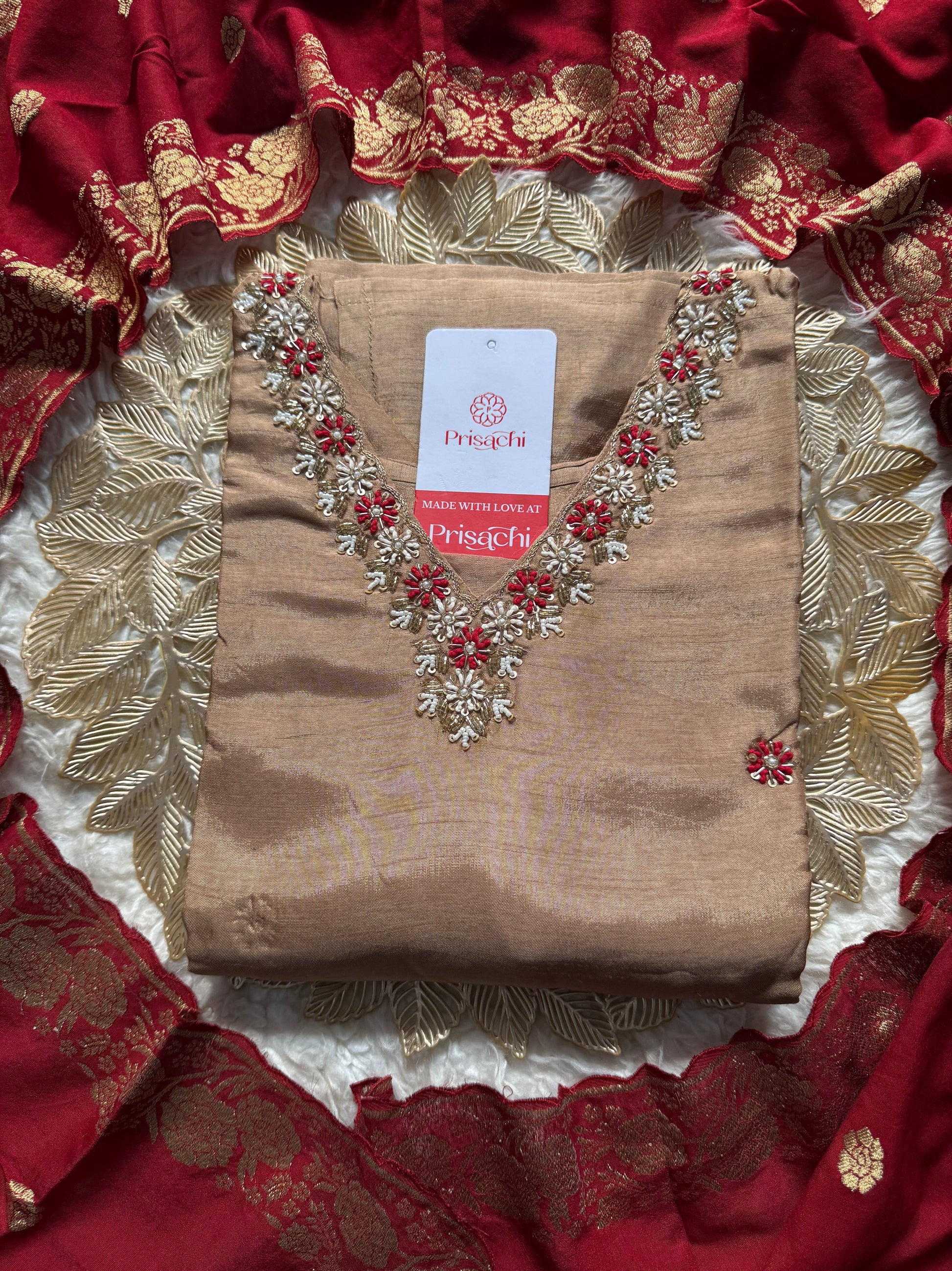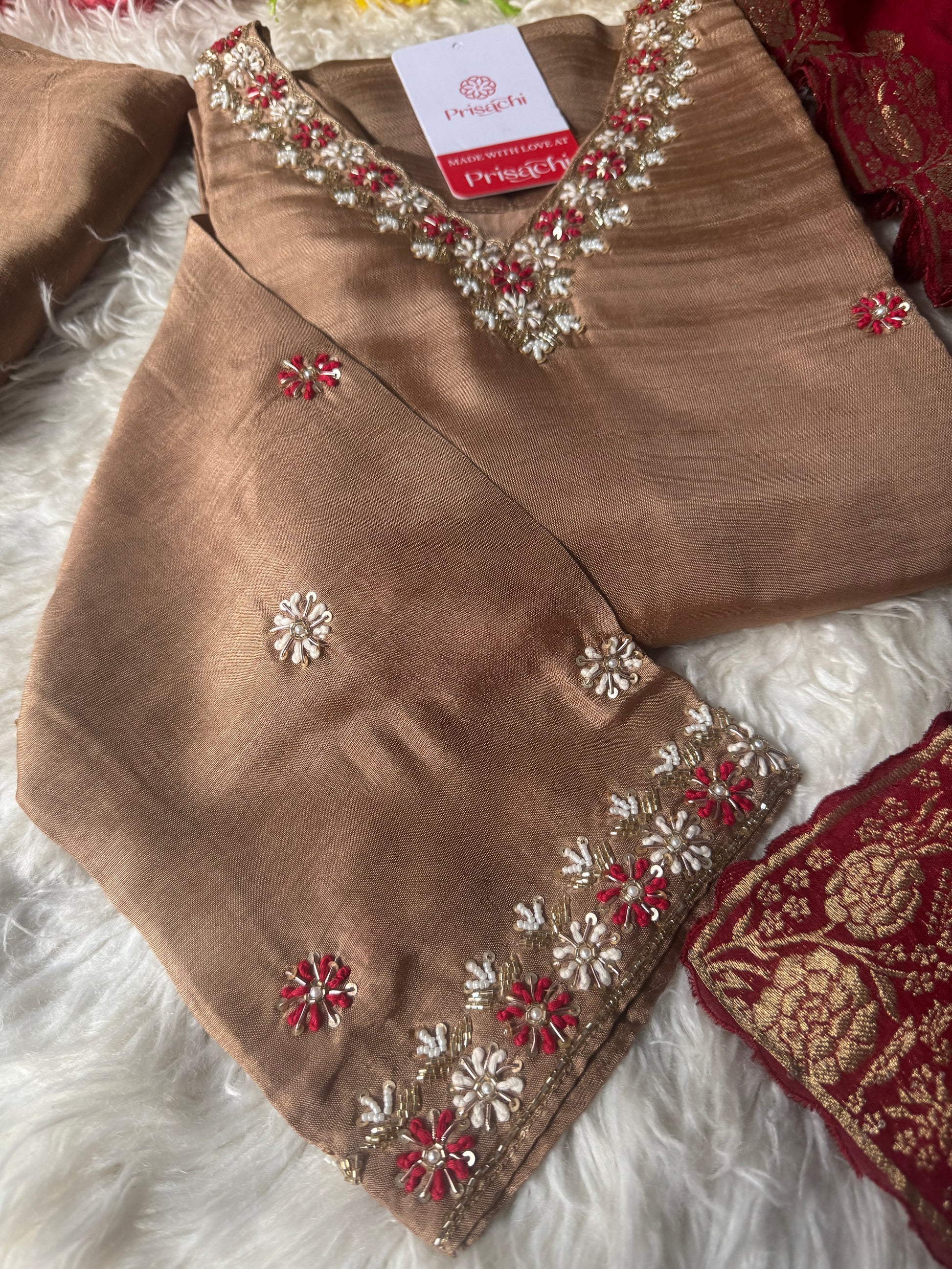 Dazzle in our Designer Kurti Set adorned with Zardosi Work. This ensemble exudes opulence with its intricate detailing and vibrant pink hue. The kurti features exquisite zardosi embroidery, adding a touch of royal elegance. Perfect for special occasions, it promises to captivate attention and leave a lasting impression of sophistication.