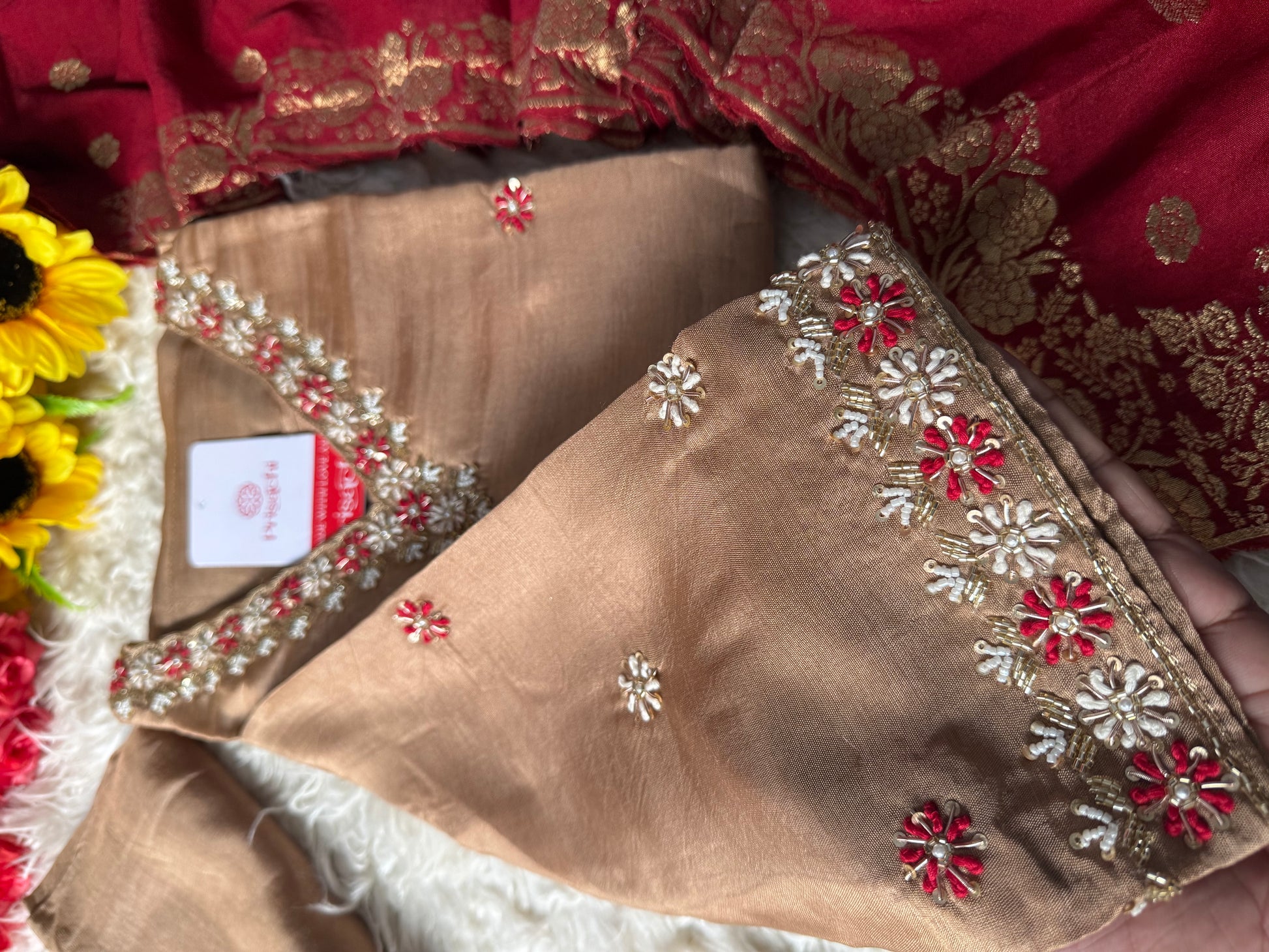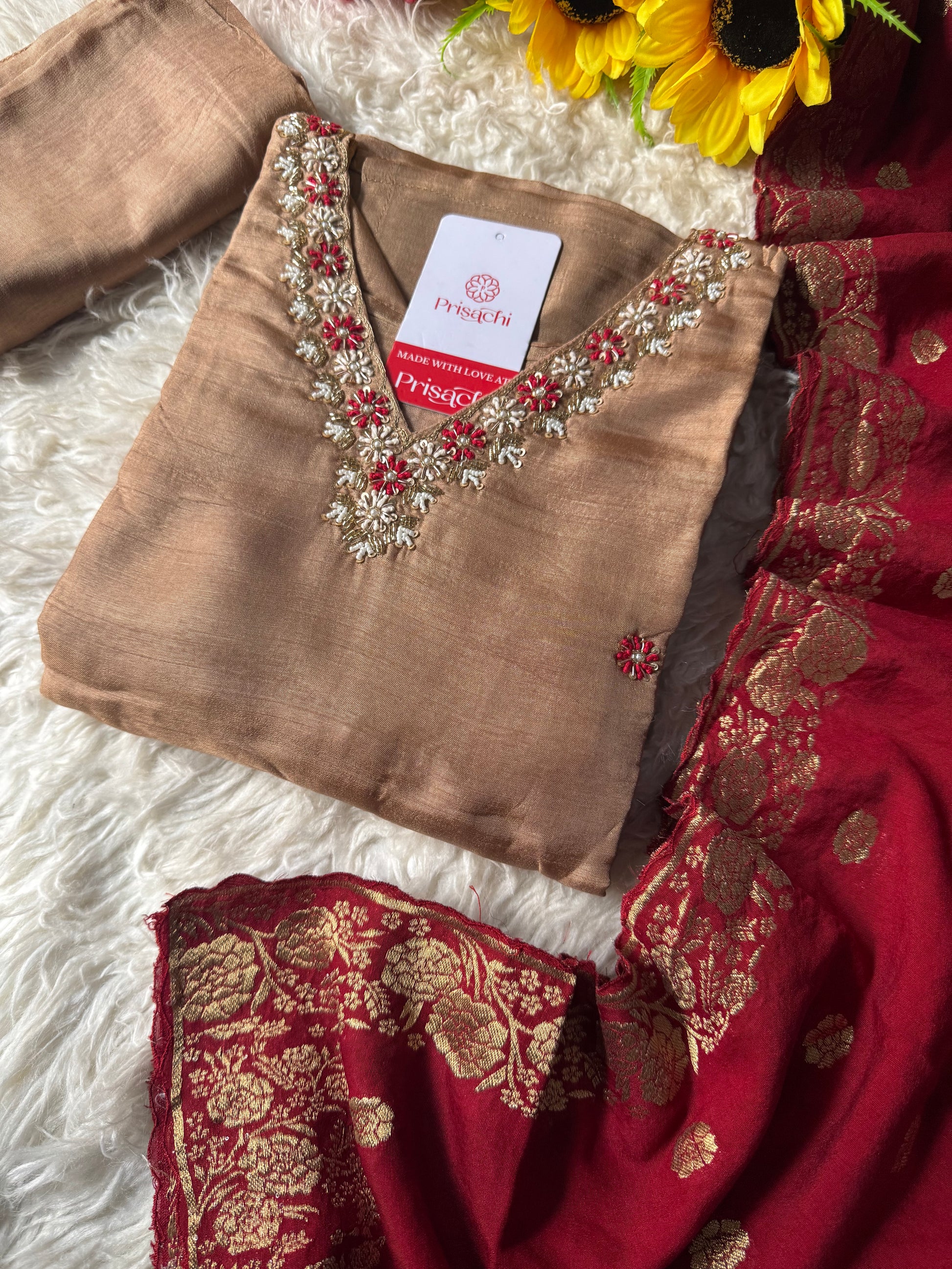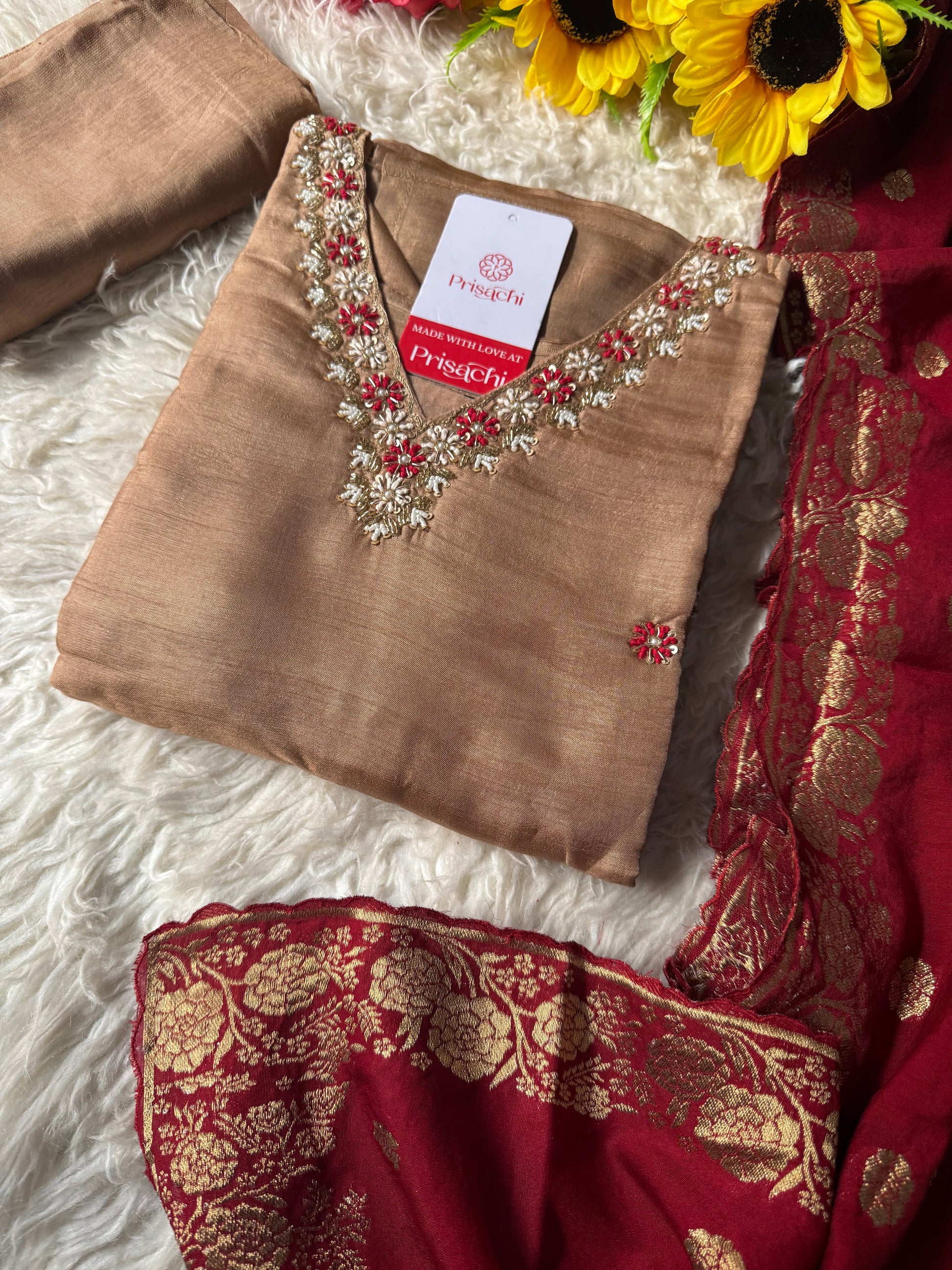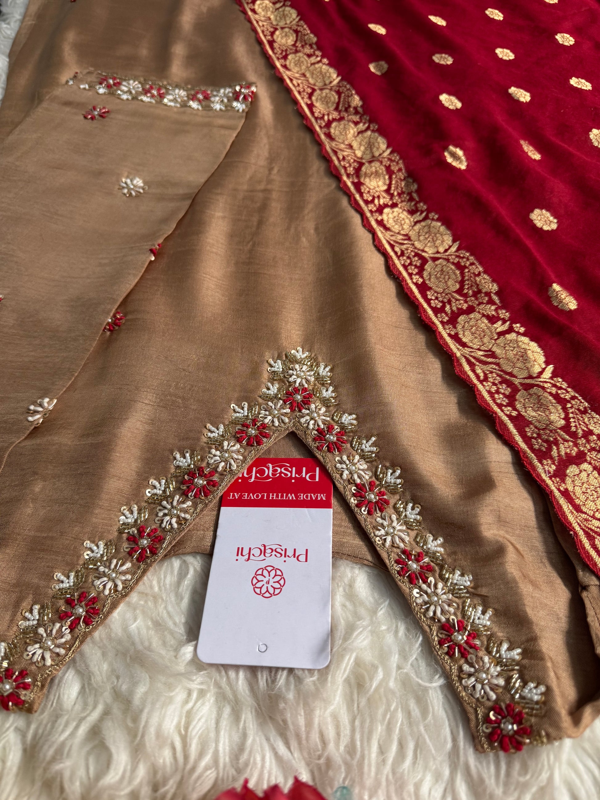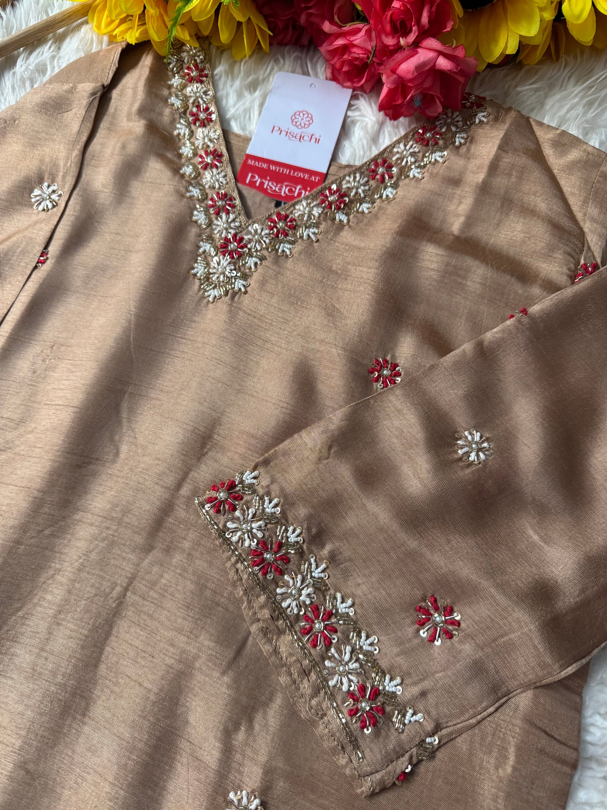 Dazzle in our Designer Kurti Set adorned with Zardosi Work. This ensemble exudes opulence with its intricate detailing and vibrant pink hue. The kurti features exquisite zardosi embroidery, adding a touch of royal elegance. Perfect for special occasions, it promises to captivate attention and leave a lasting impression of sophistication.