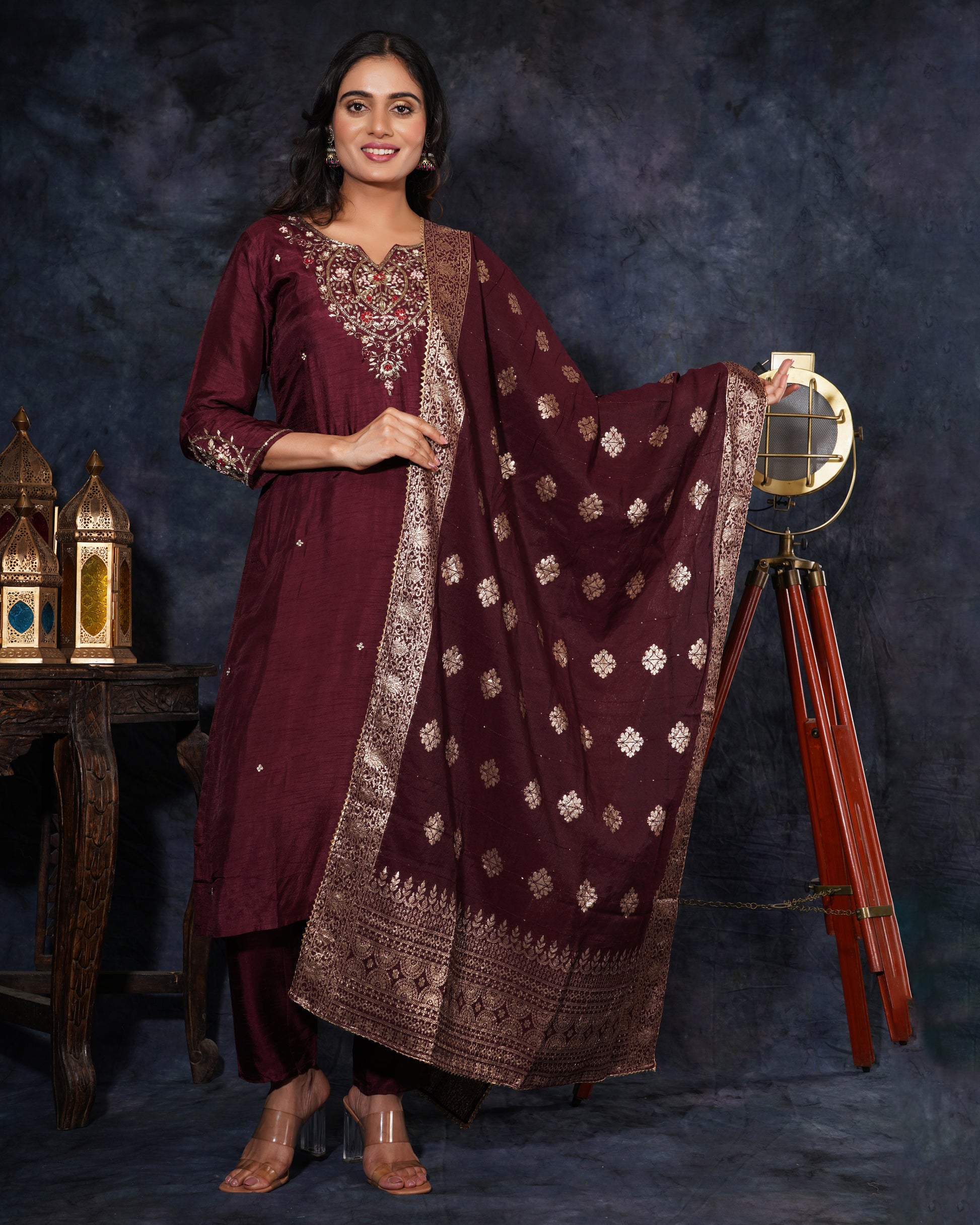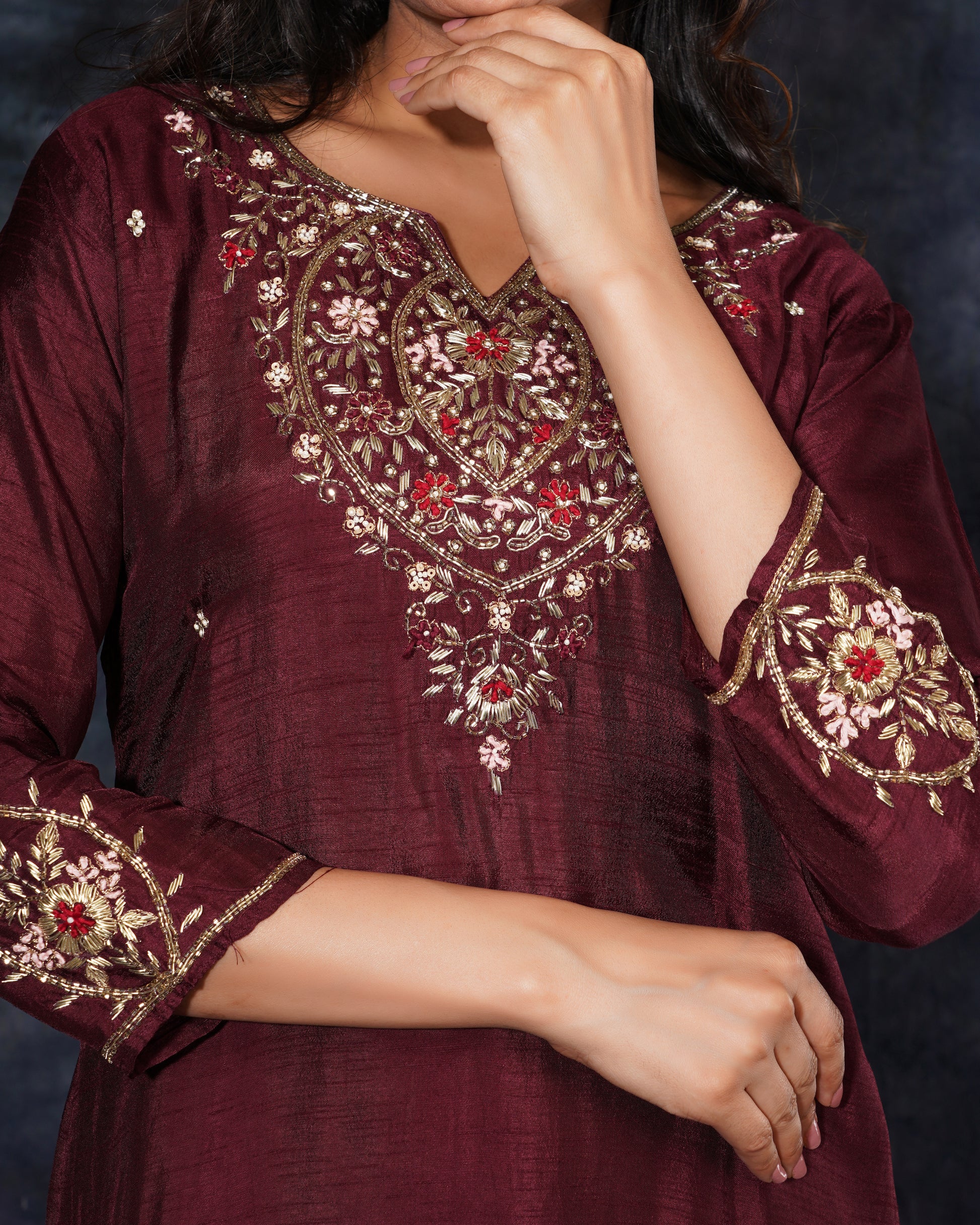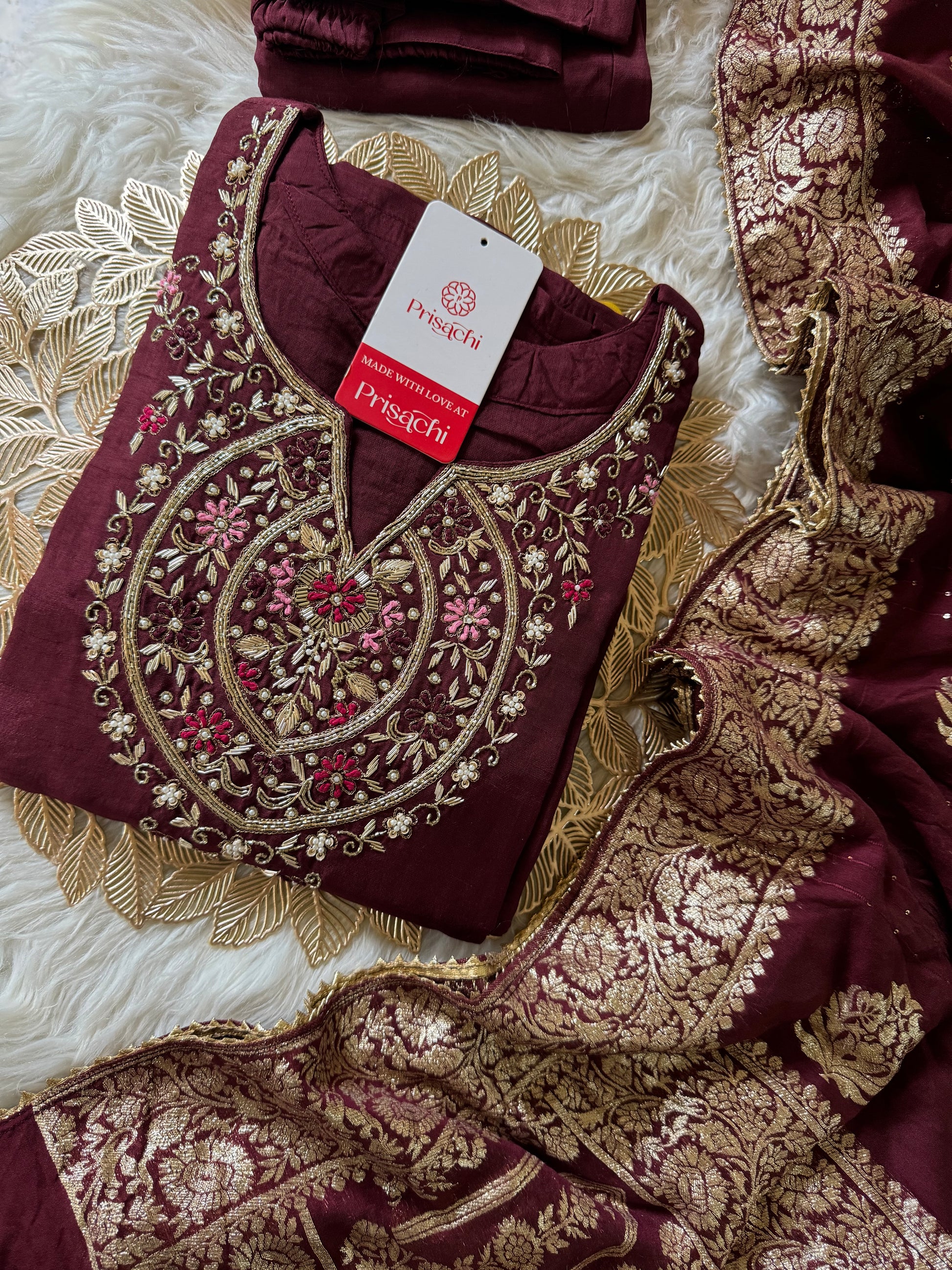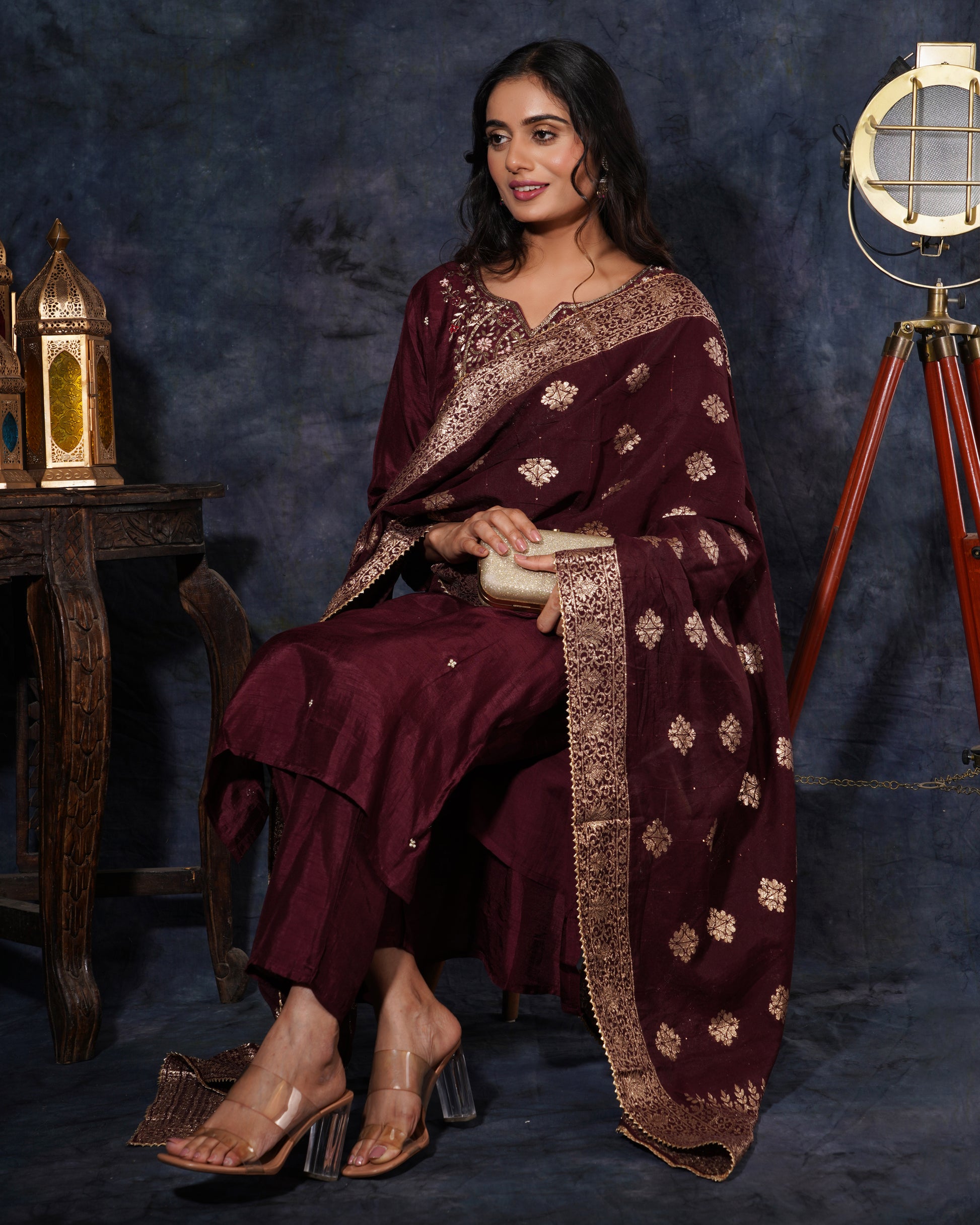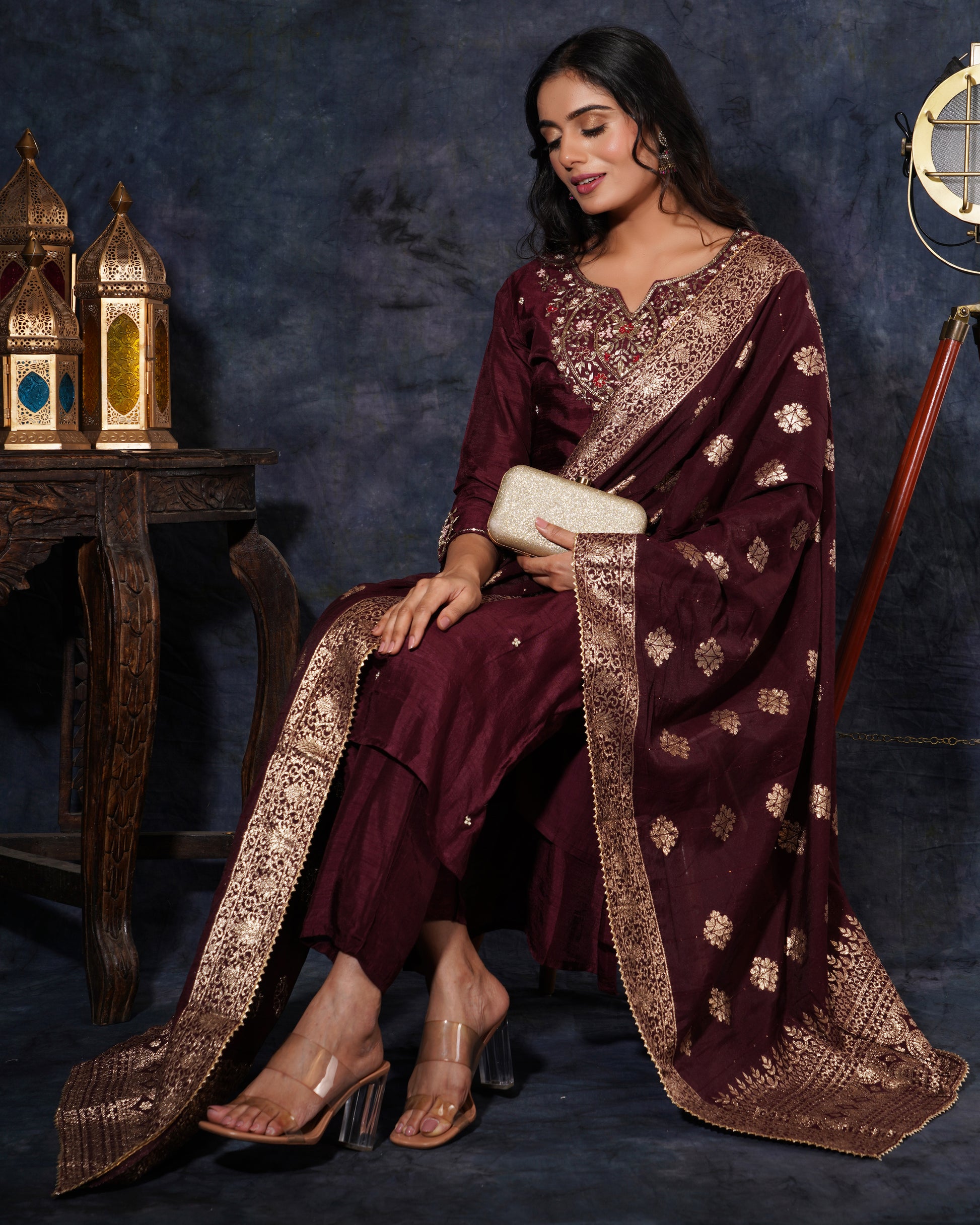 In our brown Hand-Embroidered Kurta Set with Dupatta, exude charm. This gorgeous outfit has painstaking hand embroidery against a delicate peach background. The ensemble, which consists of a kurta, coordinated bottoms, and a gorgeous dupatta, is ideal for formal settings where grace and practicality mingle. Improve your ethnic clothing with ease.