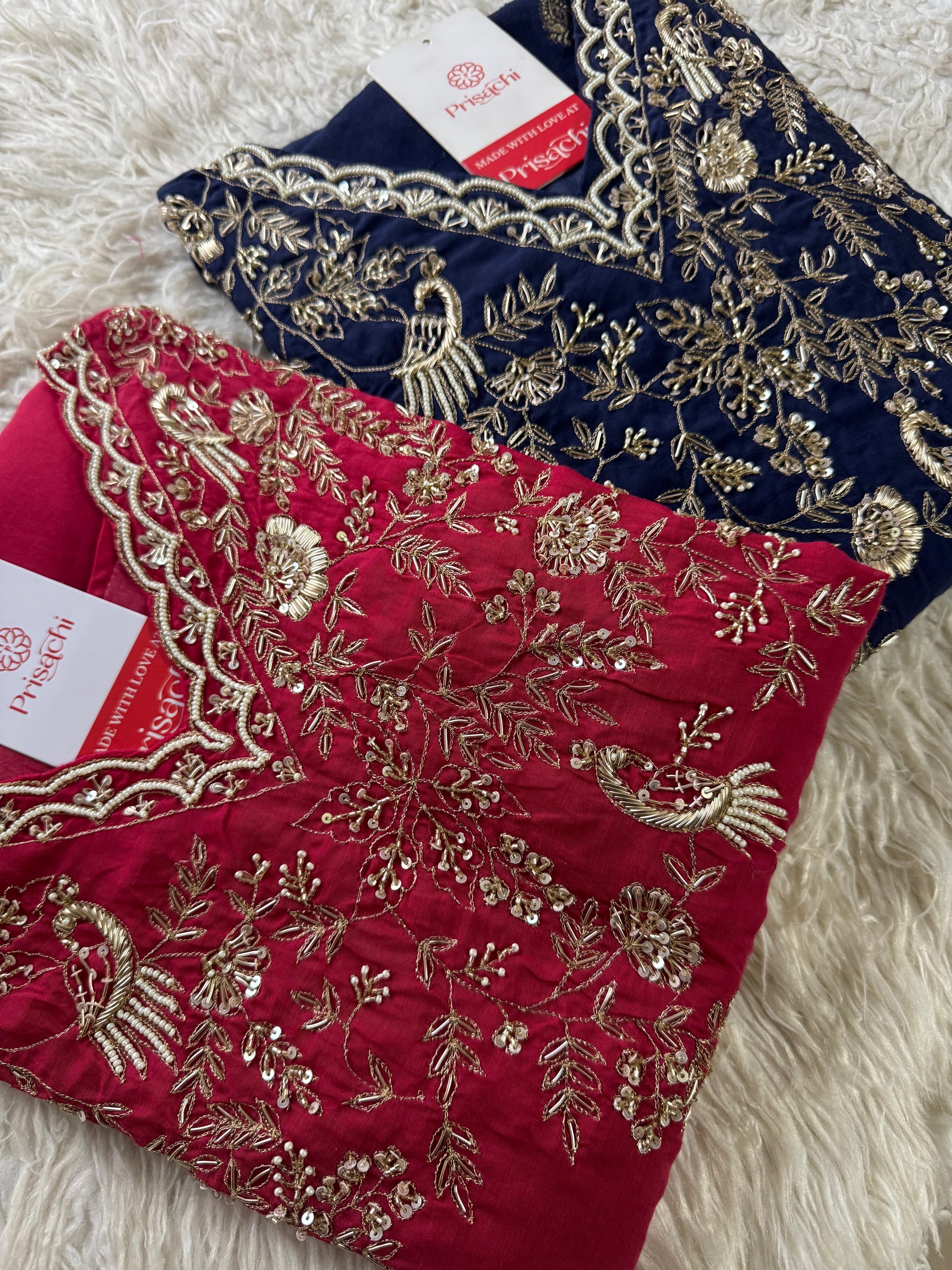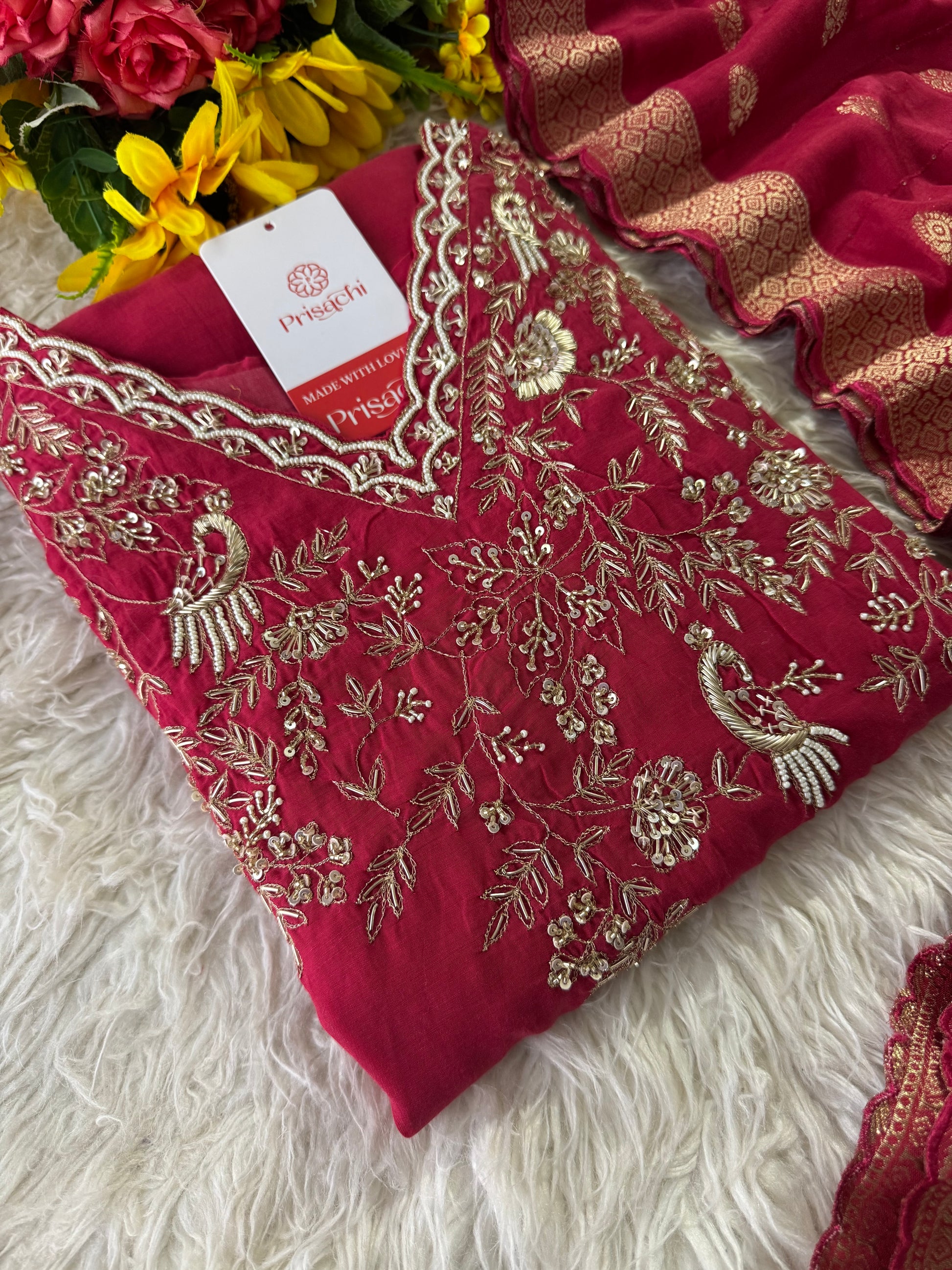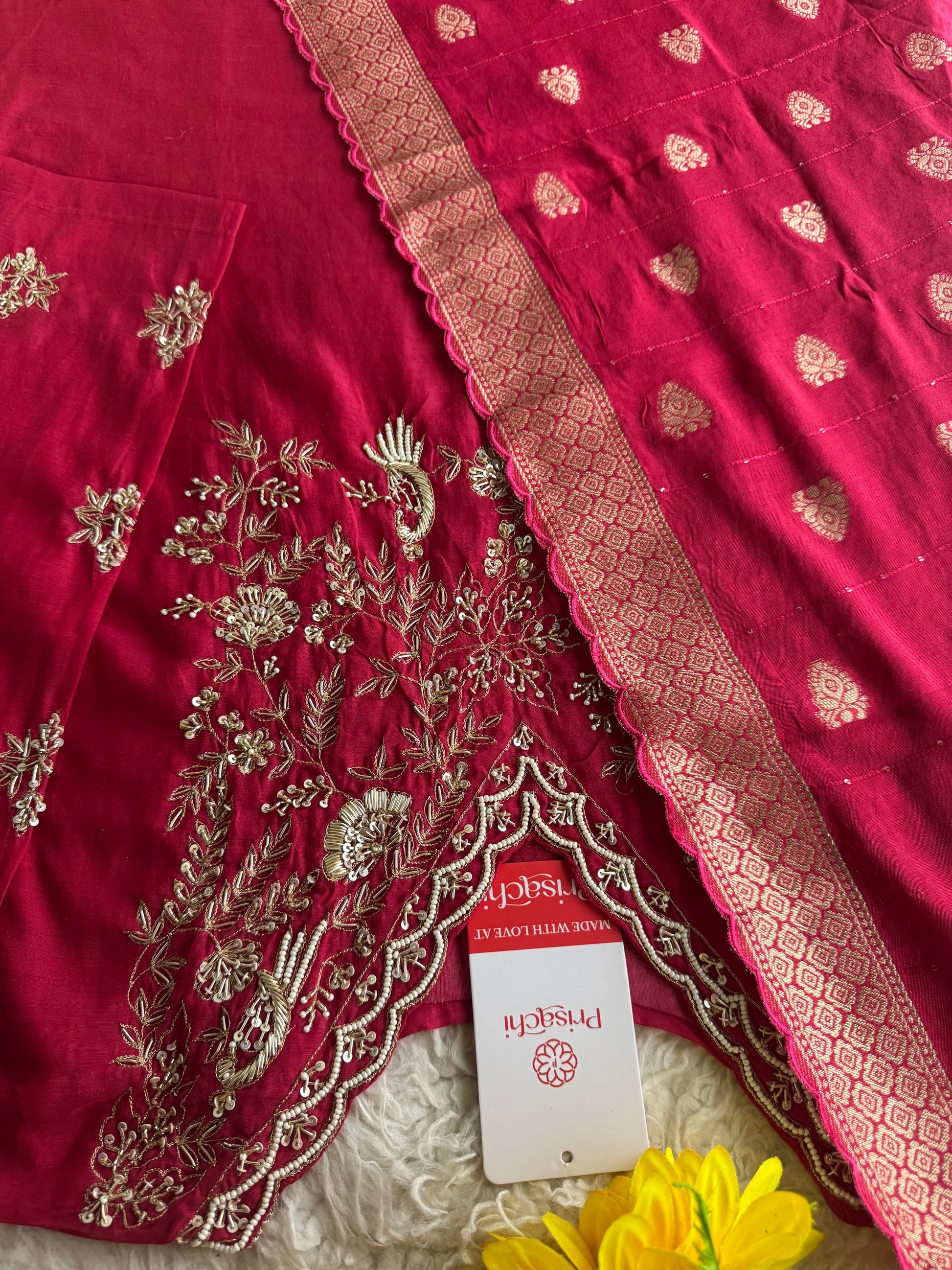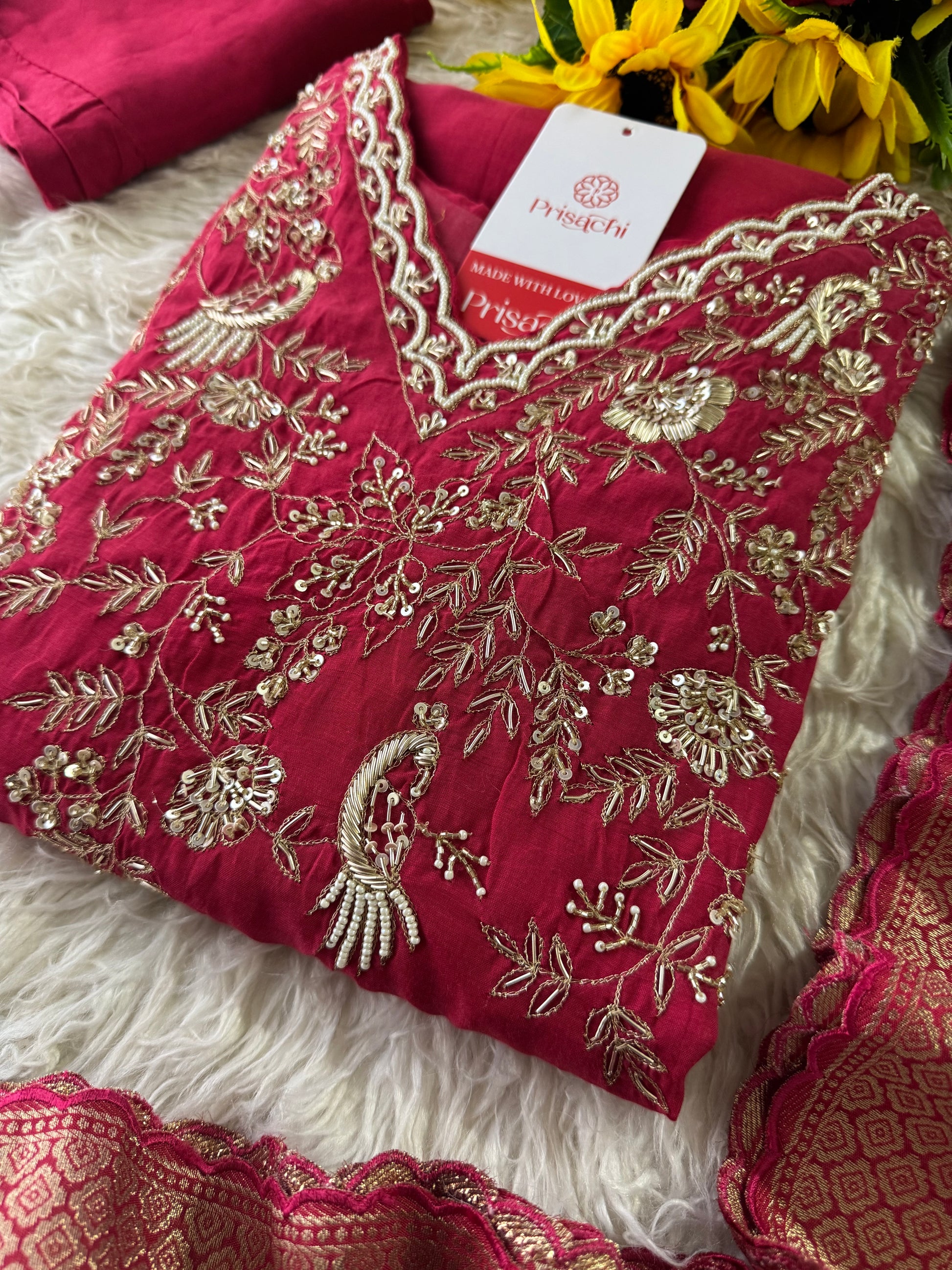 Our Red embroidered kurta set and dupatta will boost your style. Rich blue tones and beautiful embroidery come together in this magnificent outfit to produce a striking and classic look. The set is ideal for trendy and exquisite ethnic wear because it comes with a kurta, matching bottoms, and a lovely dupatta.