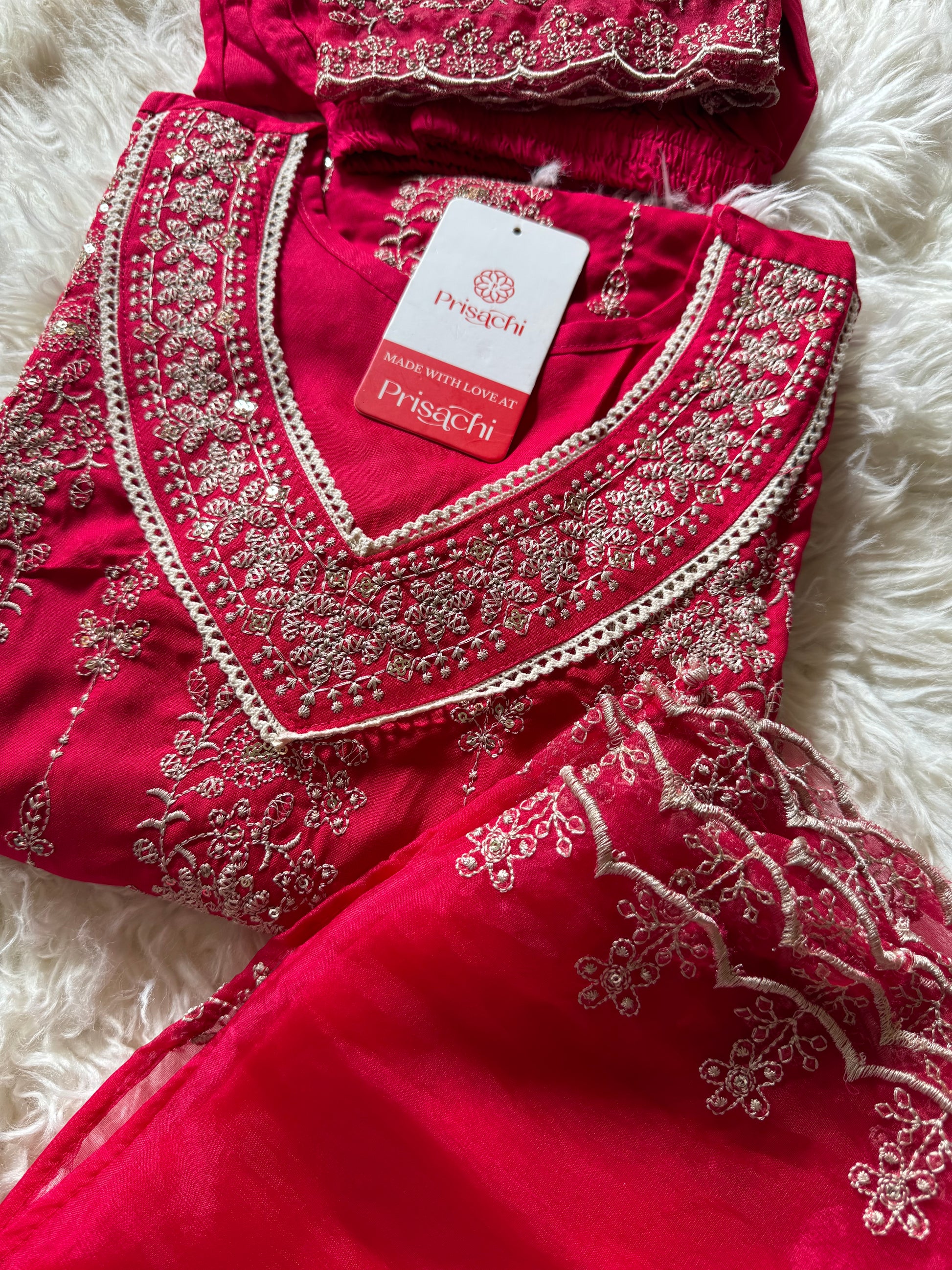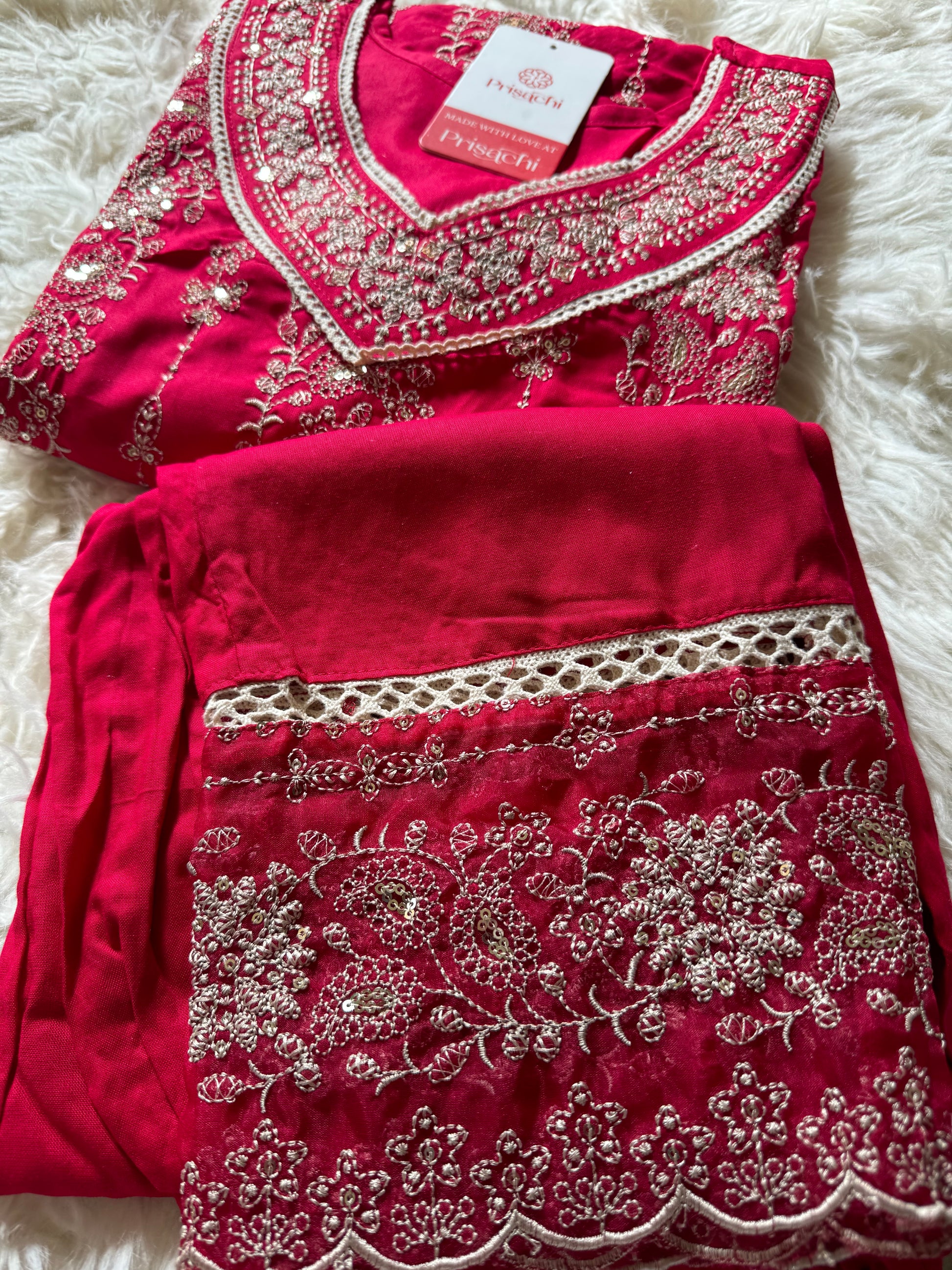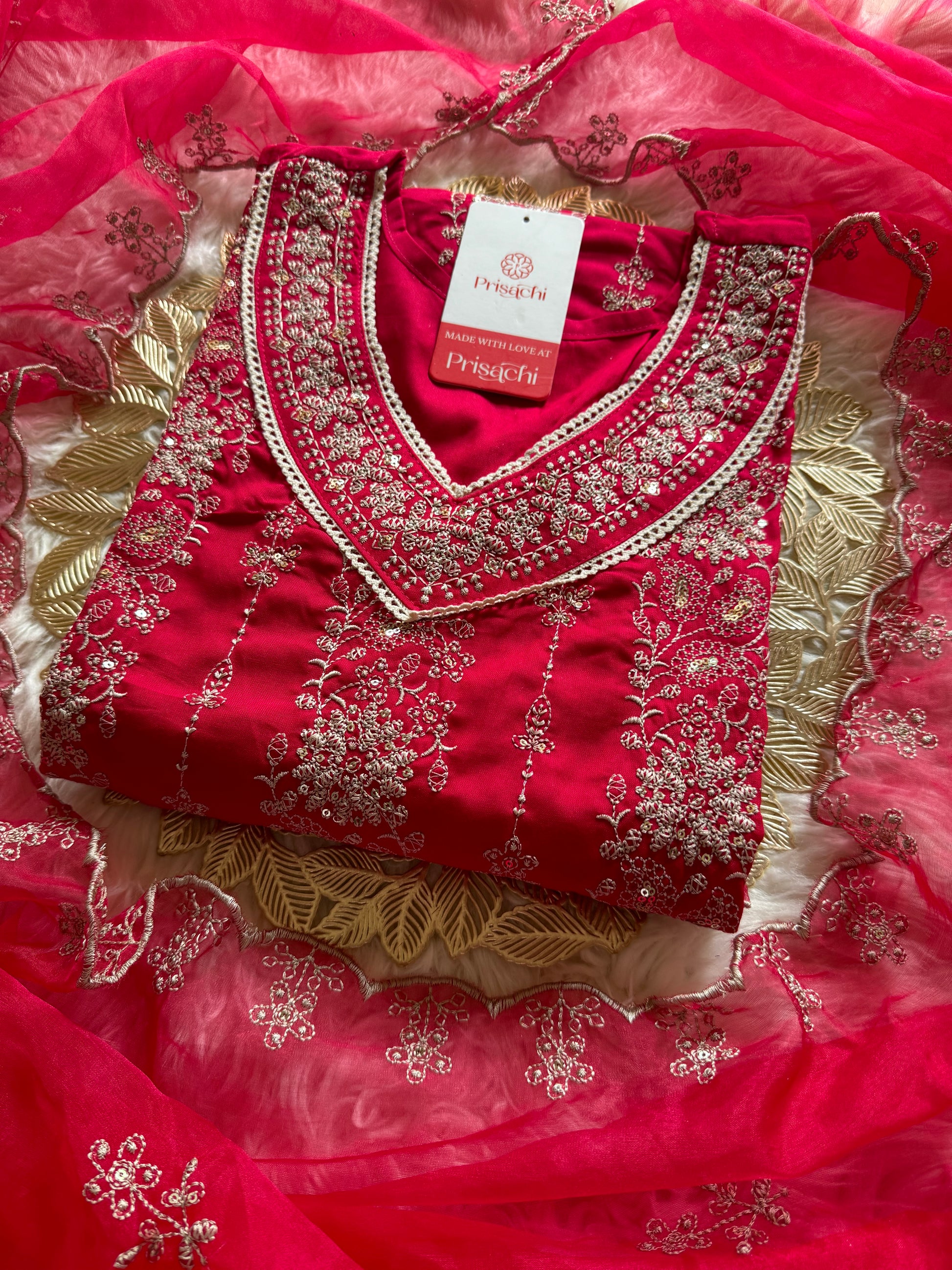 Our Red Embroidered Kurta Set with Dupatta will have you embracing vivid sophistication. The deep crimson color and elaborate embroidery on this outfit exude elegance. It's a versatile option for any event when paired with a coordinating dupatta, providing the ideal fusion of classic charm and modern flair for the style-conscious.