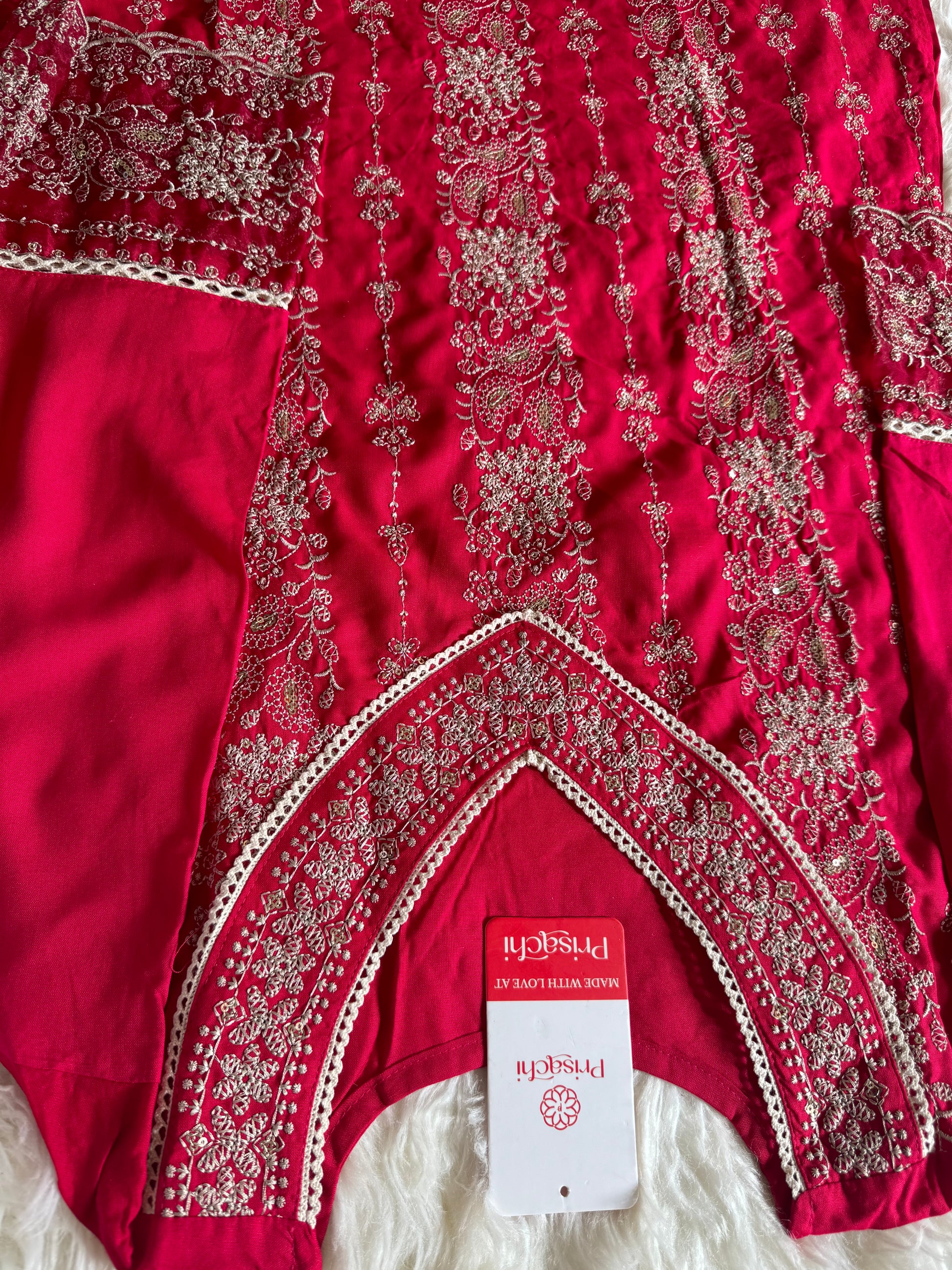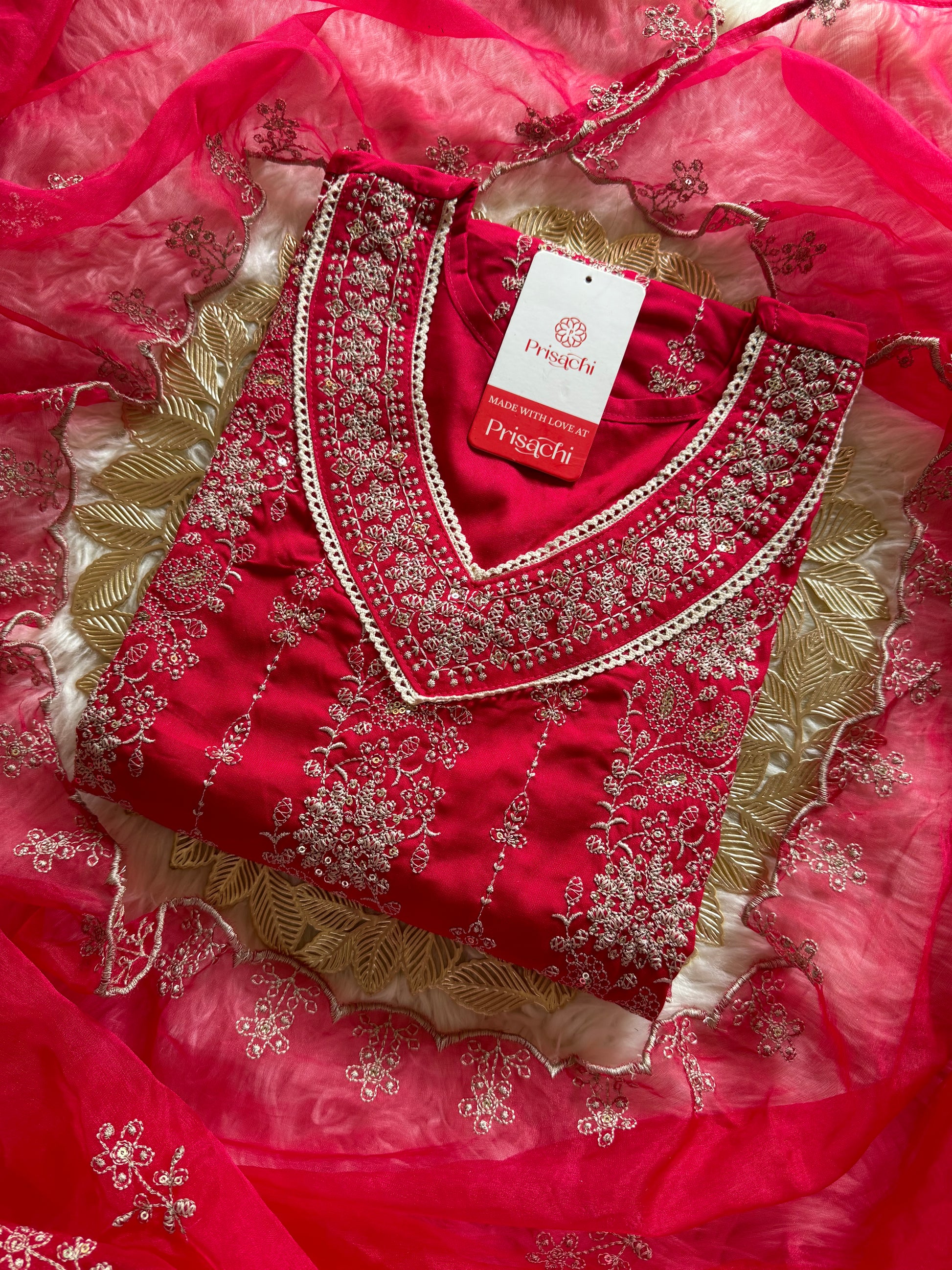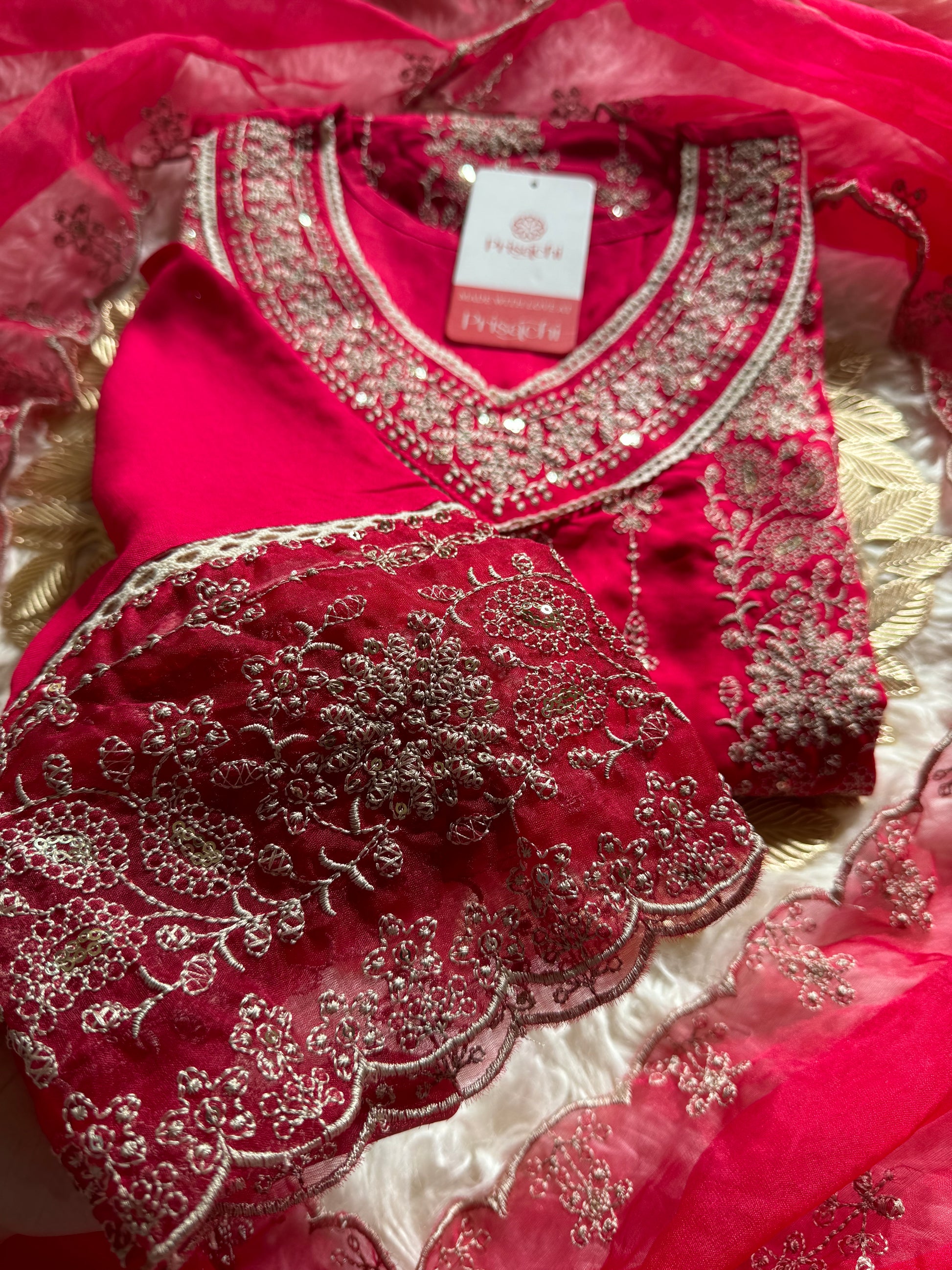 Our Red Embroidered Kurta Set with Dupatta will have you embracing vivid sophistication. The deep crimson color and elaborate embroidery on this outfit exude elegance. It's a versatile option for any event when paired with a coordinating dupatta, providing the ideal fusion of classic charm and modern flair for the style-conscious.