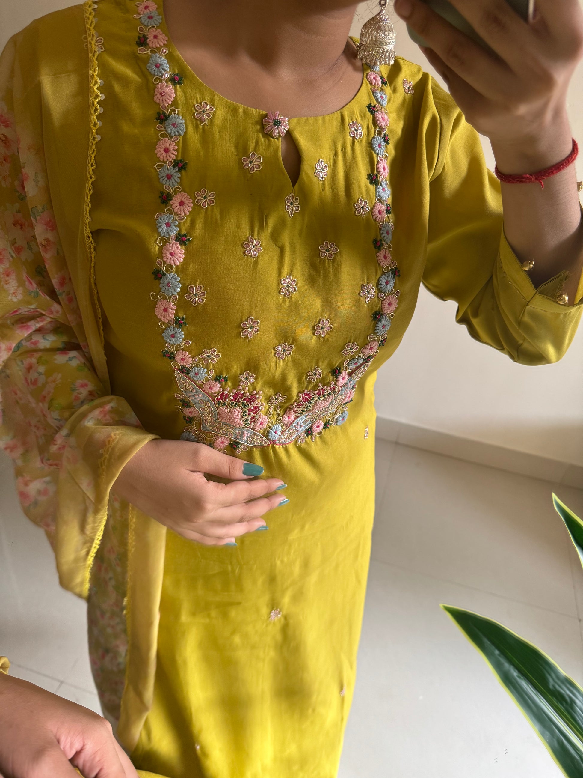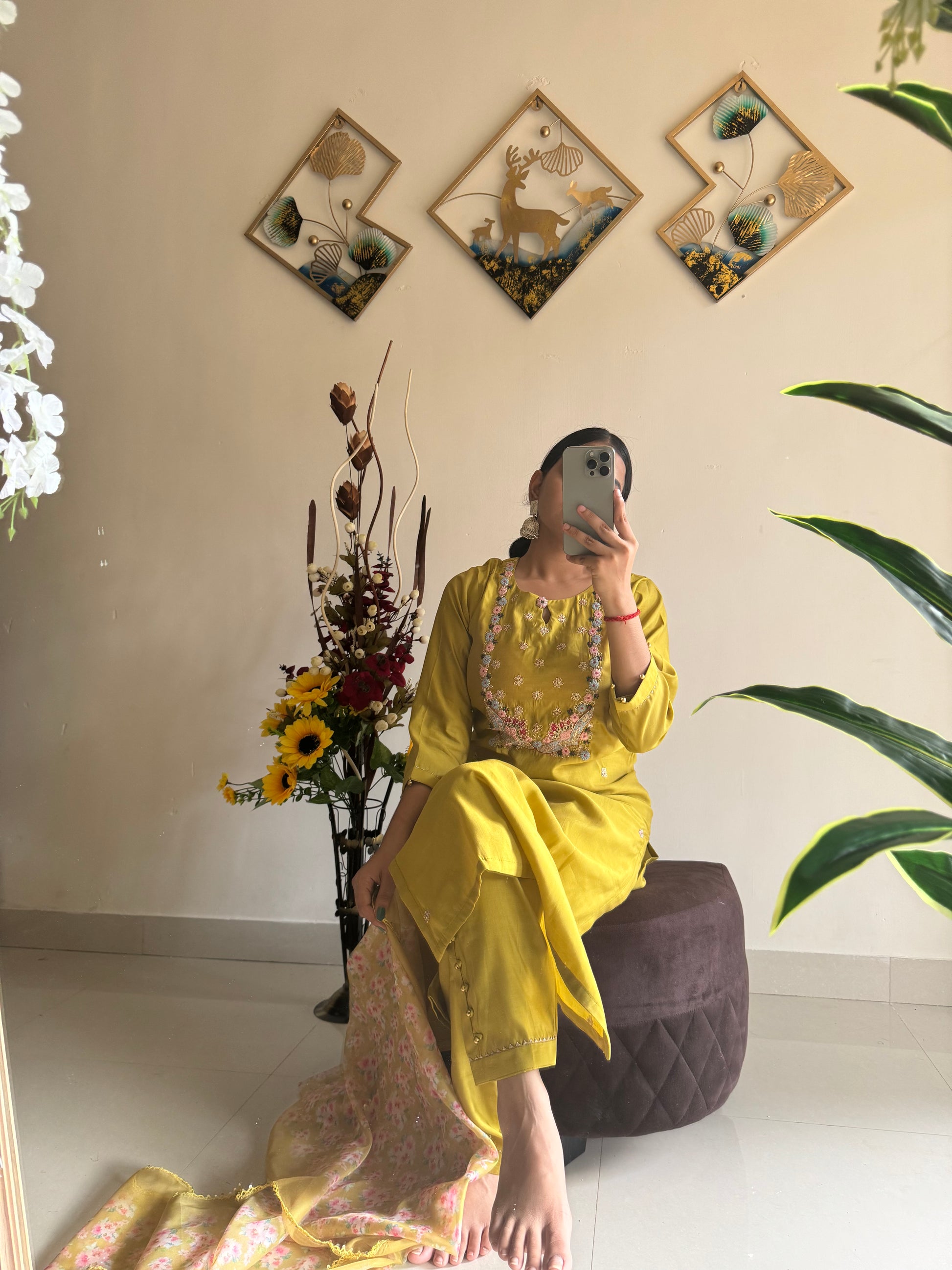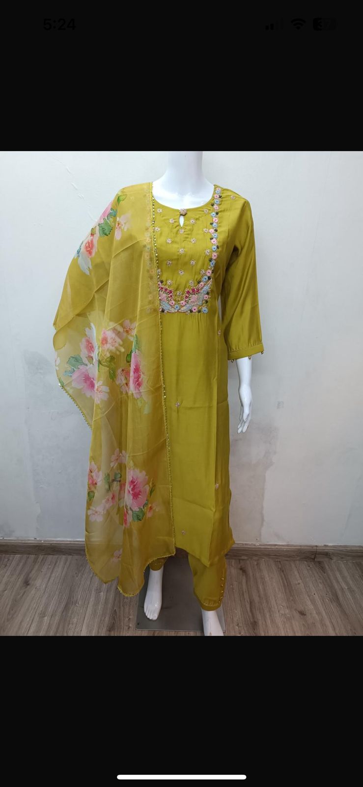 In this Green Embroidered Straight Kurta Set with Dupatta, exude elegance. With its delicate needlework and timeless style, this set perfectly captures the sense of refinement. For those who appreciate sophisticated ethnic fashion, this piece is a must-have because of the lush green color's refreshing addition and the way the matching dupatta completes the ensemble.