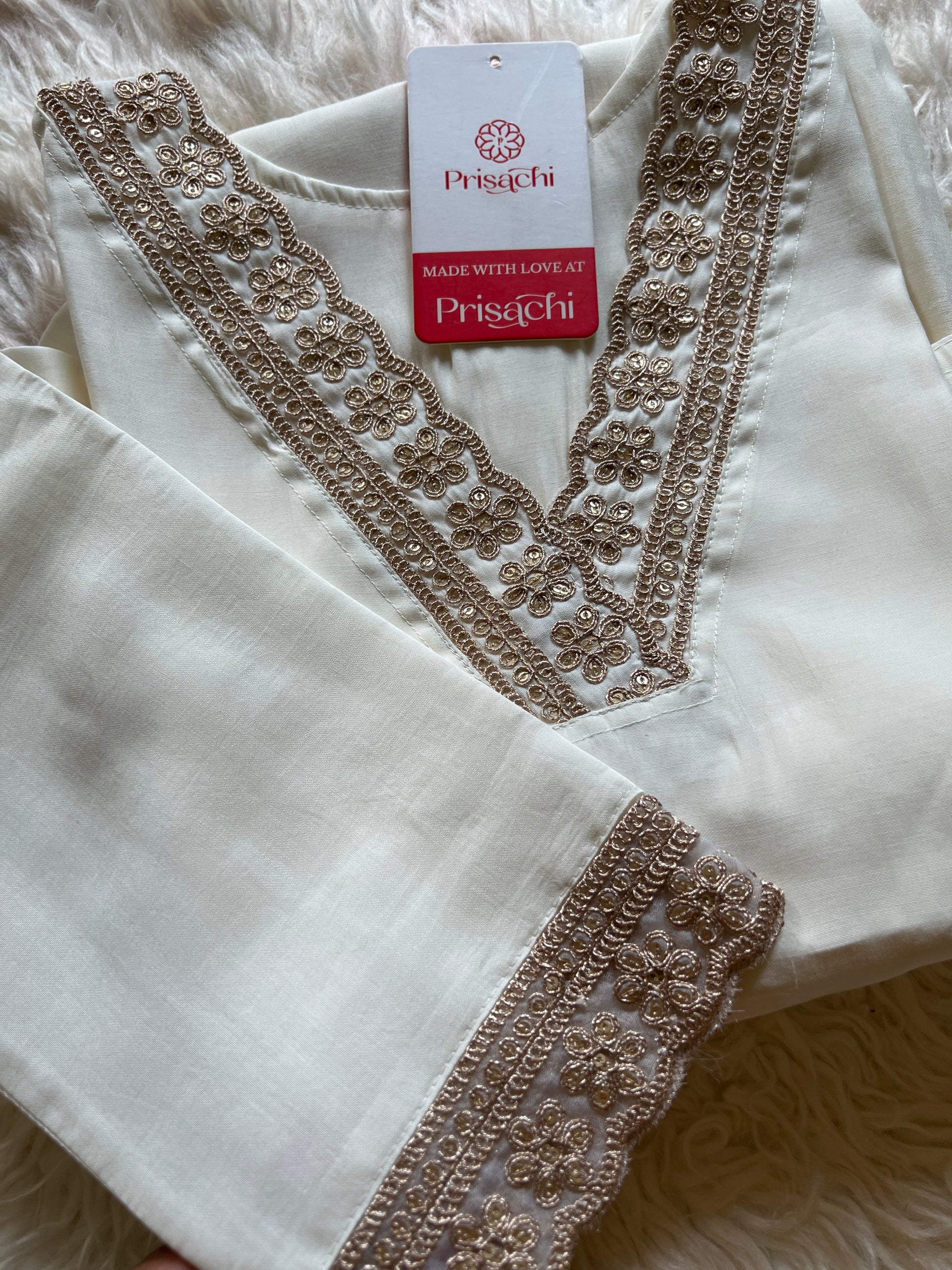With our Off-White Lilac Silk Kurta Set with Mary Pink Dupatta, you can exude refinement. The bright dupatta perfectly complements the exquisite craftsmanship on the opulent silk kurta. This suit creates a timeless and stylish look for your important occasions by skillfully fusing elegance and grandeur. Wearing this combination, redefine your ethnic allure.