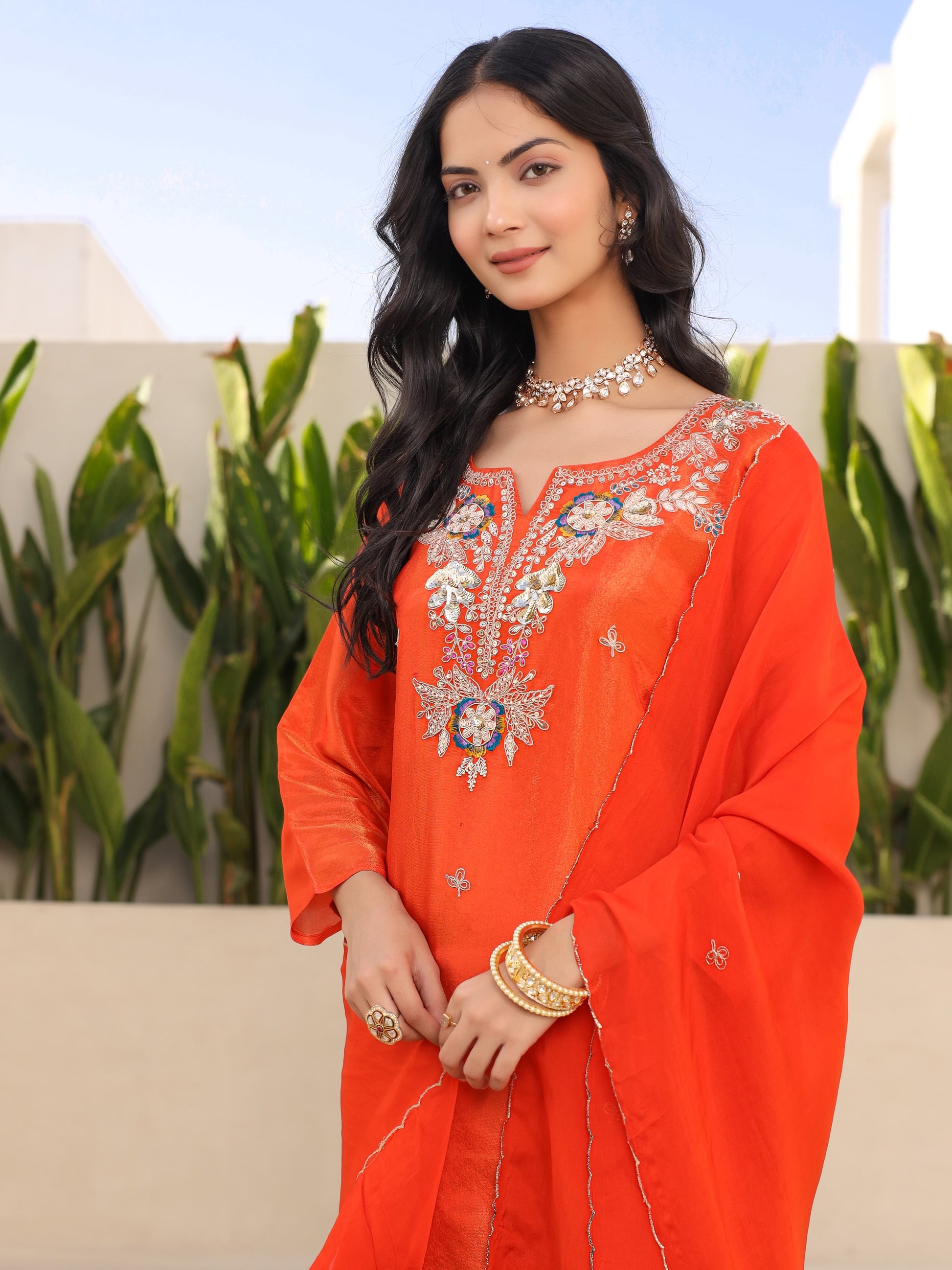 With its elaborate Zardosi embroidery, our orange embroidered Kurta set with dupatta will brighten up any outfit. This colorful costume, which combines rich orange colors with lavish embroidery, exudes elegance and tradition. With the kurta, bottoms, and opulent dupatta included in the set, you can look elegant and regal at any event.