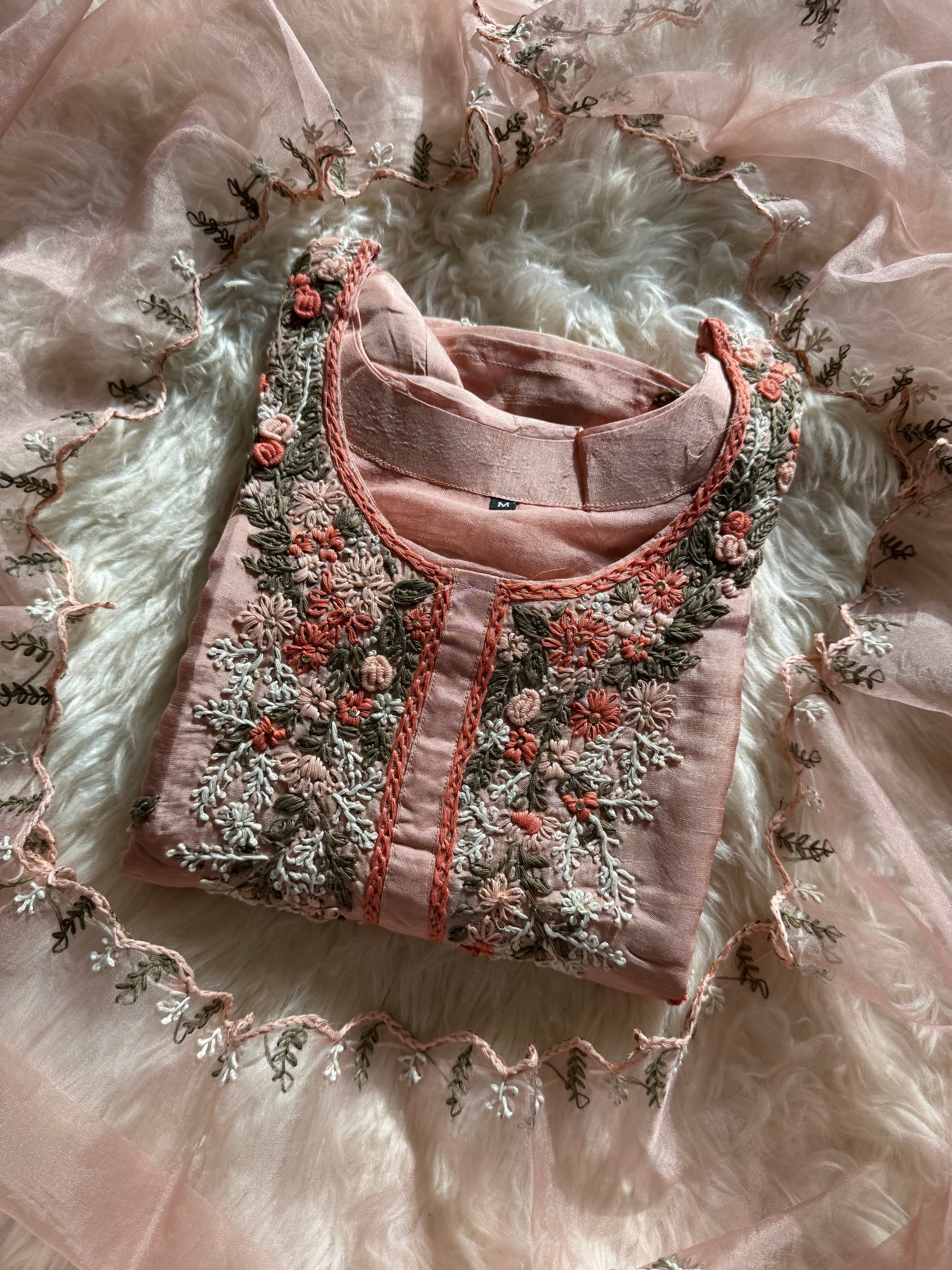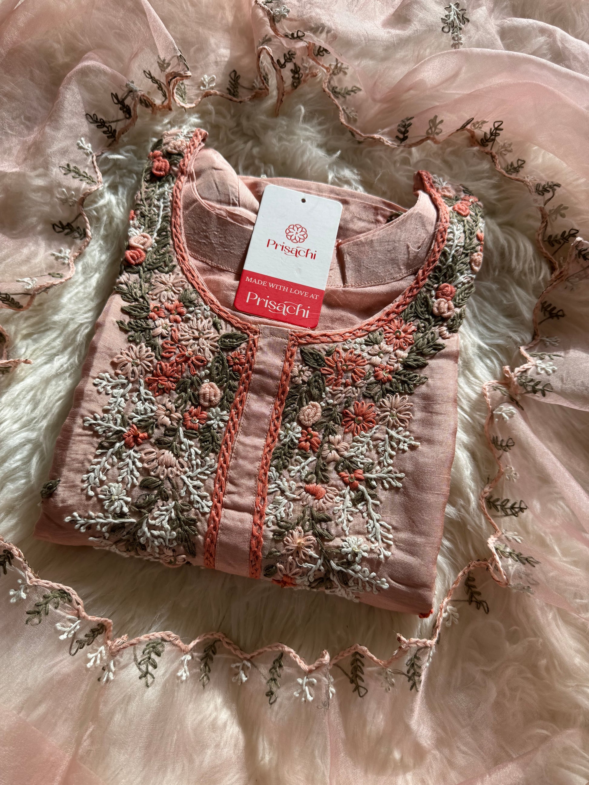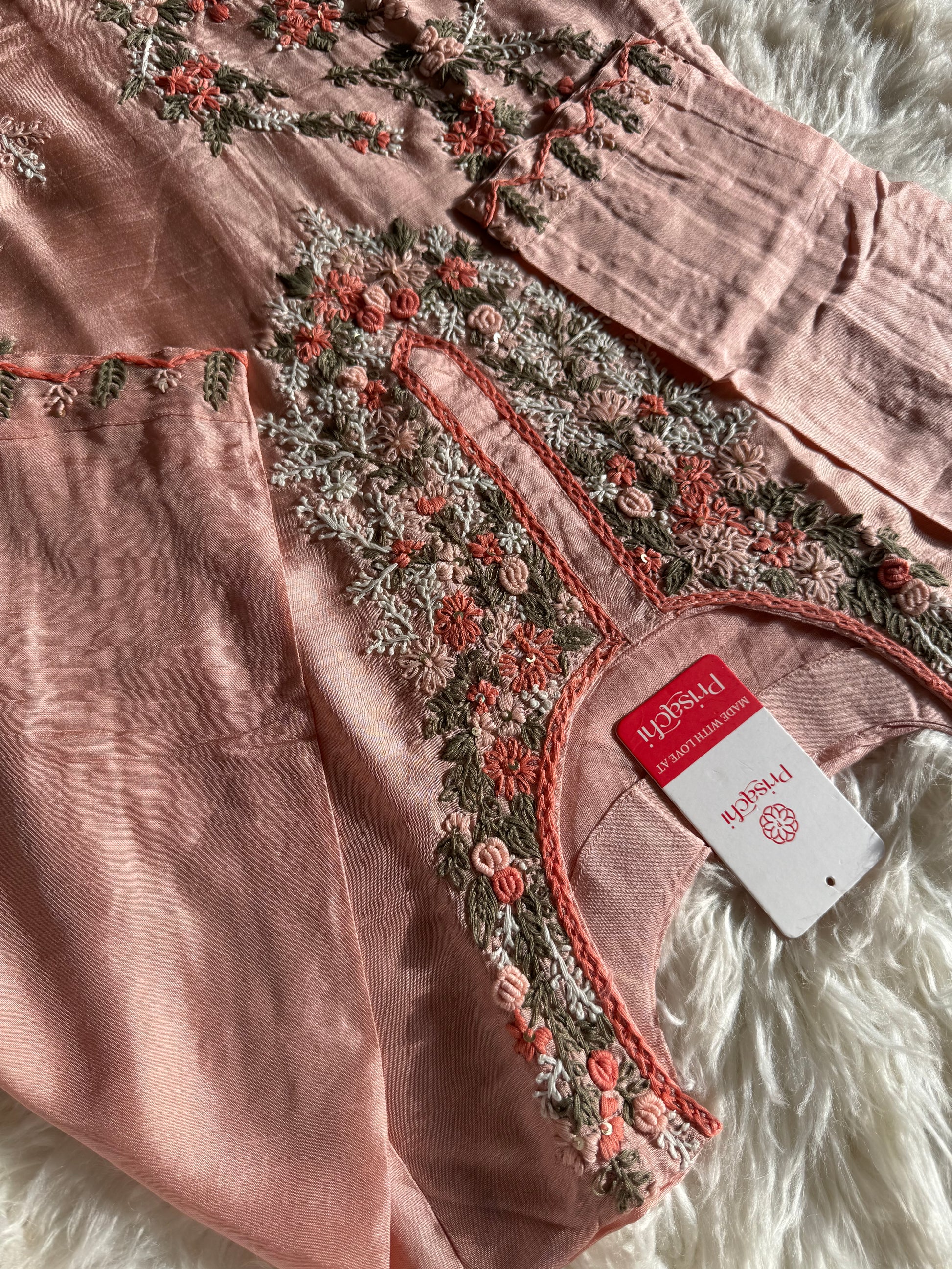 Our Peach Embroidered Kurta Set with Dupatta will enhance your ethnic look. The elegant and charming color of the soothing peach, which is embellished with detailed embroidery. This set, which consists of a kurta, bottoms, and dupatta, is a stylish and adaptable option for any formal event or festive gathering.
