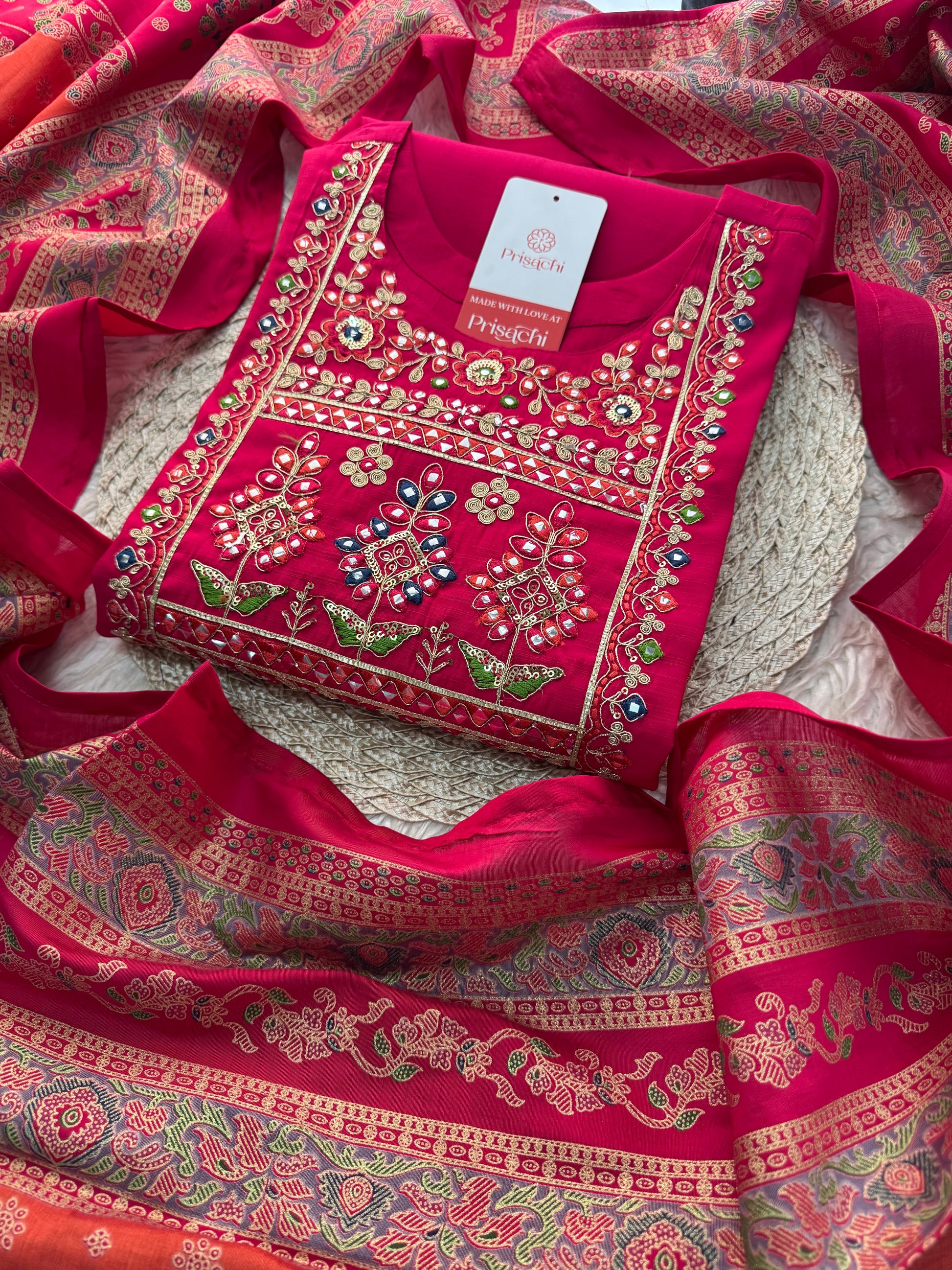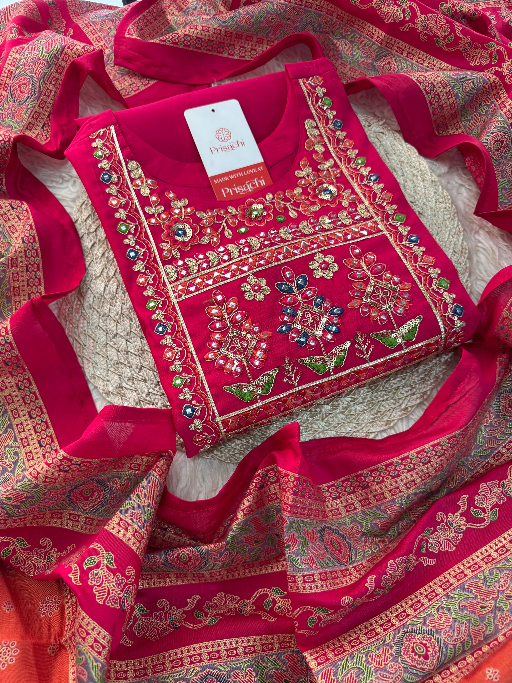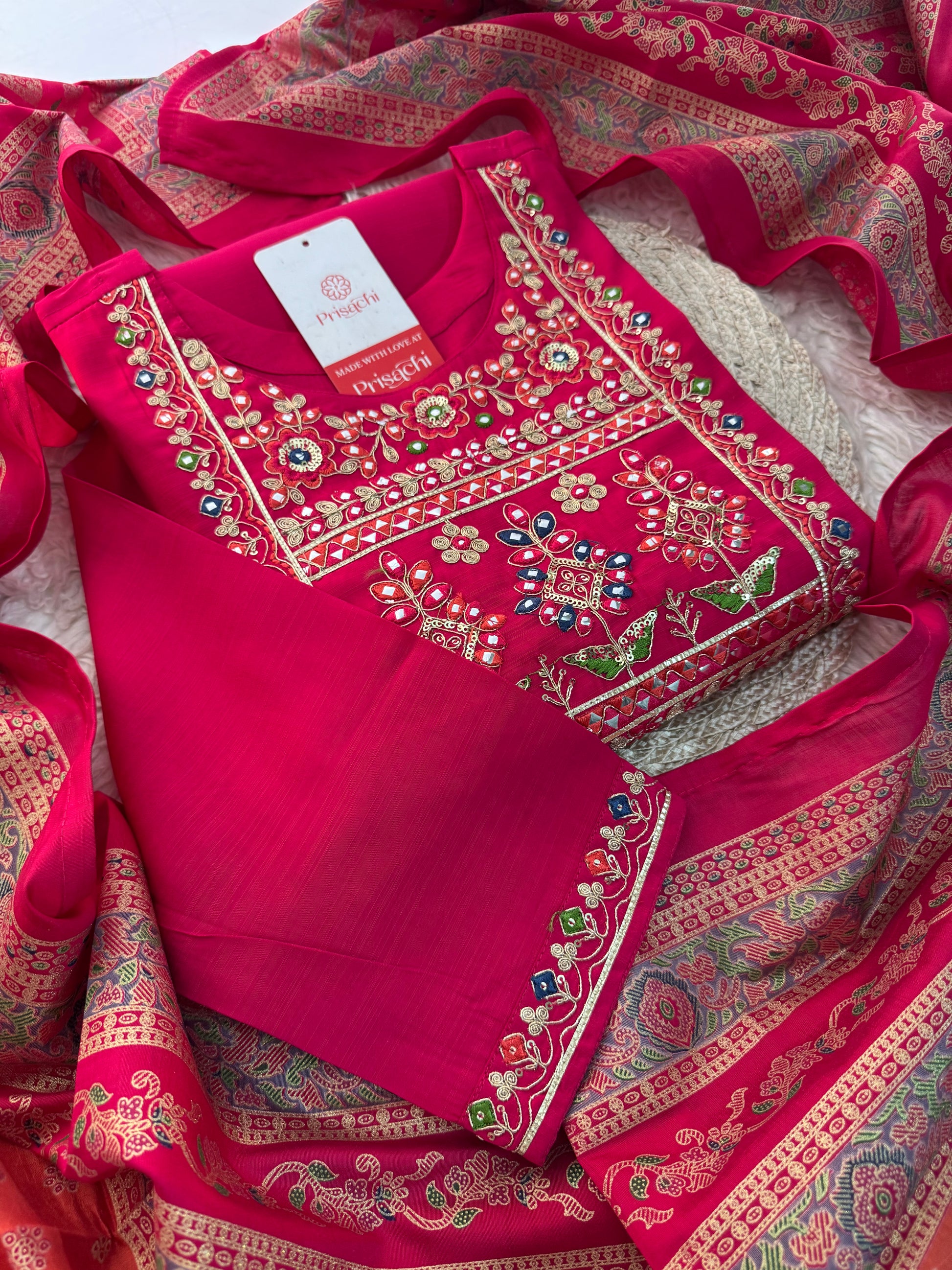 Our Pink embroidered kurta set and dupatta will boost your style. Rich blue tones and beautiful embroidery come together in this magnificent outfit to produce a striking and classic look. The set is ideal for trendy and exquisite ethnic wear because it comes with a kurta, matching bottoms, and a lovely dupatta.
