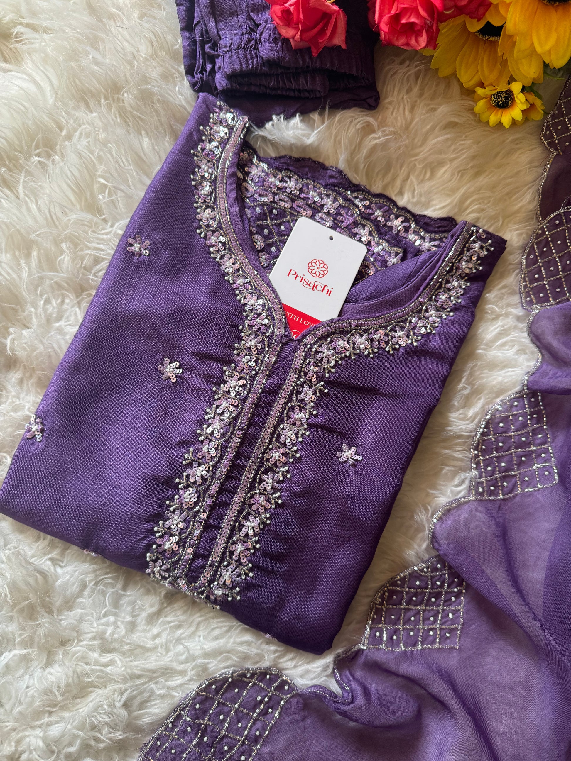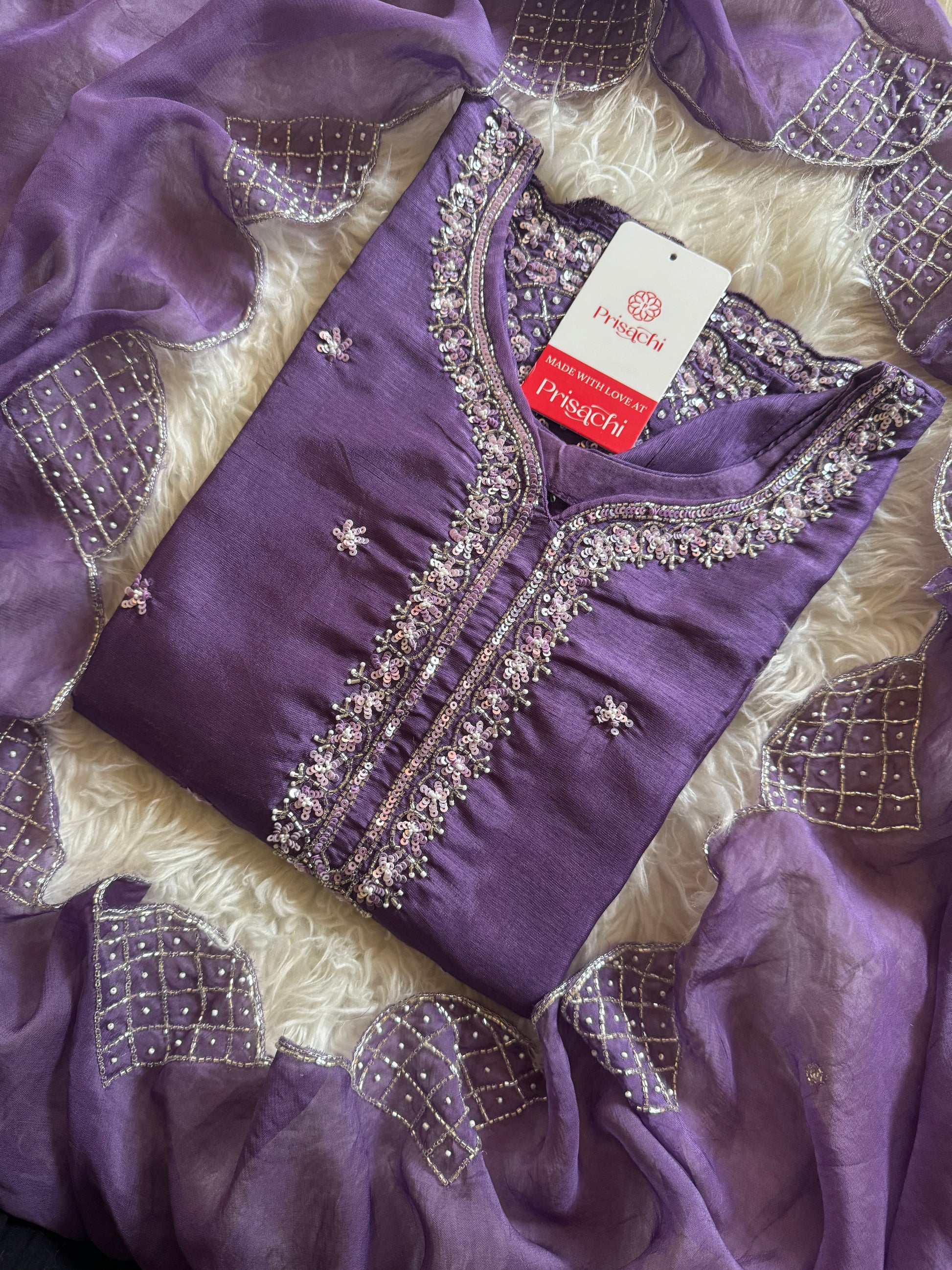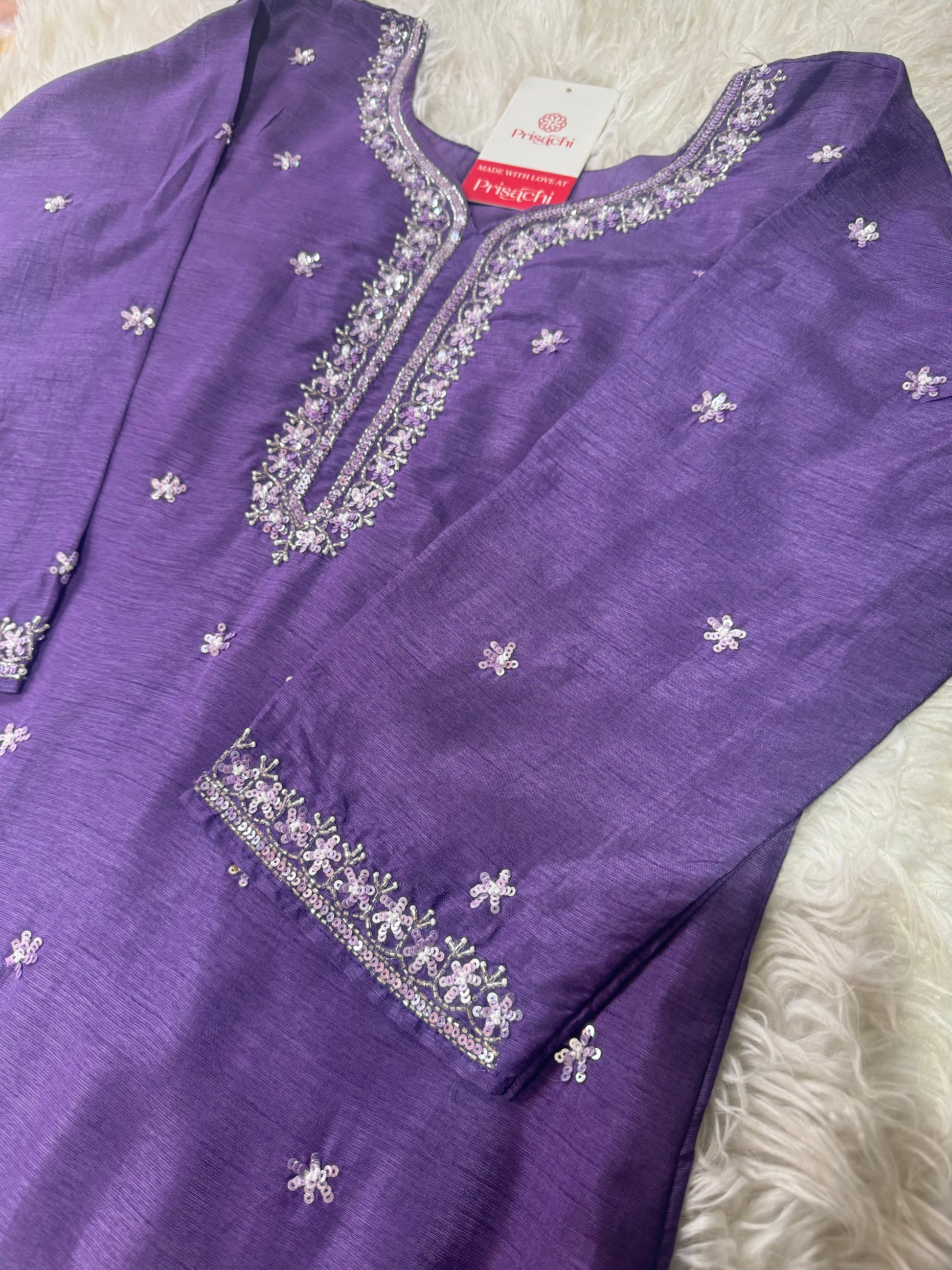 Shine with our Dupatta and purple Neck-Embroidered Kurta Set. The elaborate embroidery embellishing the collar of this dress exudes feminine beauty. The set comes with a chic kurta, matching pants, and a dupatta in a pretty purple color. This beautiful and adaptable ensemble will add flair to your ethnic wardrobe for any occasion.