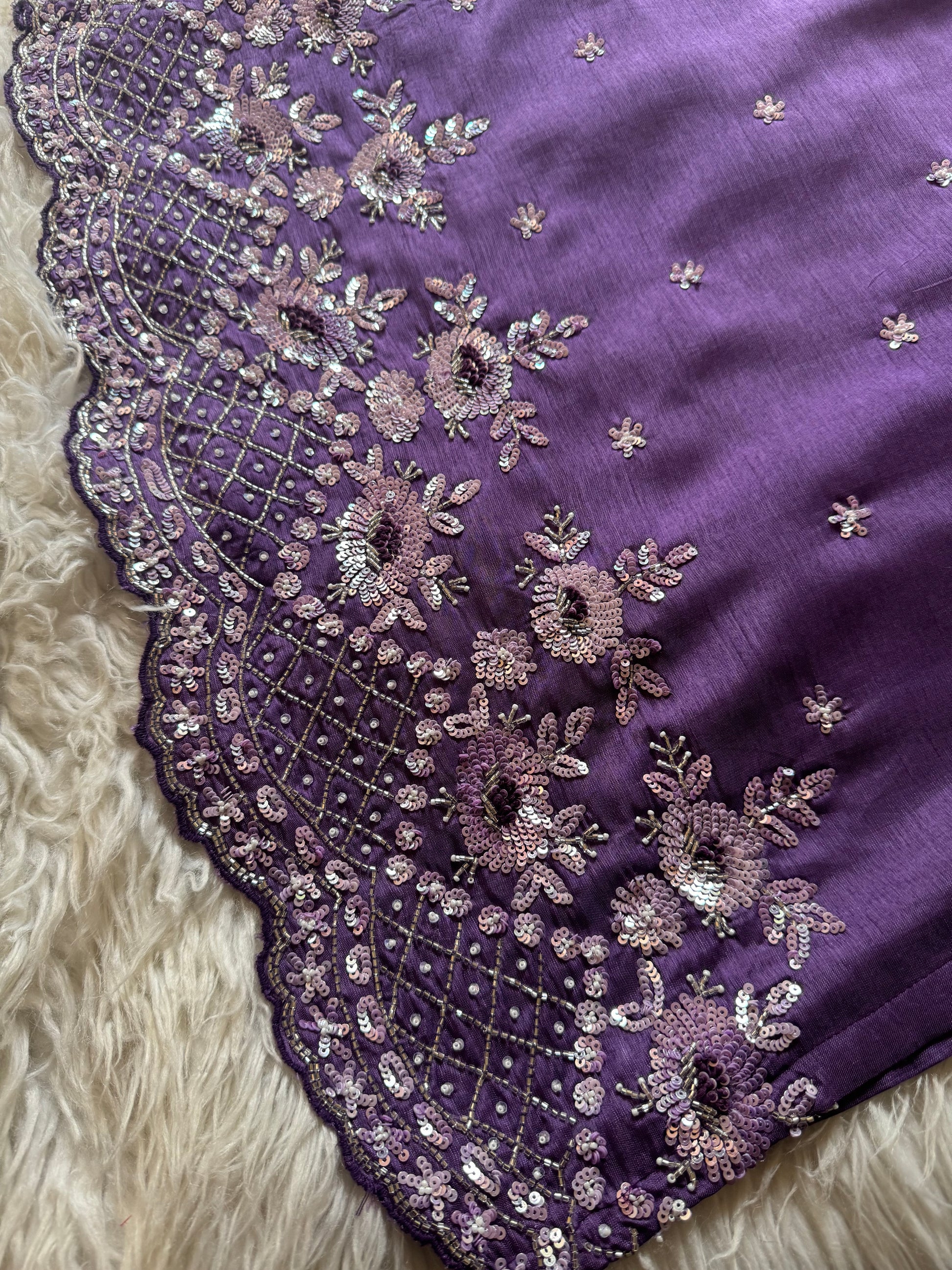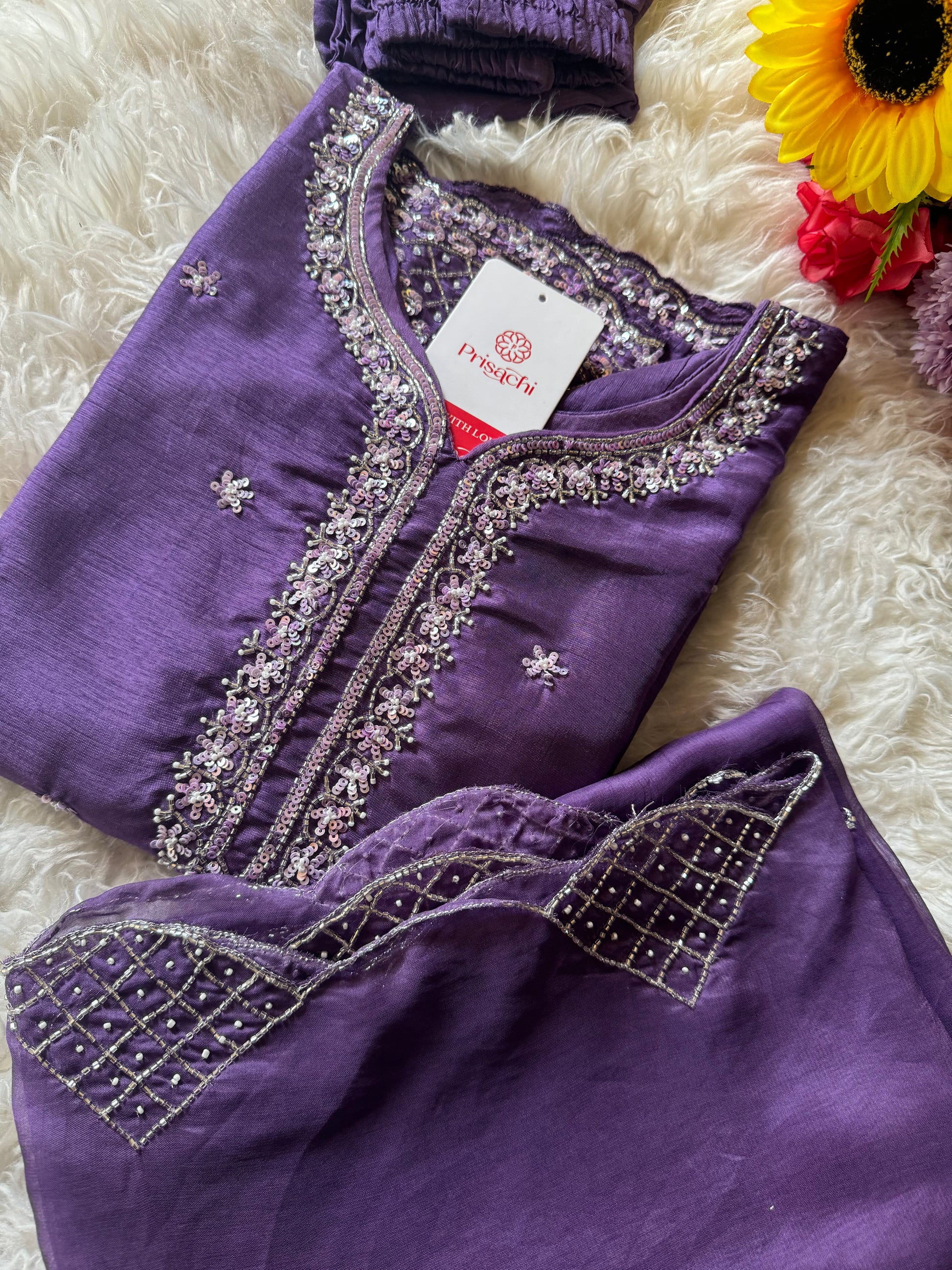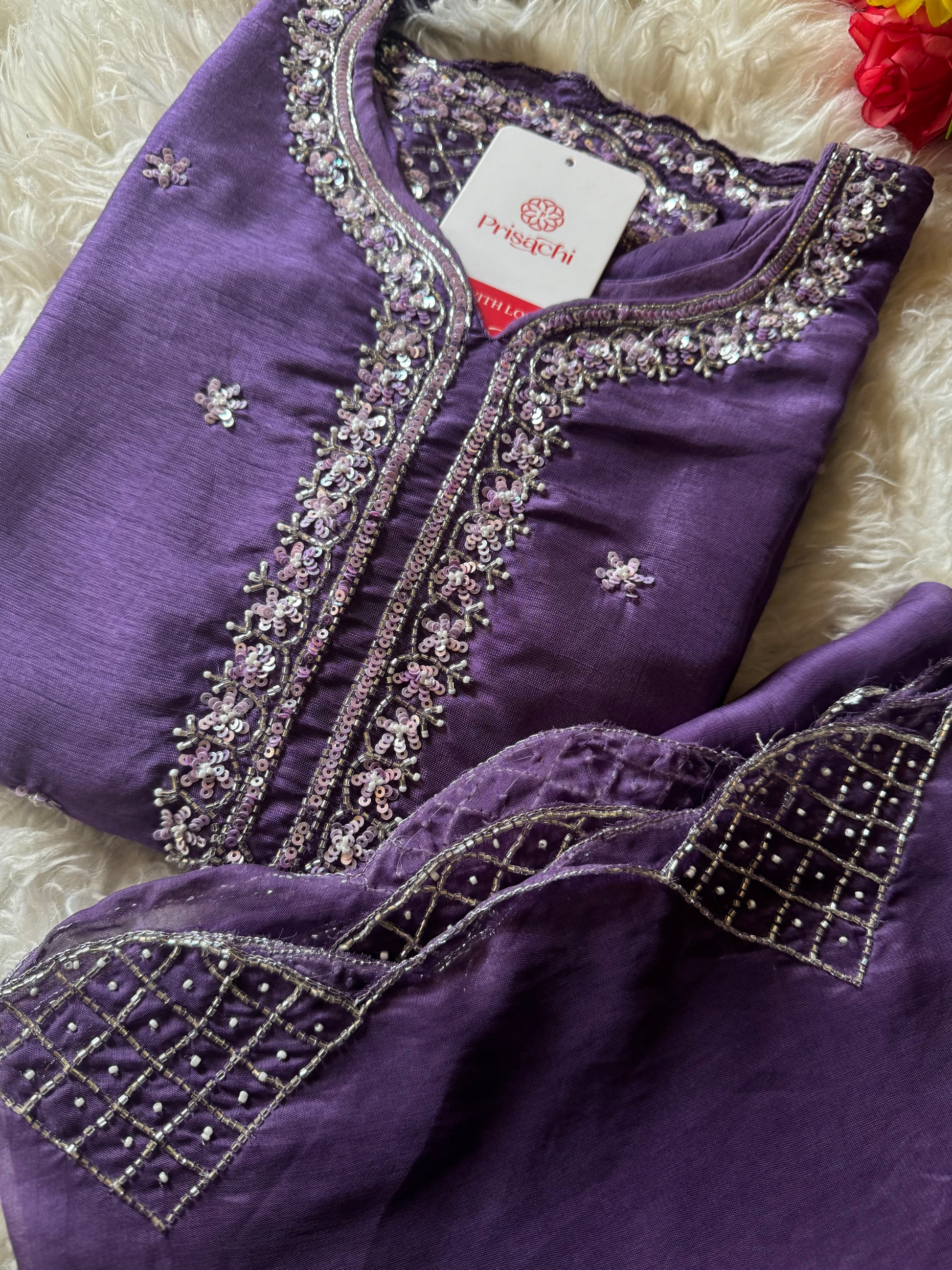 Shine with our Dupatta and purple Neck-Embroidered Kurta Set. The elaborate embroidery embellishing the collar of this dress exudes feminine beauty. The set comes with a chic kurta, matching pants, and a dupatta in a pretty purple color. This beautiful and adaptable ensemble will add flair to your ethnic wardrobe for any occasion.