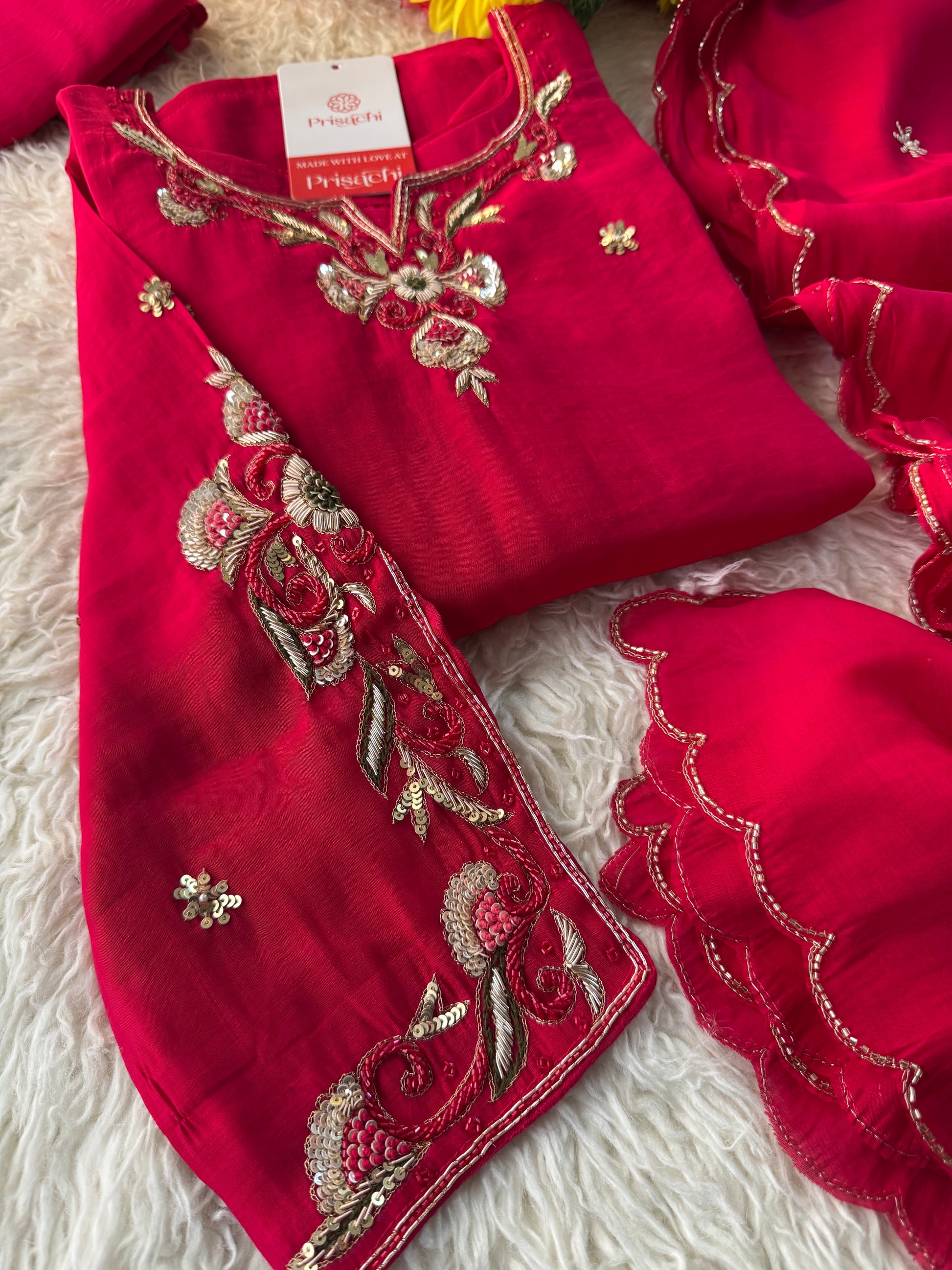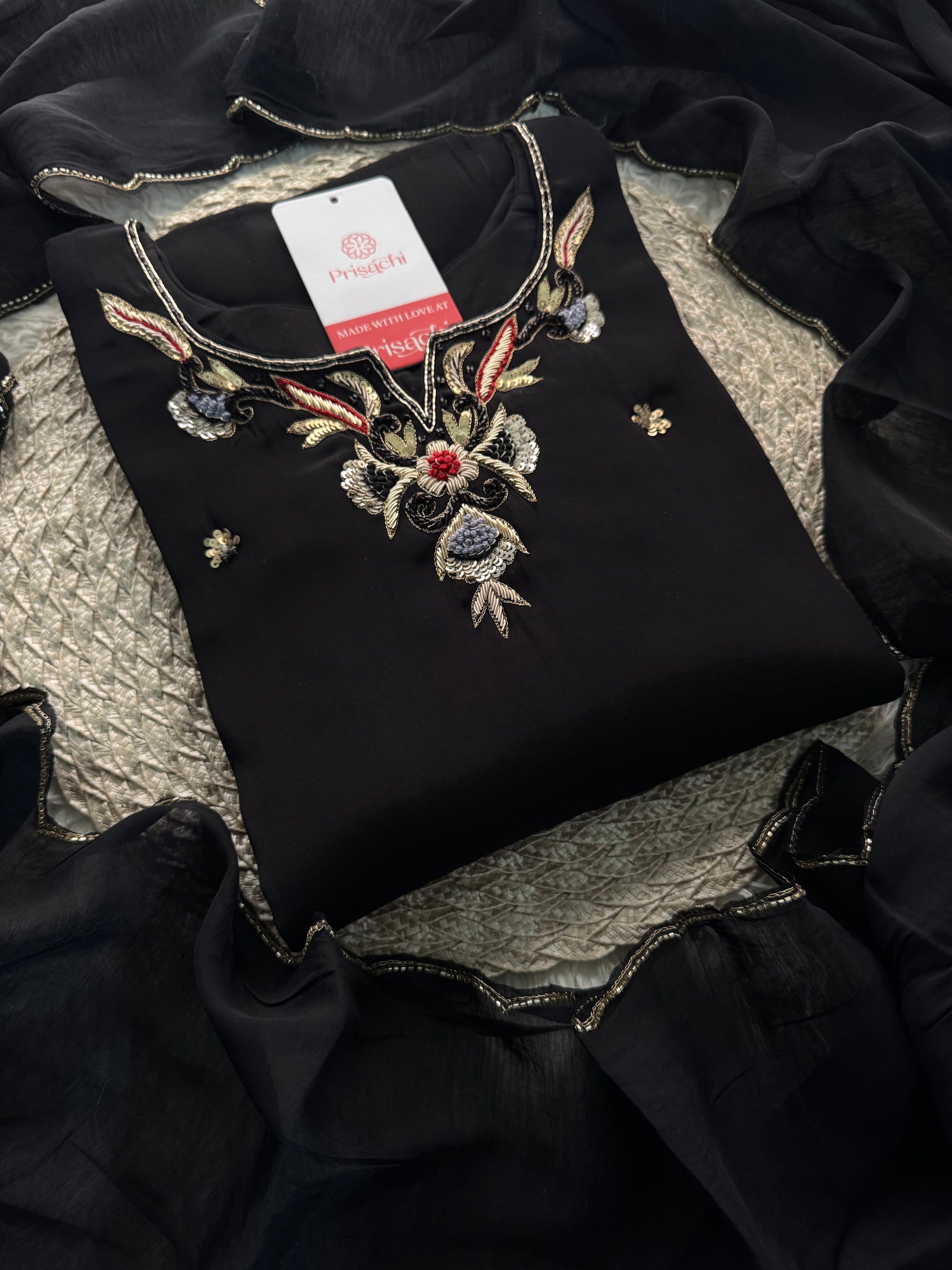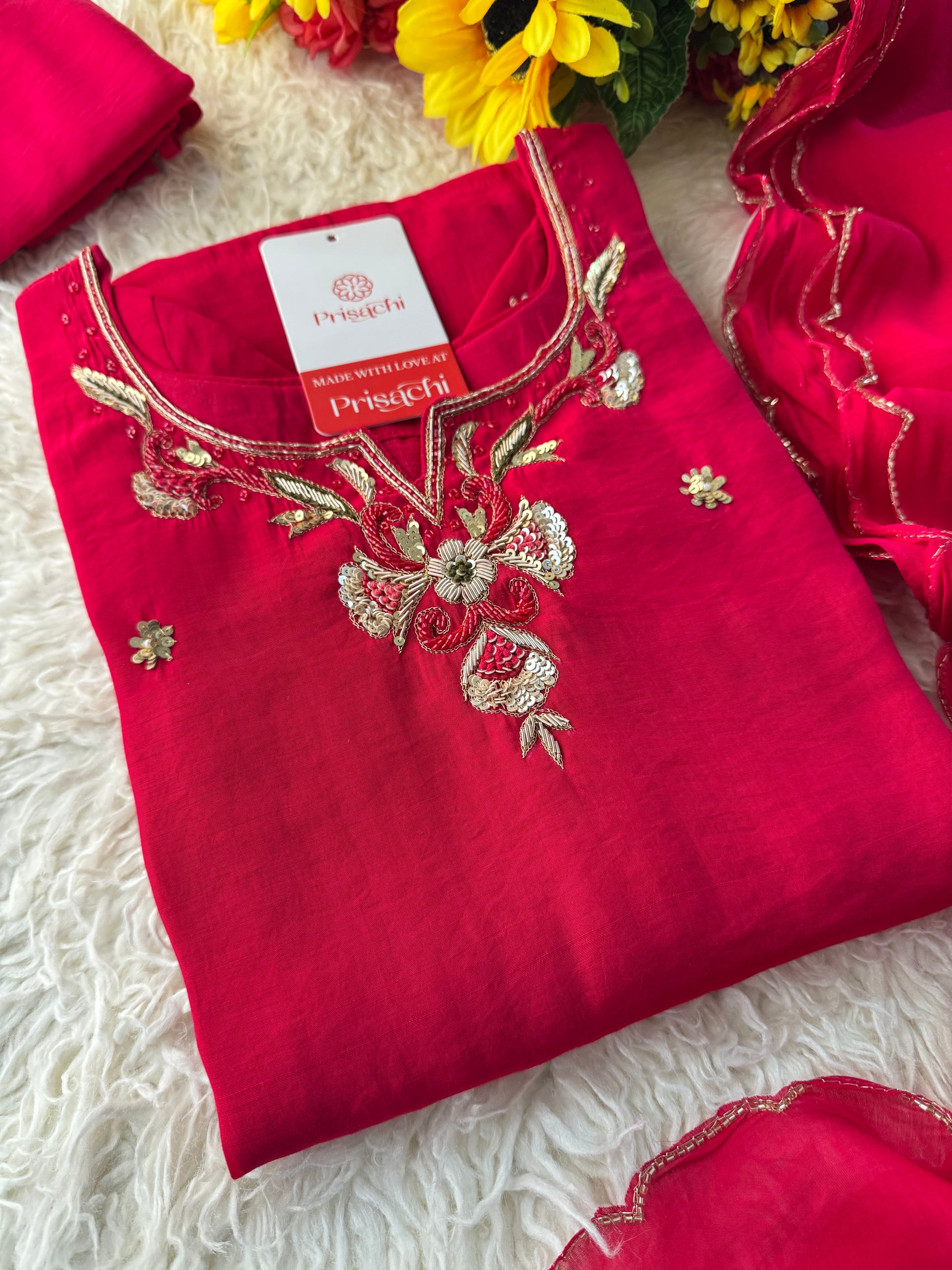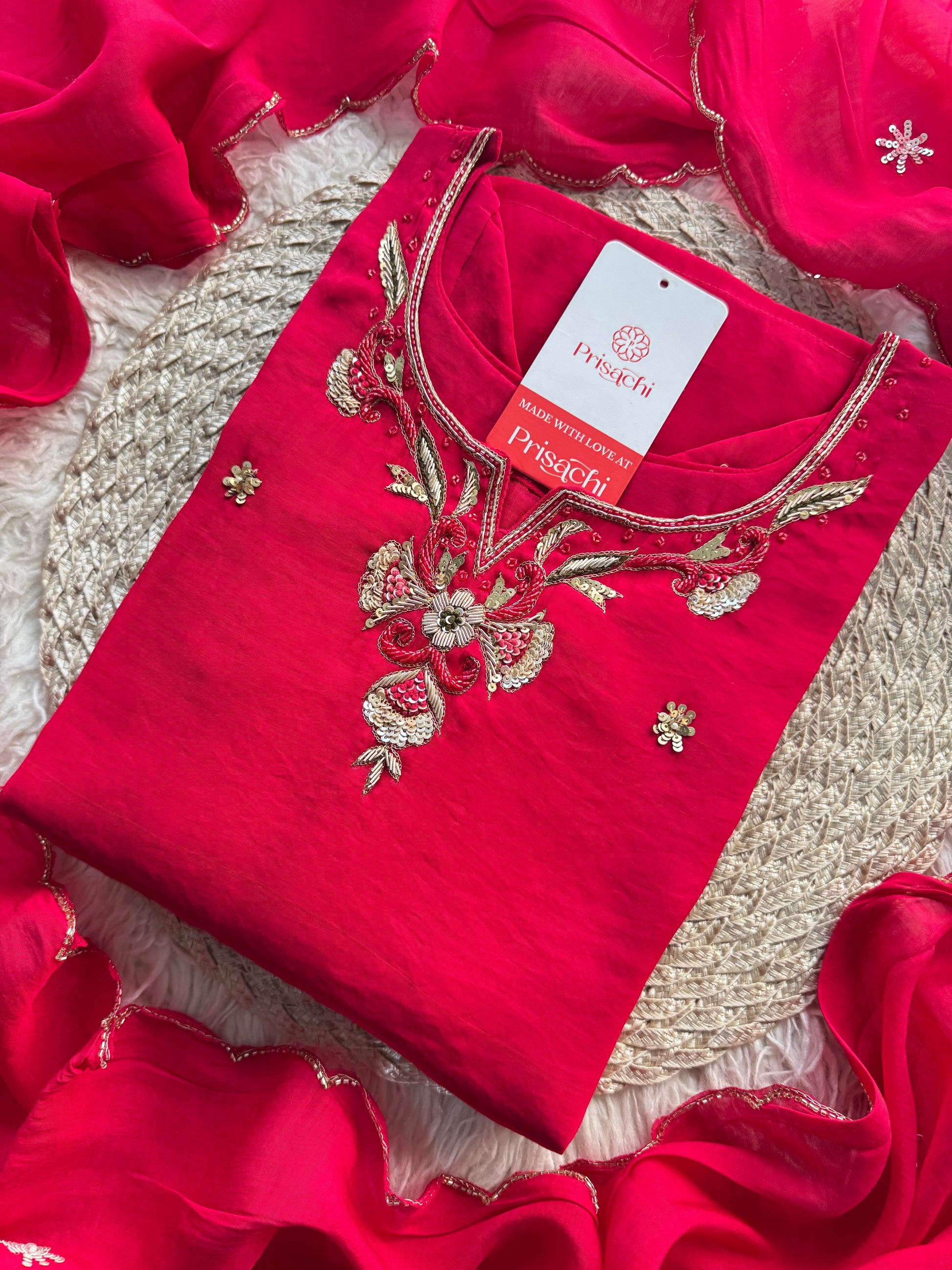 With our Embroidered Kurta Set with Dupatta, you may enrobe yourself in regal charm. The gorgeous embroidery gives the deep purple cloth a hint of grandeur. This combo is ideal for exceptional occasions that call for sophistication and appeal because it contains a stylish kurta and a matching dupatta.