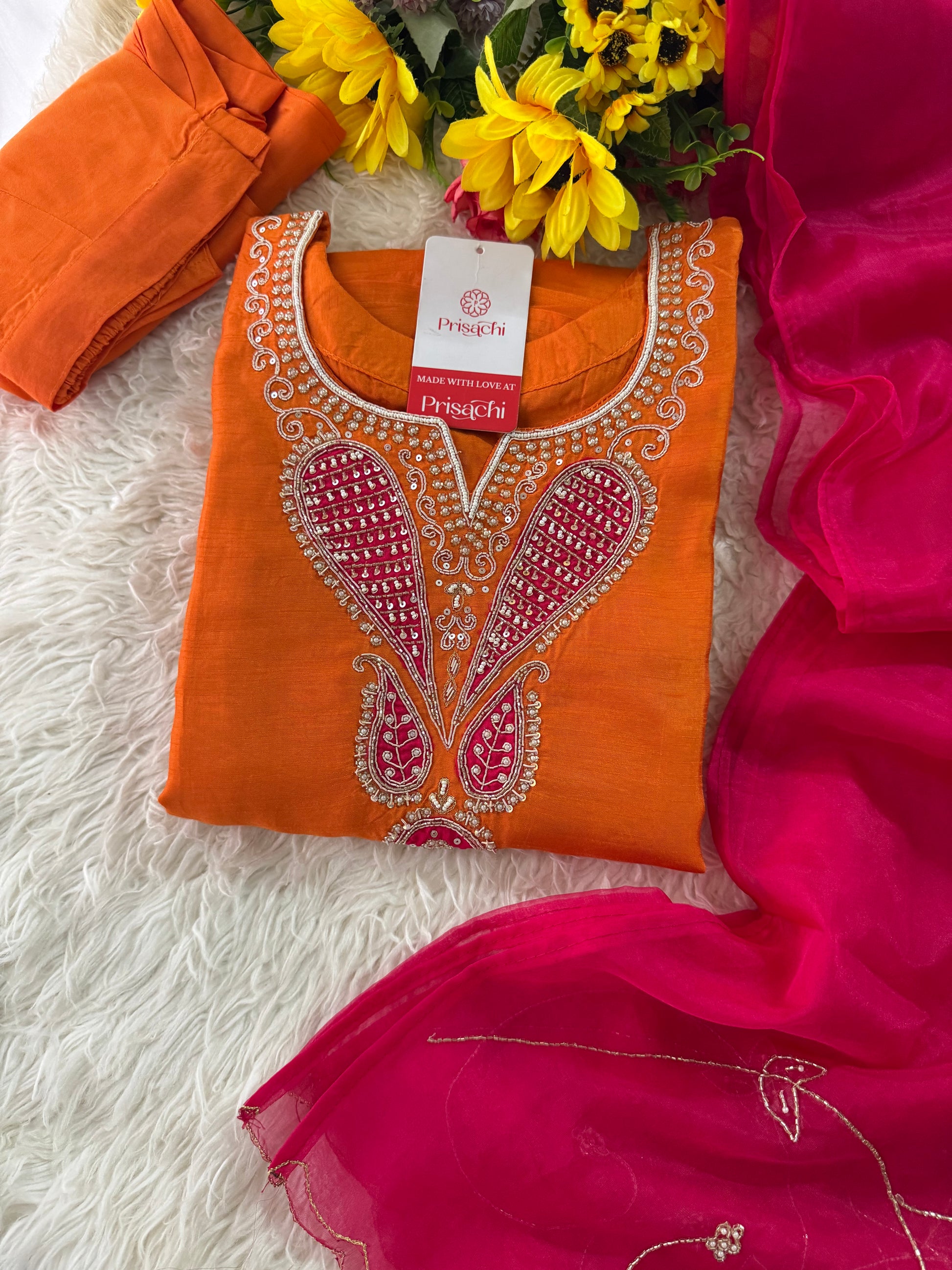 Orange Designer Embroidered Kurta Set for Women with Dupatta & Pants - Prisachi