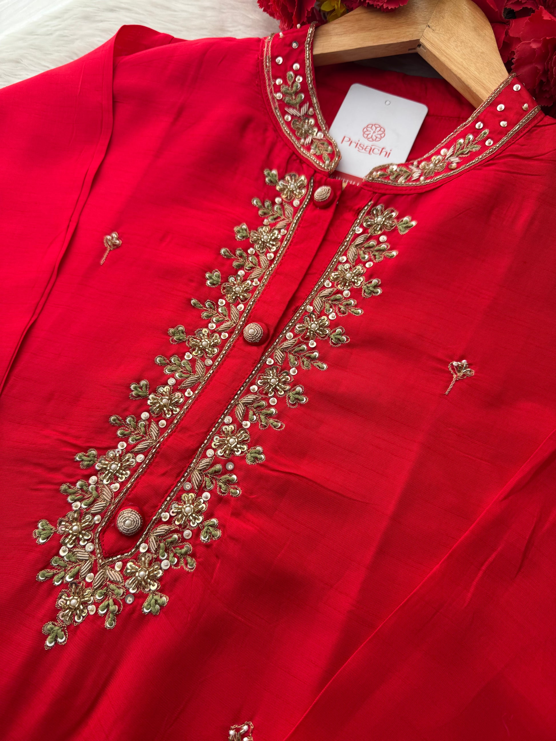 Elevate your ethnic wardrobe with this stunning Red embroidered kurta set for women, crafted from premium breathable fabric for comfort and elegance. Featuring intricate gold thread and pearl embroidery on the neckline, this designer 3-piece set includes a straight kurta, semi-elasticated pants, and a matching sheer dupatta with delicate border detailing. The rich vibrant red color adds a festive charm, making it perfect for weddings, festivals, parties, and special occasions. This elegant kurta pant dupatta set blends traditional craftsmanship with modern style, ideal for festive wear, ethnic celebrations, and occasion wear.