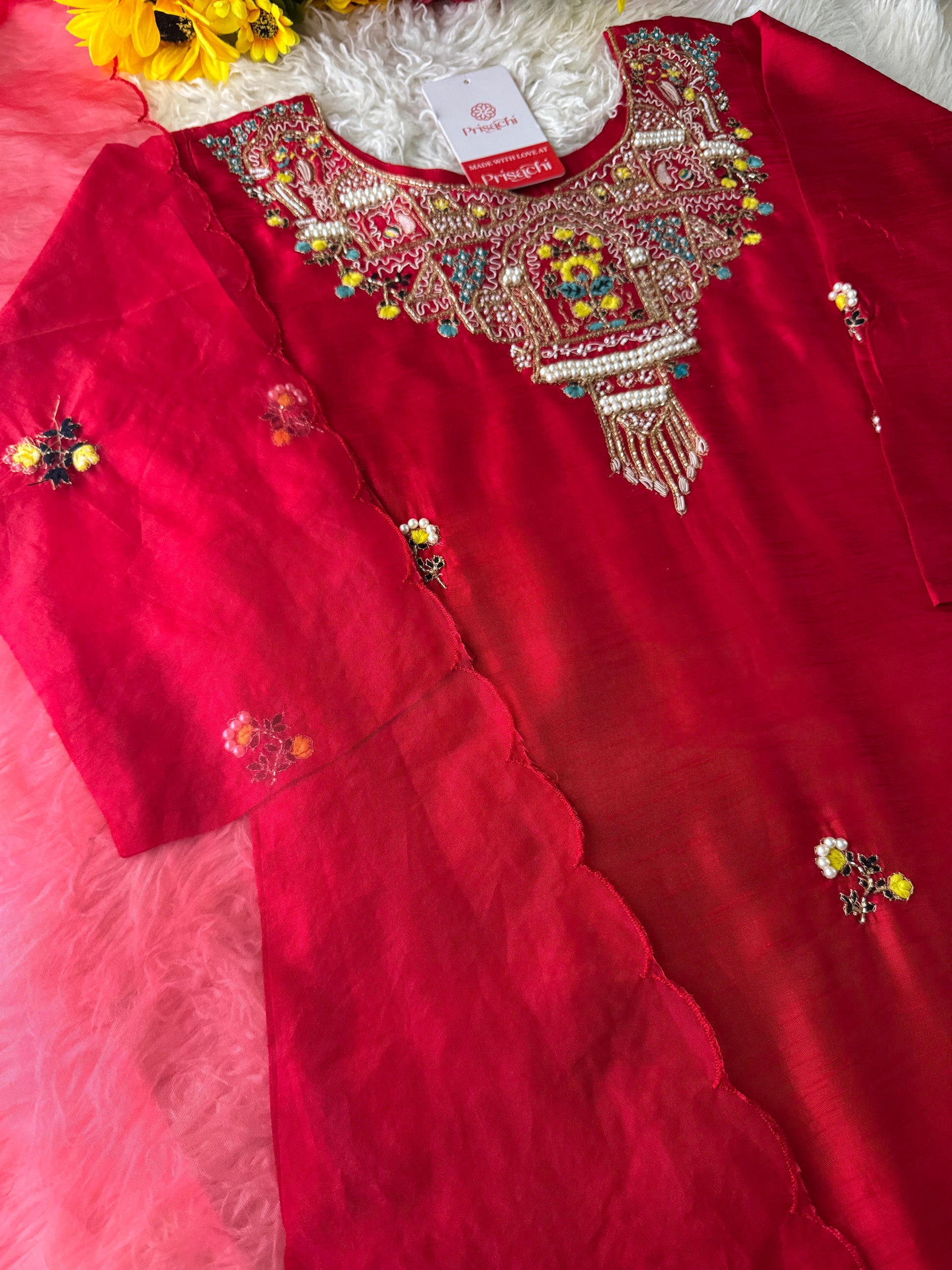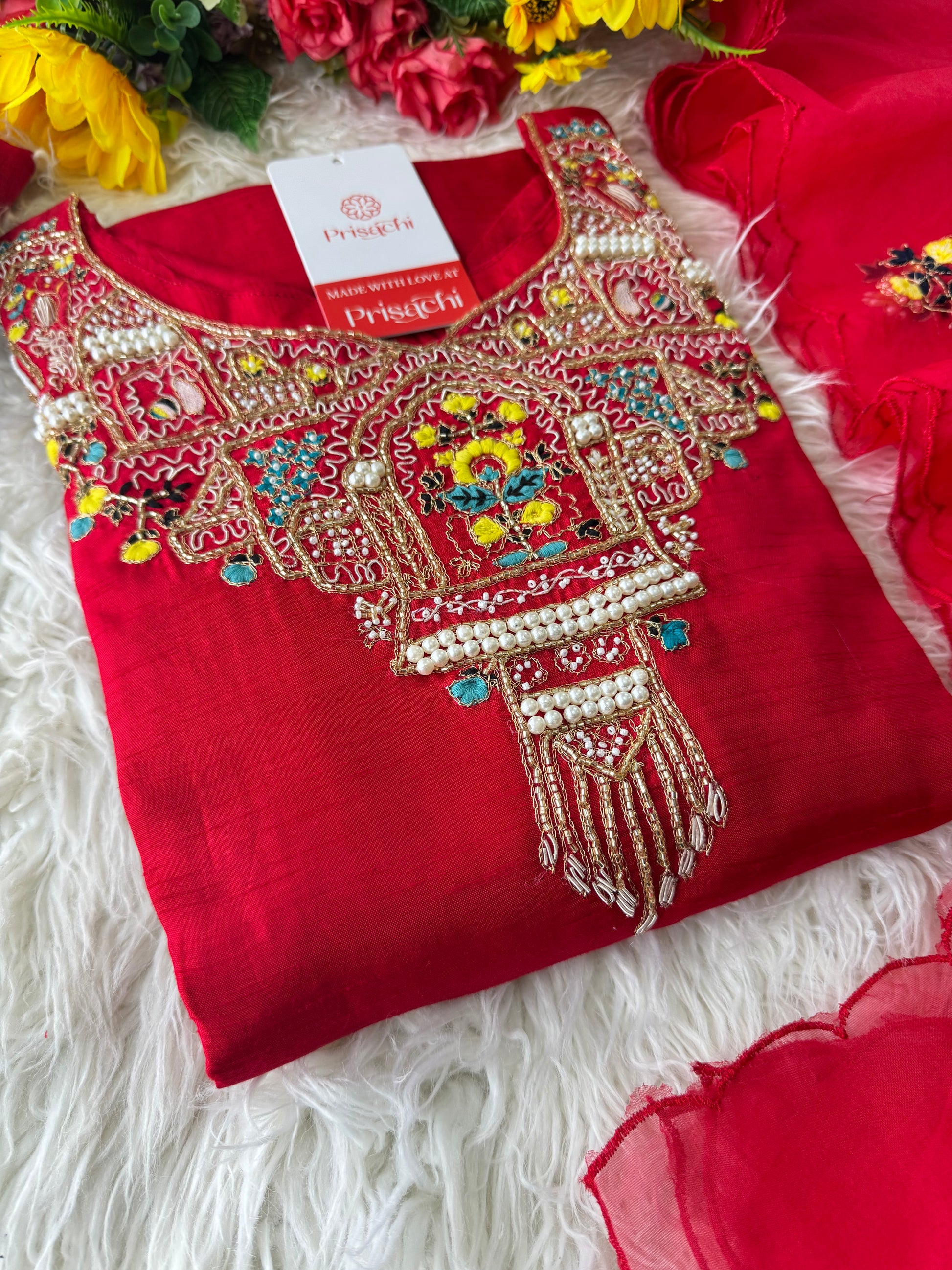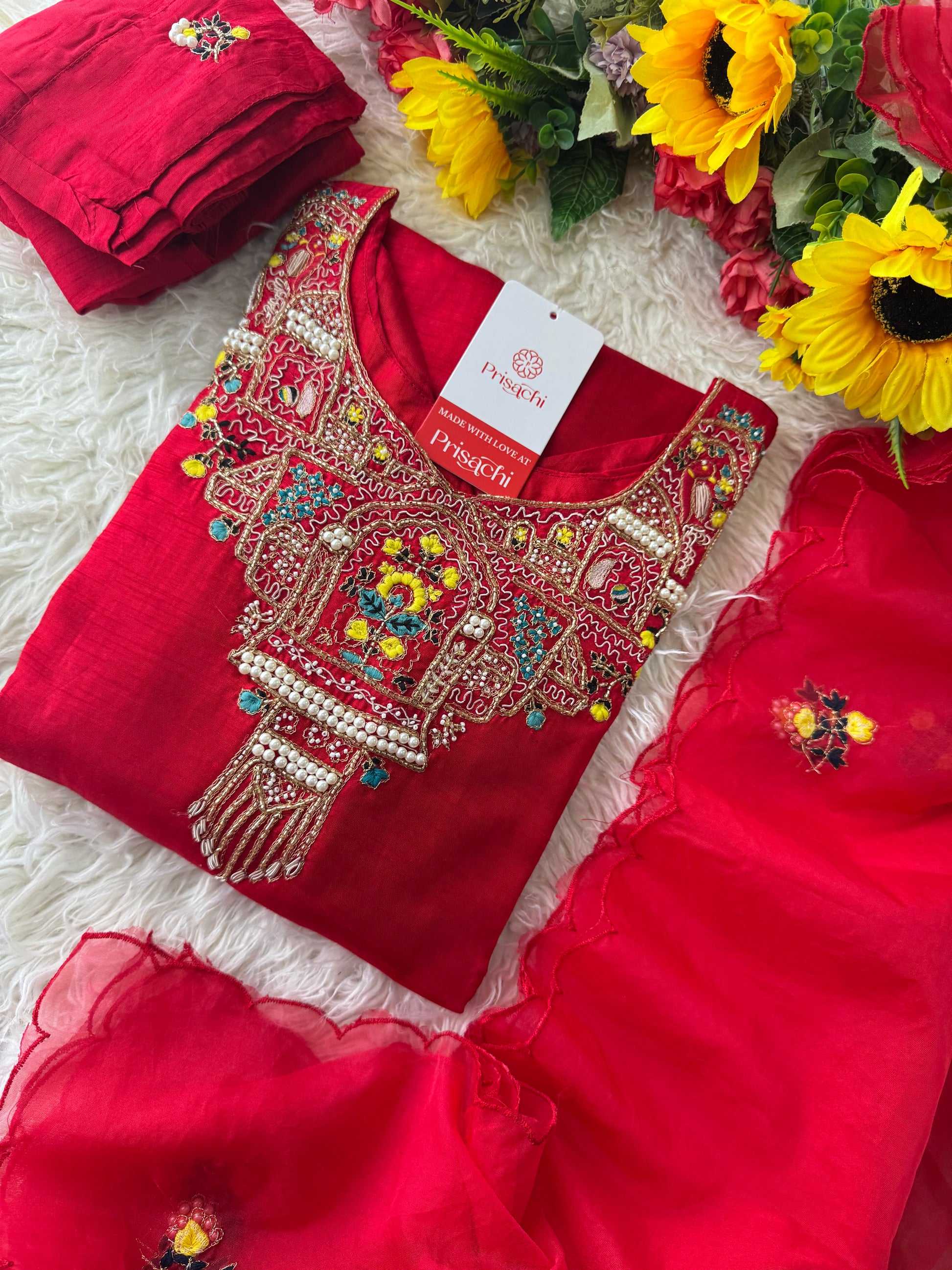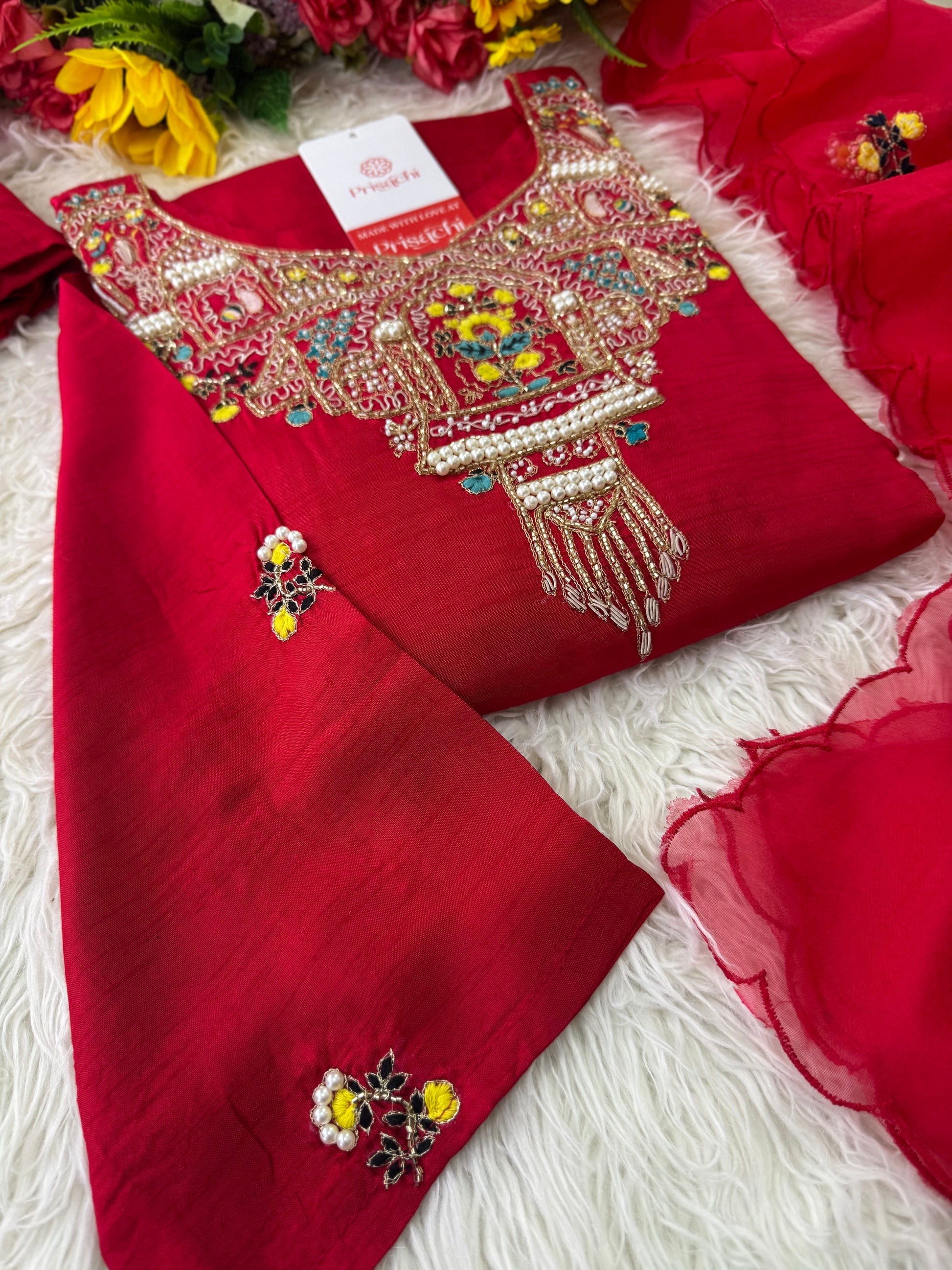 Our Red embroidered kurta set and dupatta will boost your style. Rich blue tones and beautiful embroidery come together in this magnificent outfit to produce a striking and classic look. The set is ideal for trendy and exquisite ethnic wear because it comes with a kurta, matching bottoms, and a lovely dupatta.