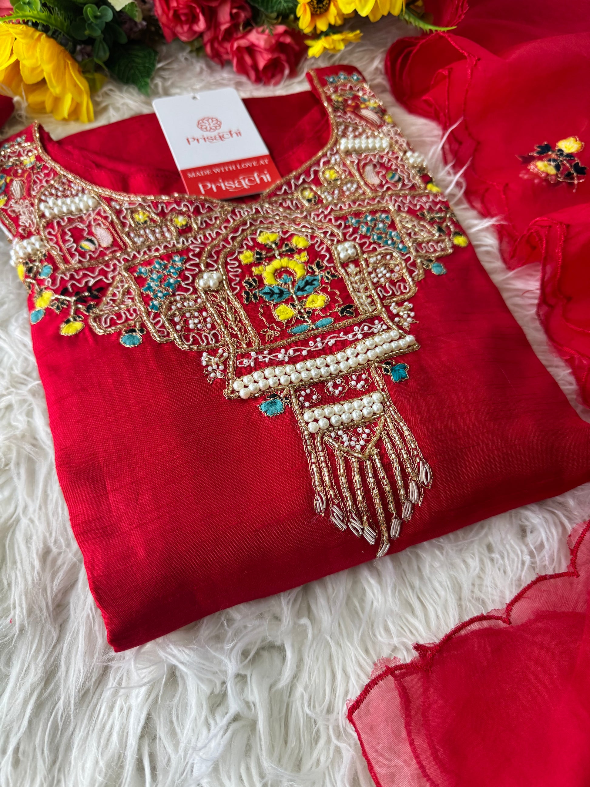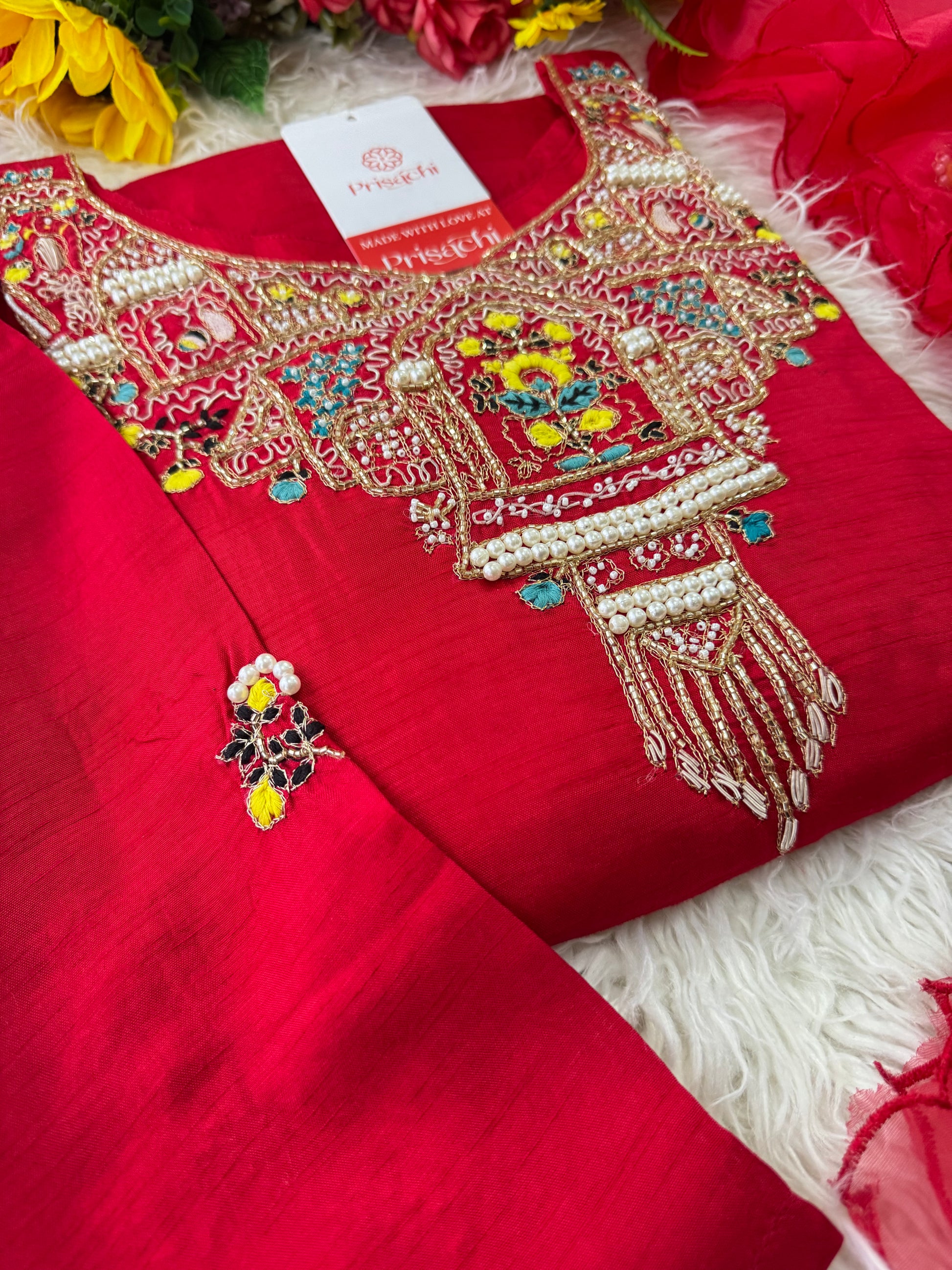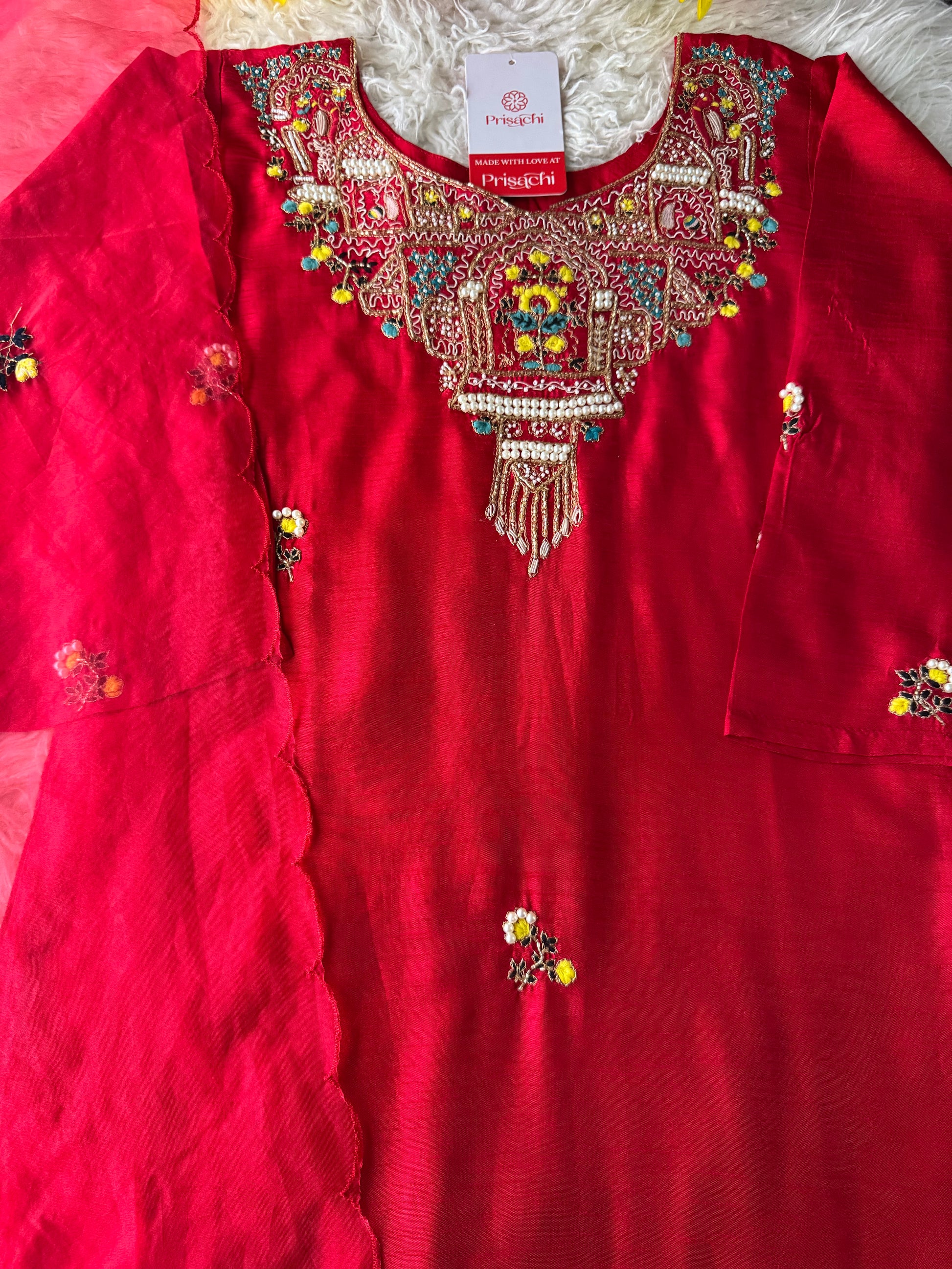 Our Red embroidered kurta set and dupatta will boost your style. Rich blue tones and beautiful embroidery come together in this magnificent outfit to produce a striking and classic look. The set is ideal for trendy and exquisite ethnic wear because it comes with a kurta, matching bottoms, and a lovely dupatta.