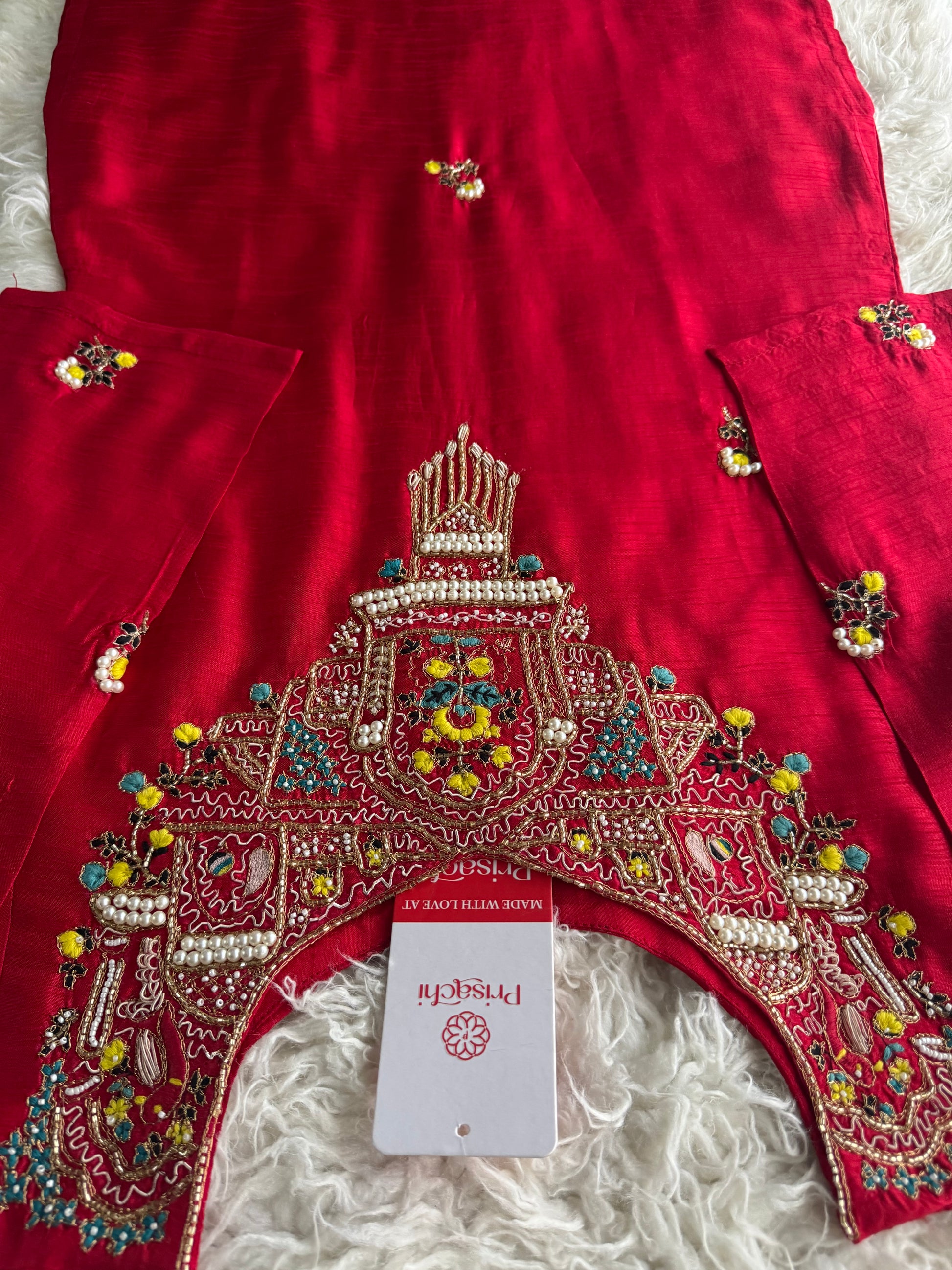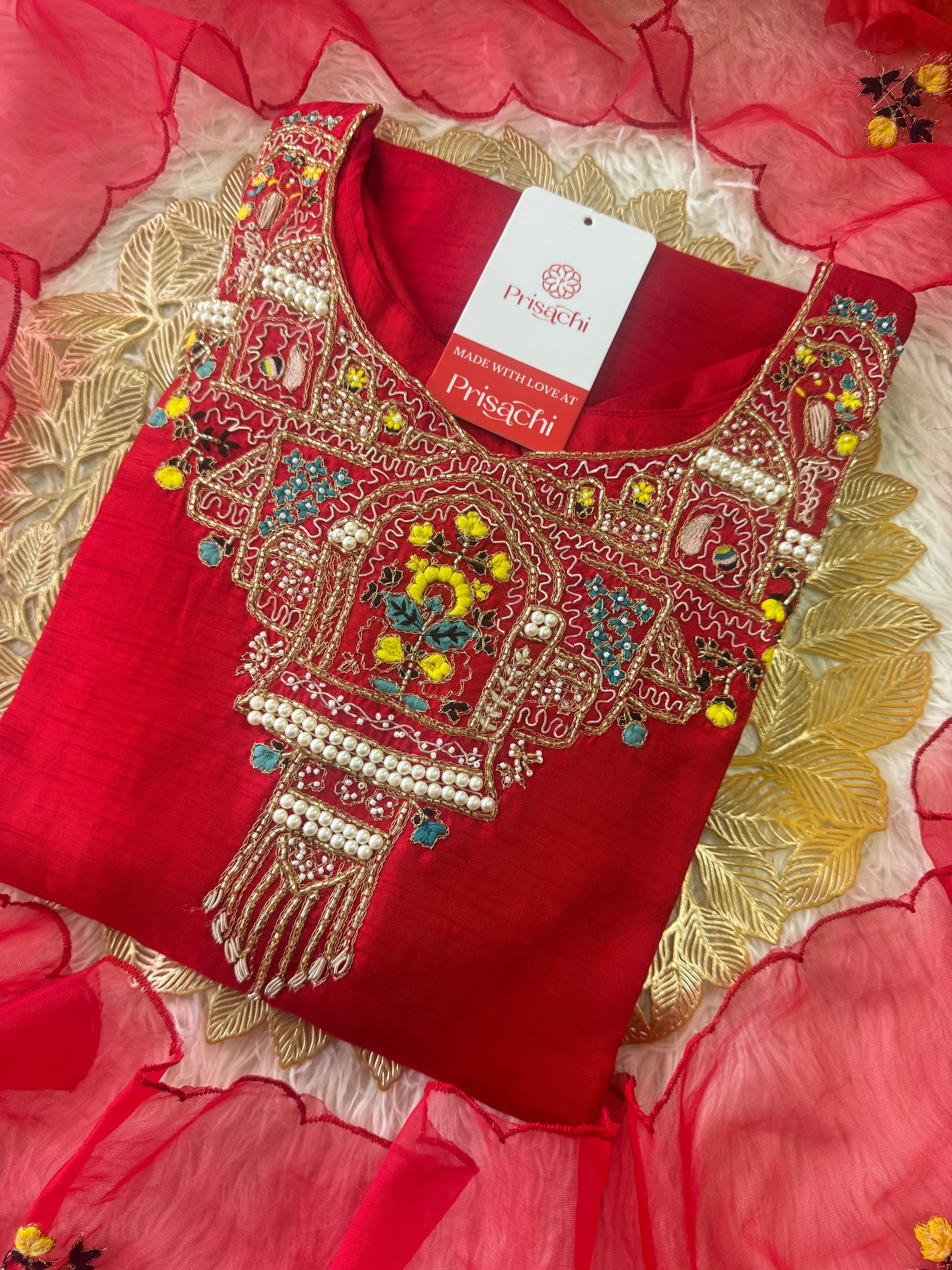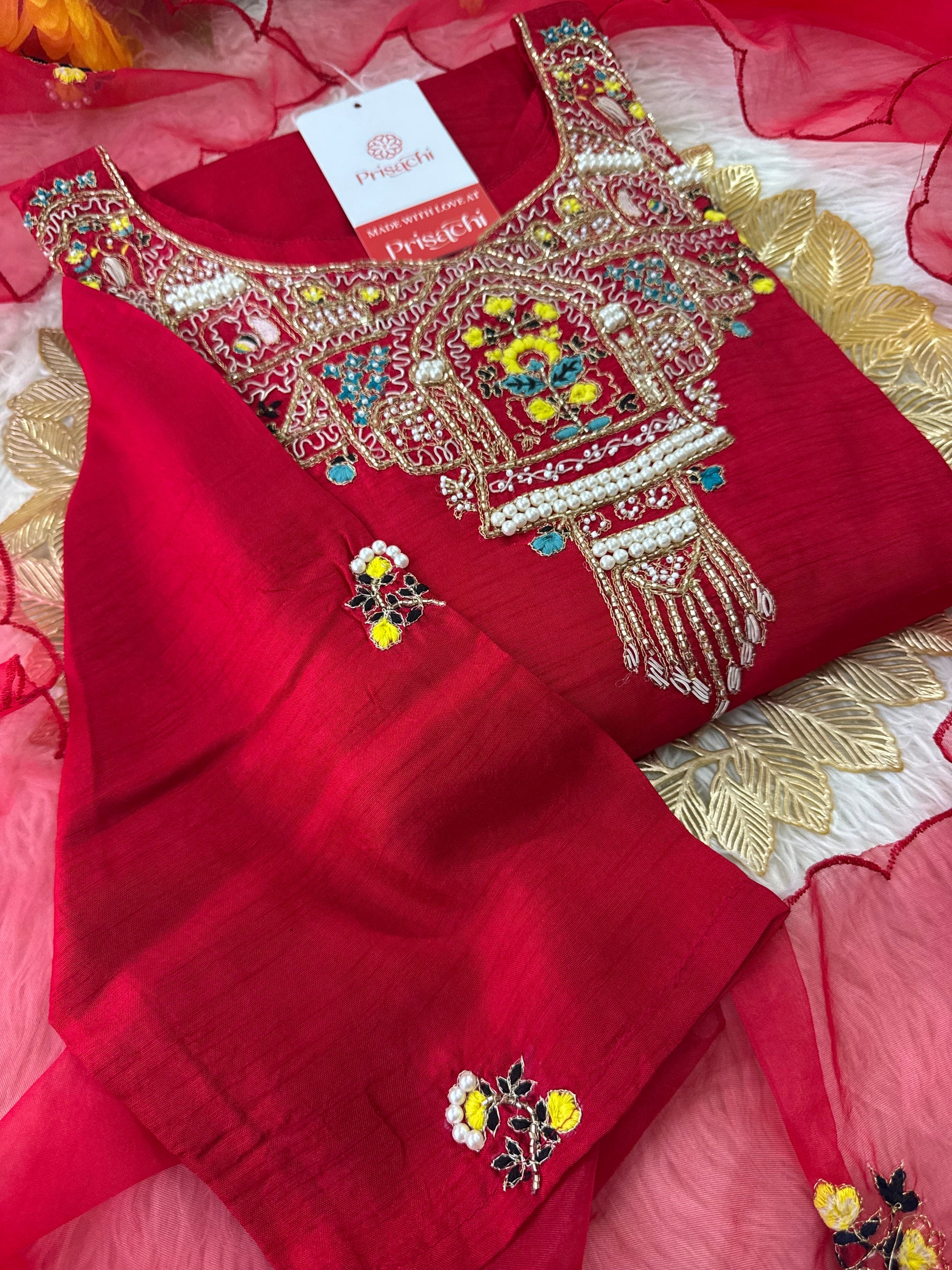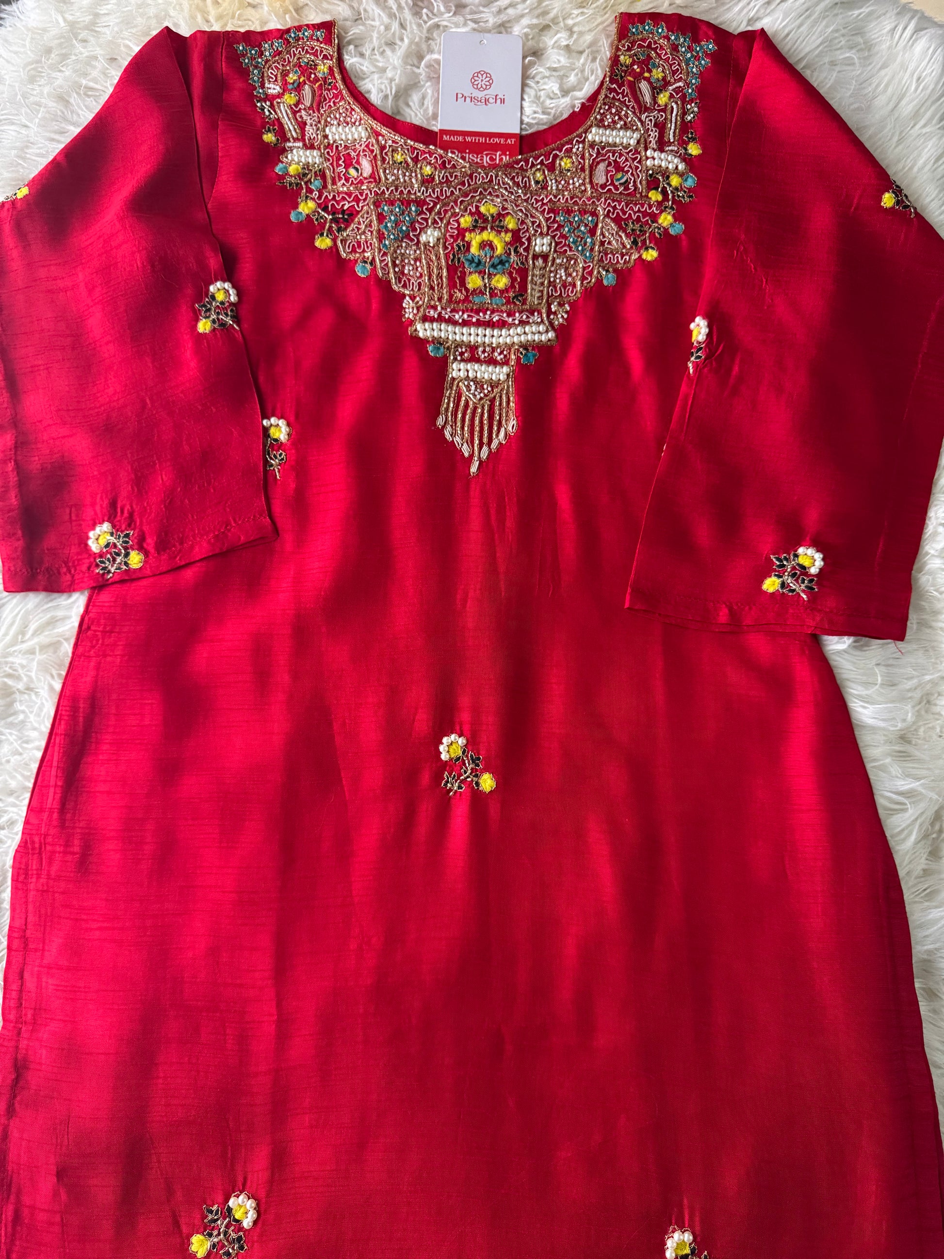 Our Red embroidered kurta set and dupatta will boost your style. Rich blue tones and beautiful embroidery come together in this magnificent outfit to produce a striking and classic look. The set is ideal for trendy and exquisite ethnic wear because it comes with a kurta, matching bottoms, and a lovely dupatta.