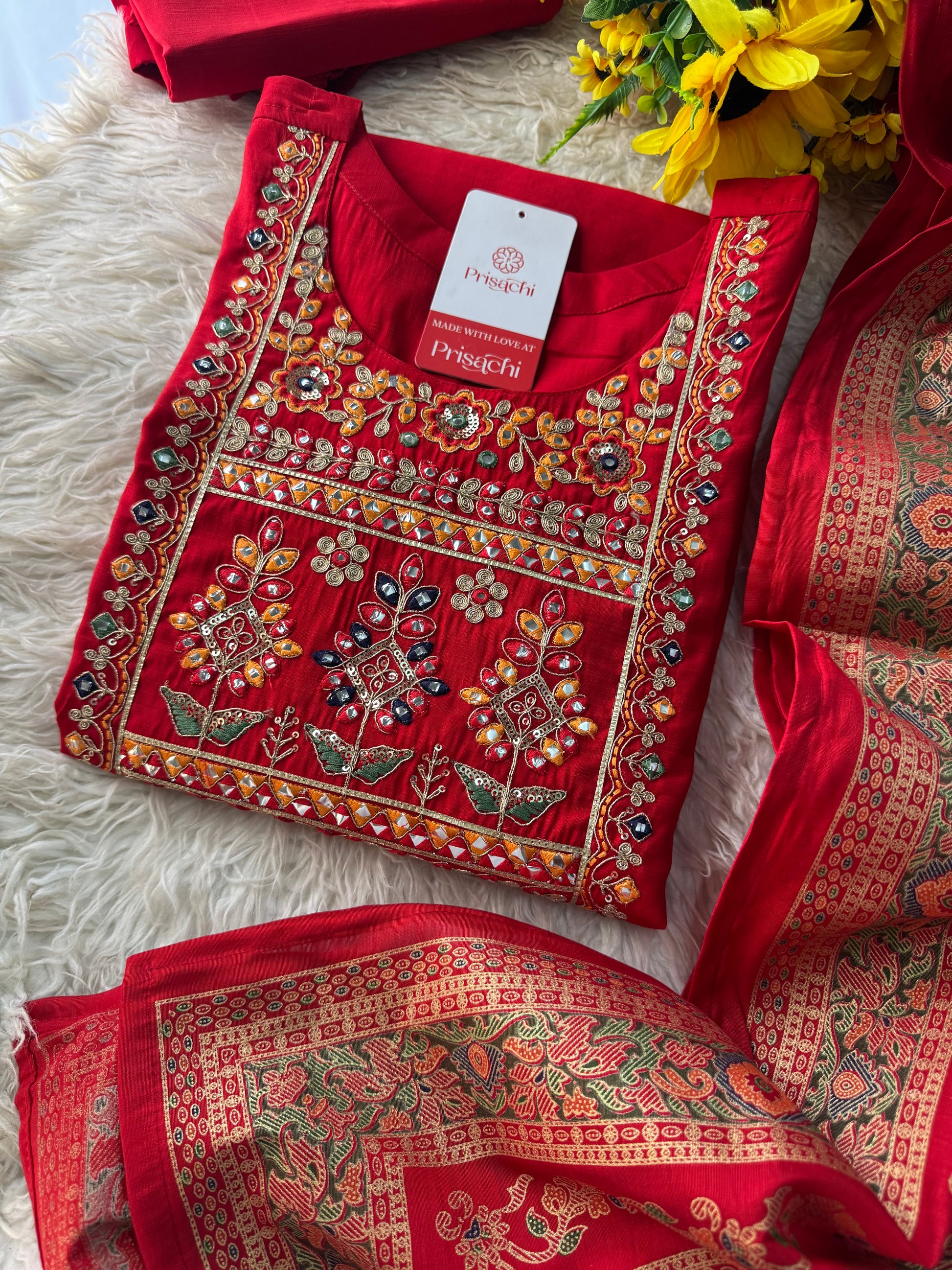 Our Red embroidered kurta set and dupatta will boost your style. Rich blue tones and beautiful embroidery come together in this magnificent outfit to produce a striking and classic look. The set is ideal for trendy and exquisite ethnic wear because it comes with a kurta, matching bottoms, and a lovely dupatta.