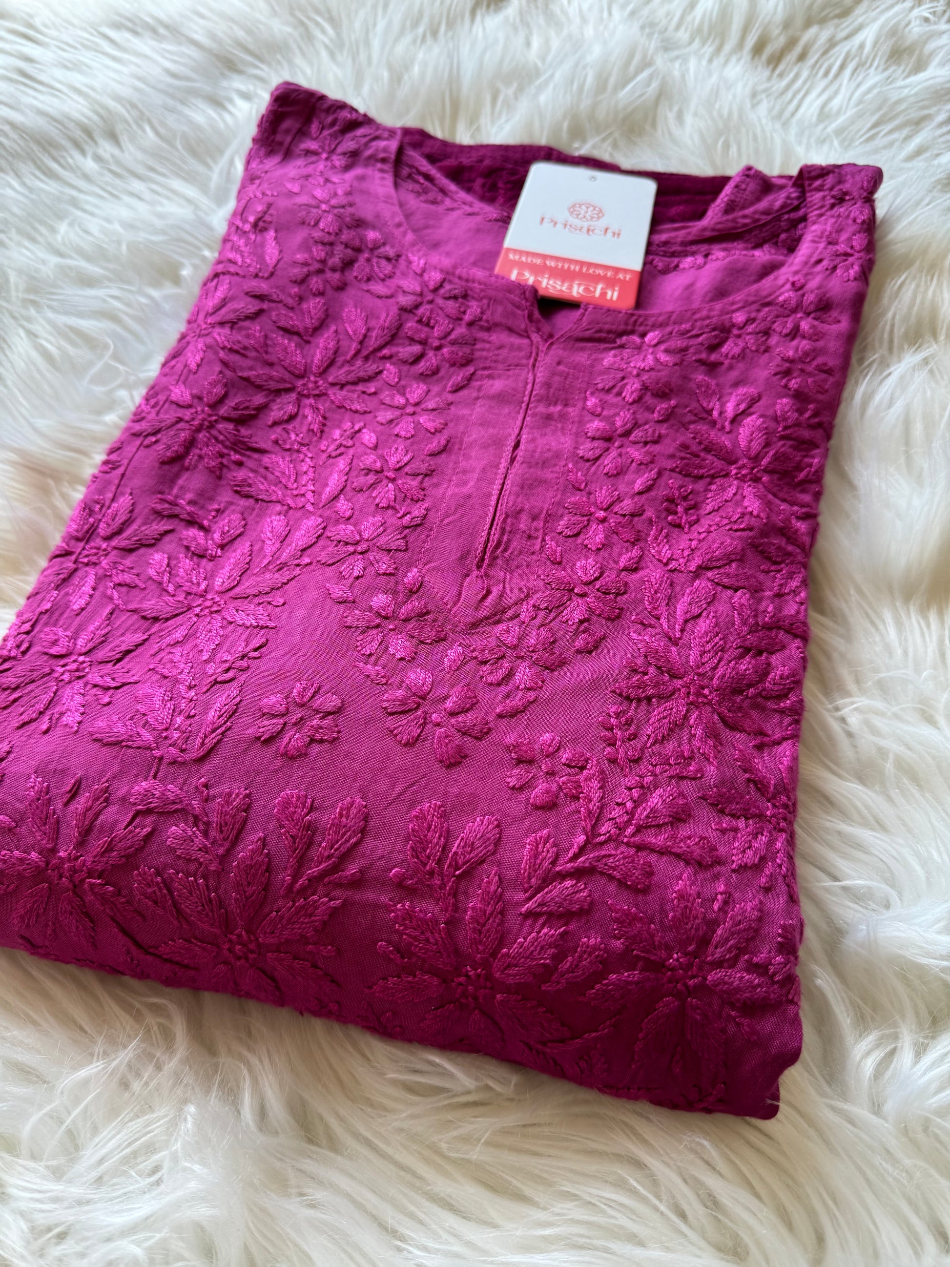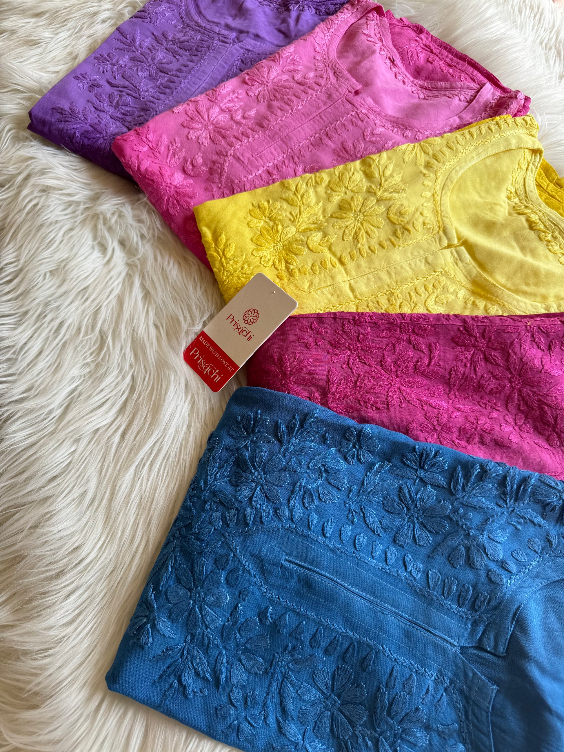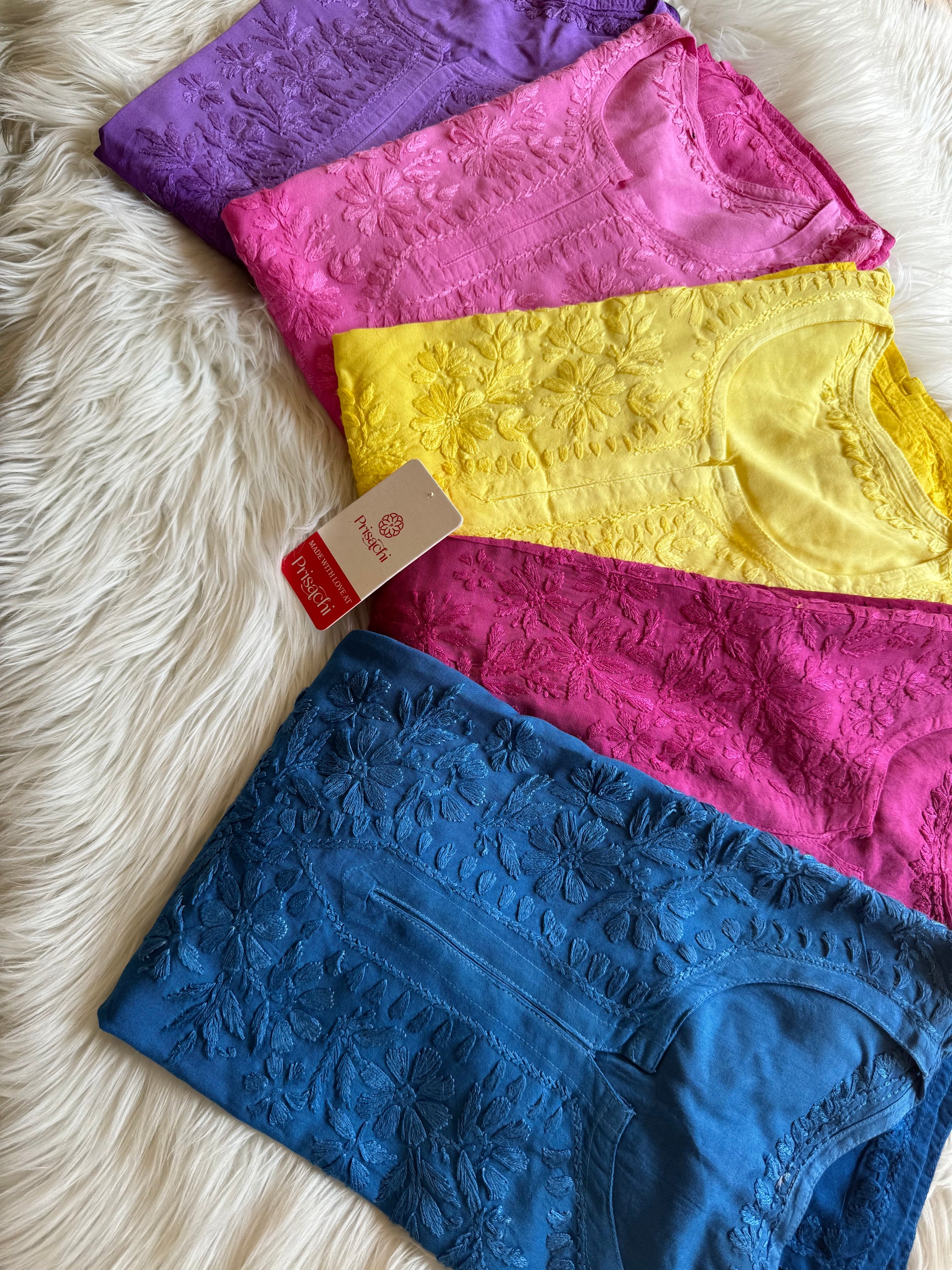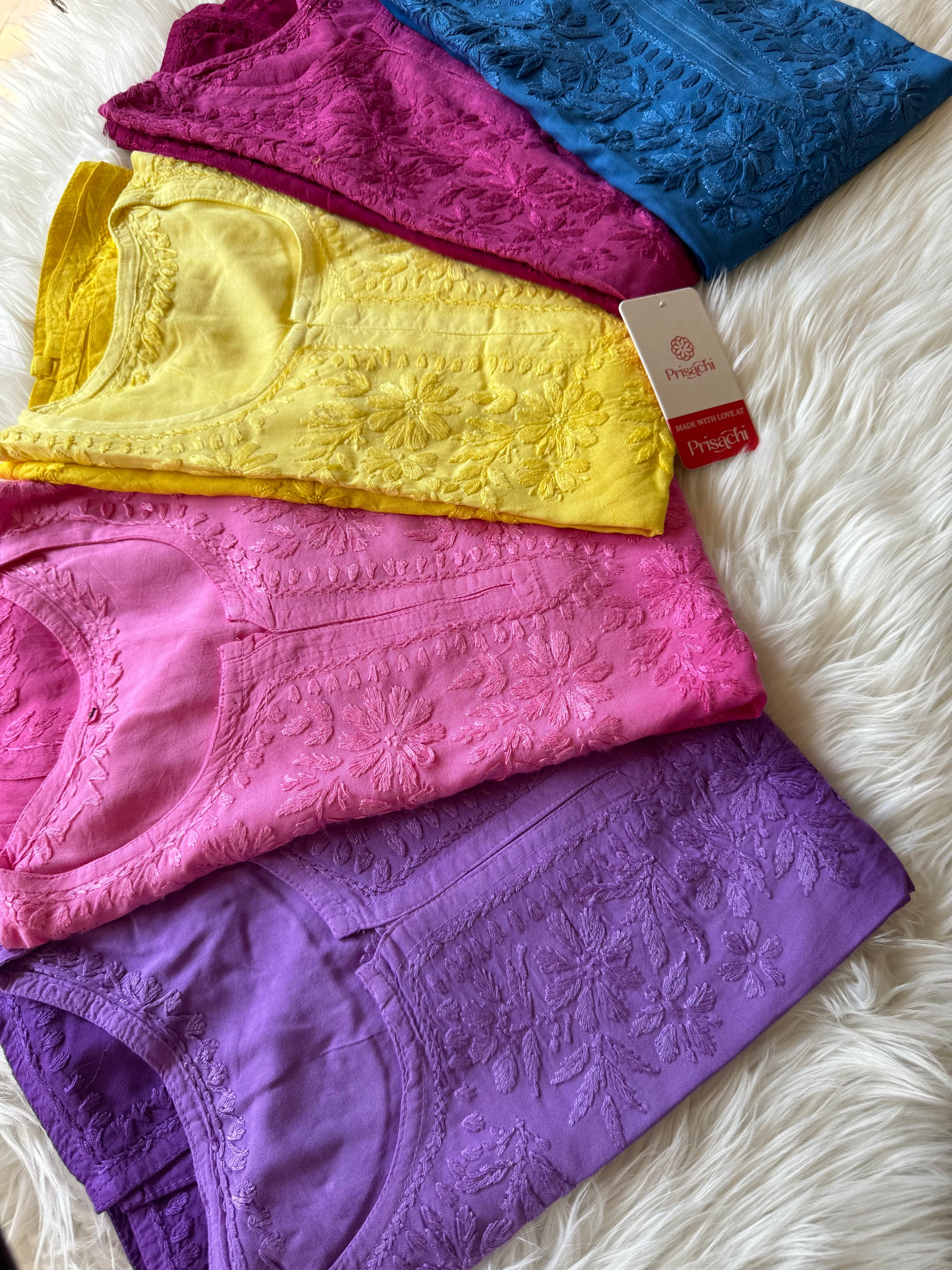 Our Short Chikankari Kurti will enhance your easy elegance. This adaptable garment, which offers comfort and flair, is expertly crafted and contains delicate Chikankari embroidery on soft cotton. Either dressed down or worn casually, it perfectly combines modern and traditional elements, giving your wardrobe's staple pieces a refined touch.