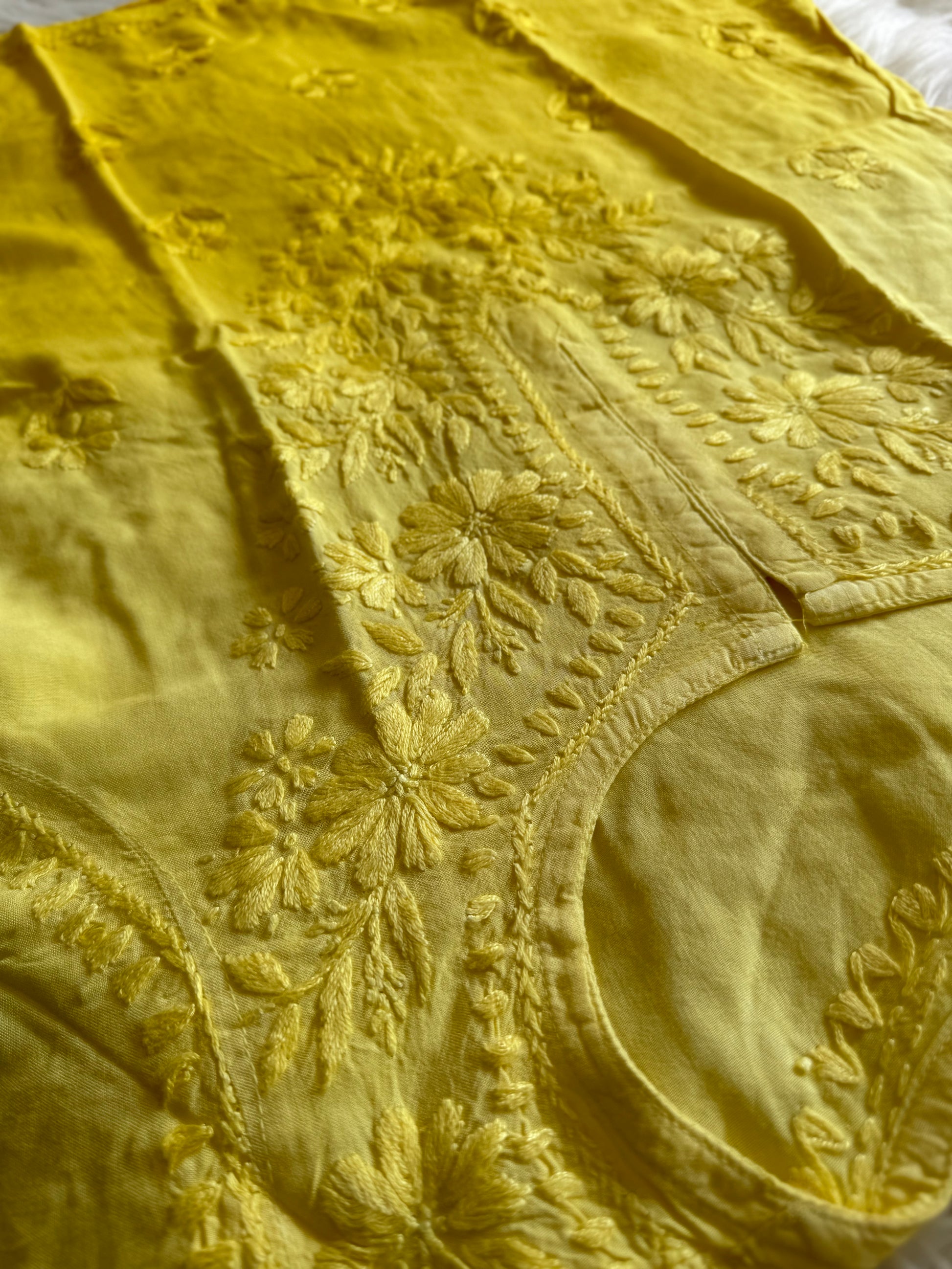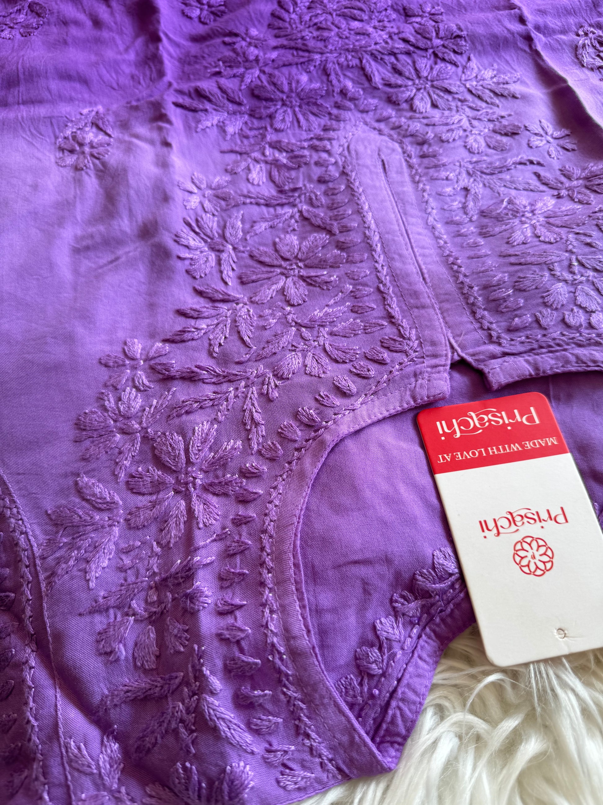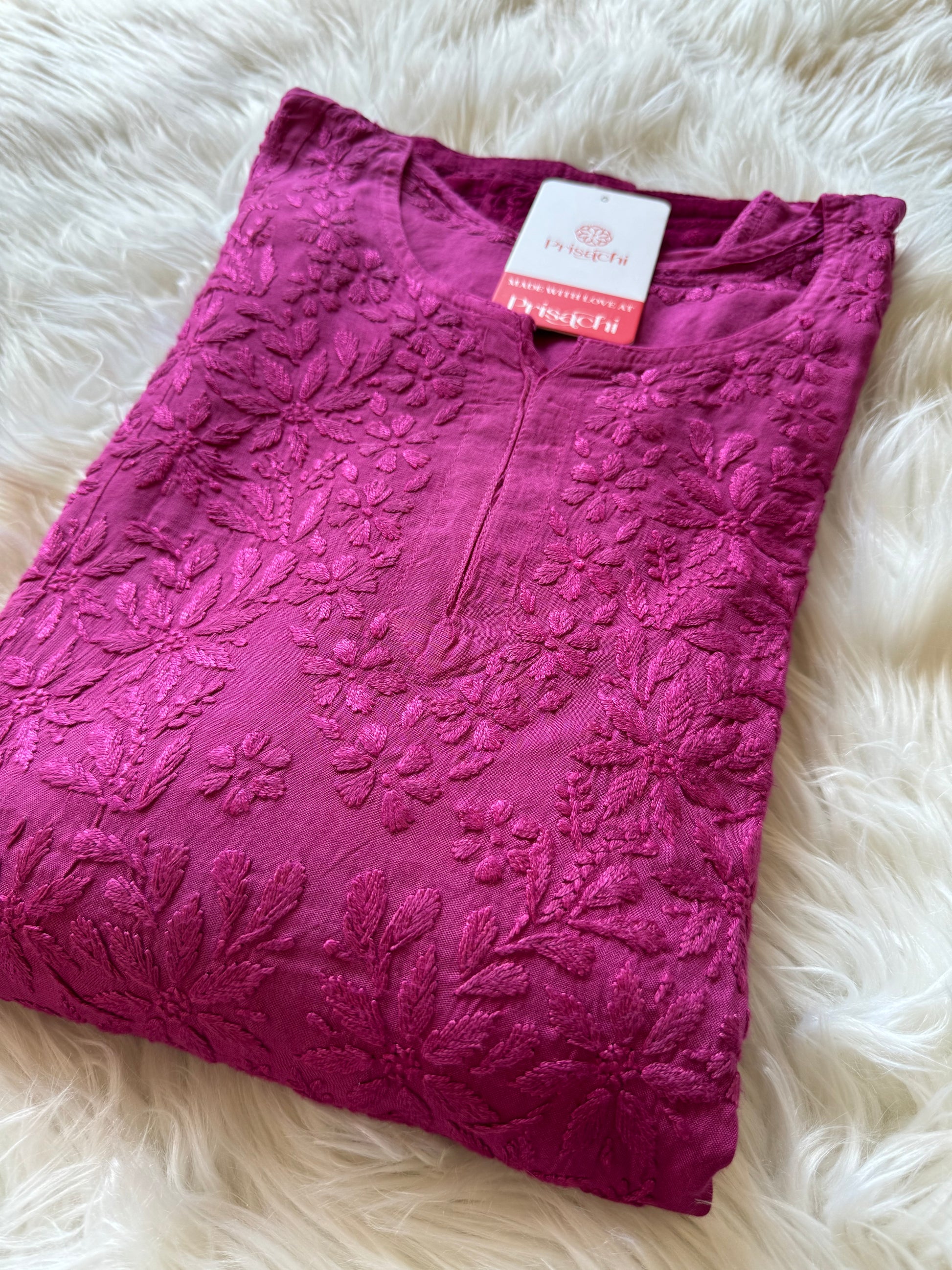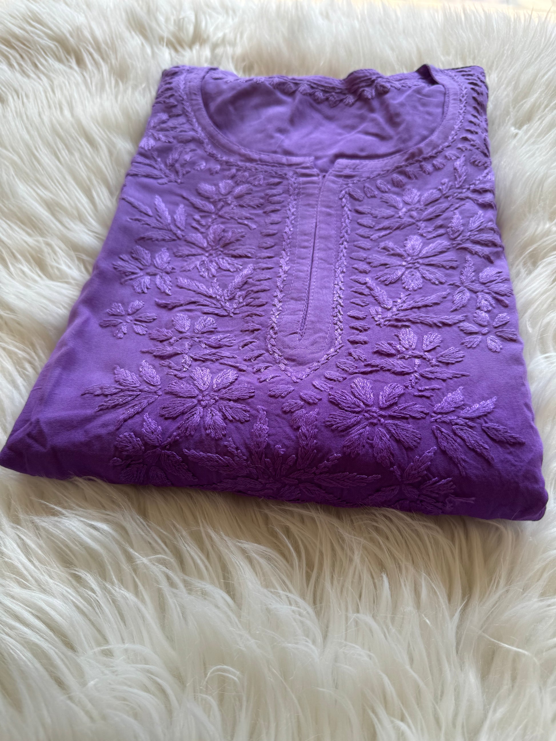 Our Short Chikankari Kurti will enhance your easy elegance. This adaptable garment, which offers comfort and flair, is expertly crafted and contains delicate Chikankari embroidery on soft cotton. Either dressed down or worn casually, it perfectly combines modern and traditional elements, giving your wardrobe's staple pieces a refined touch.