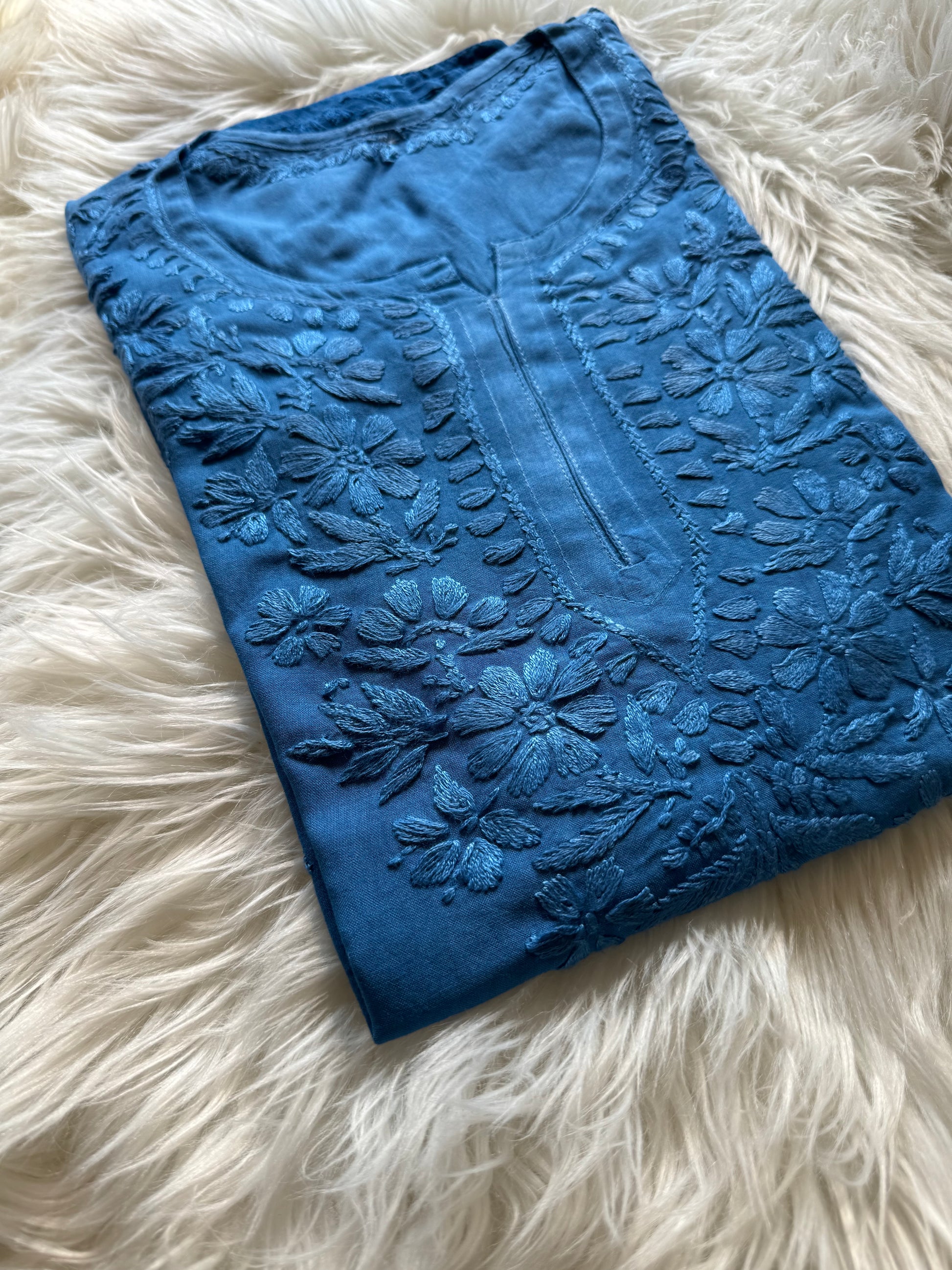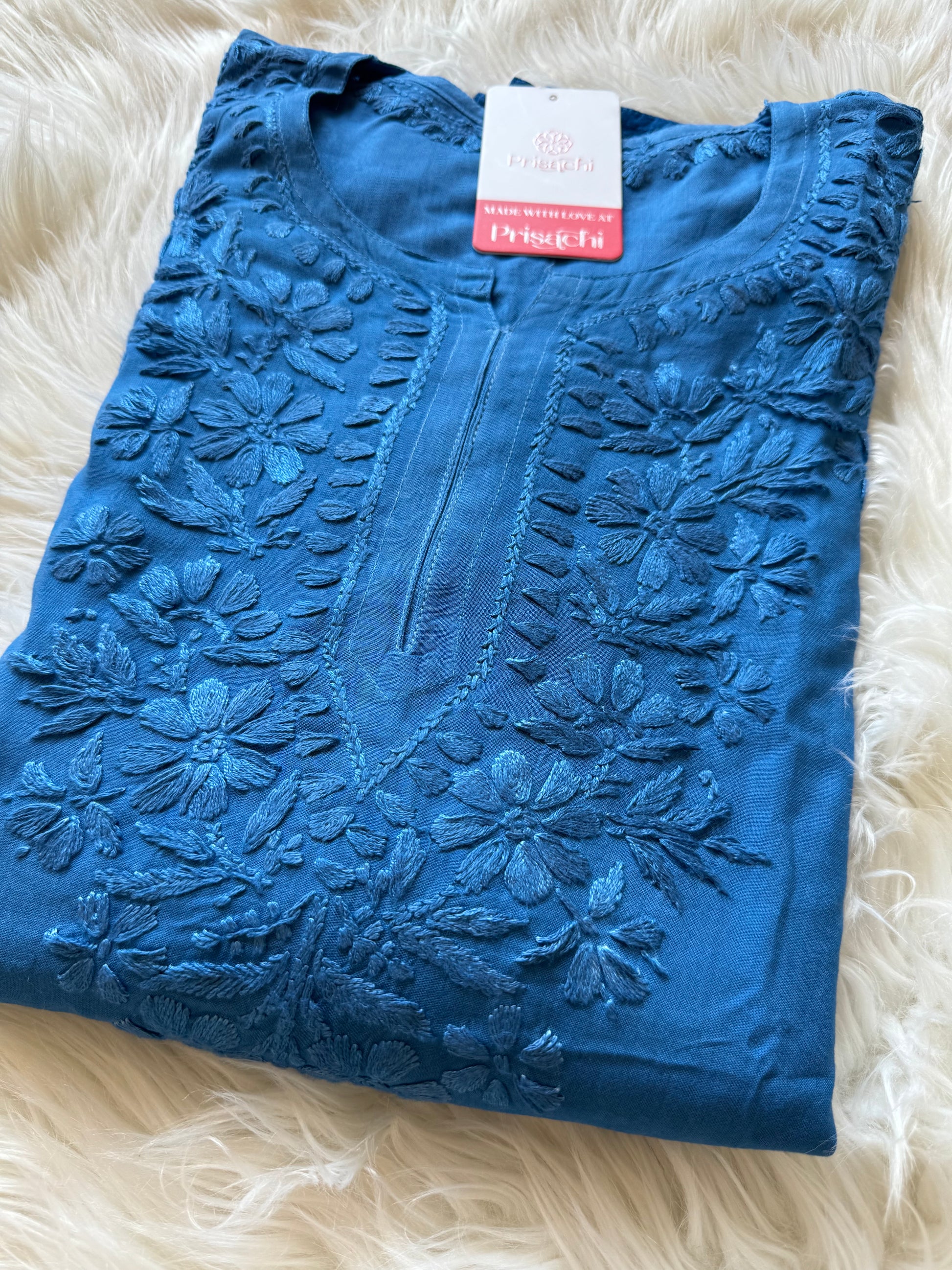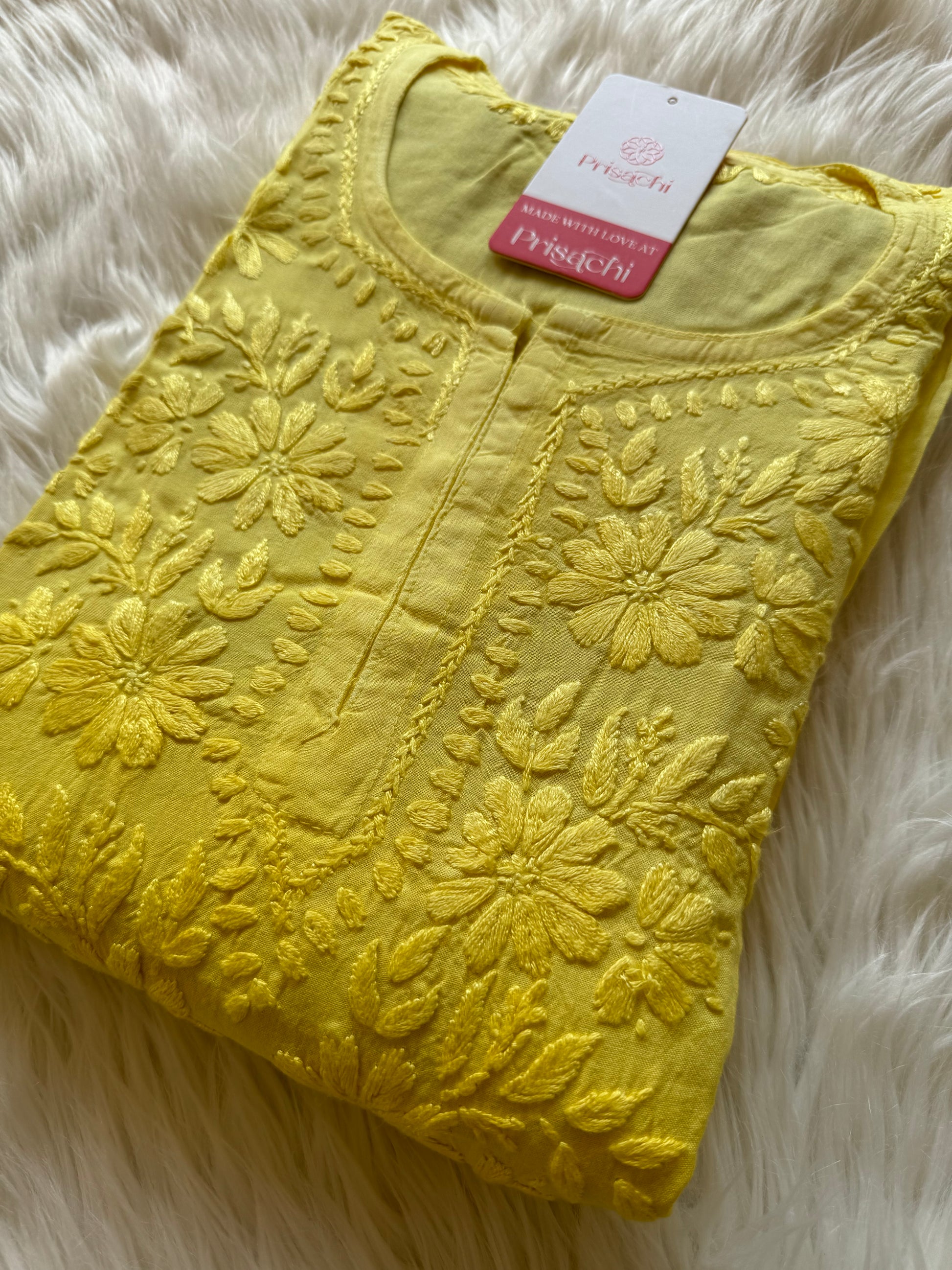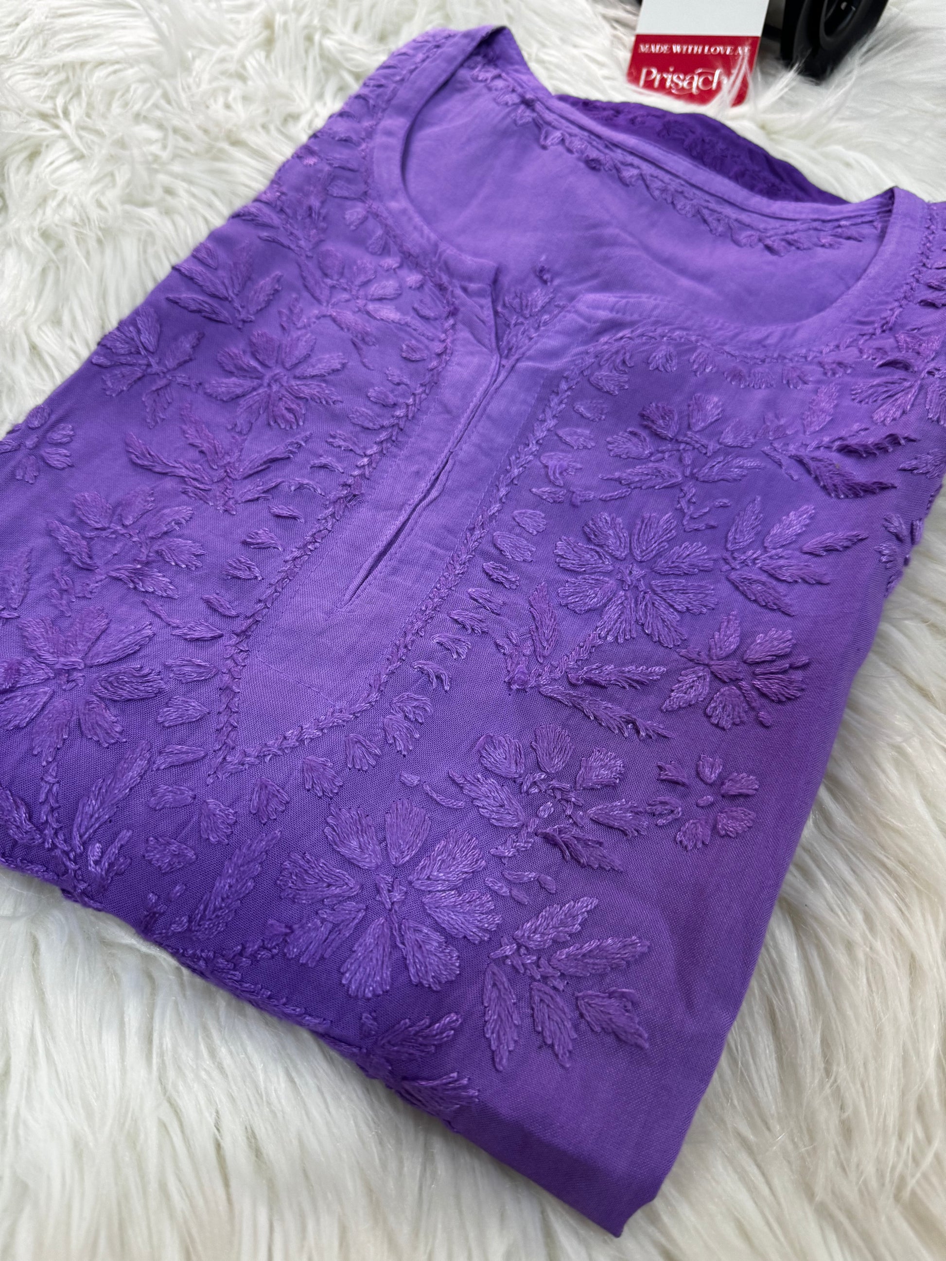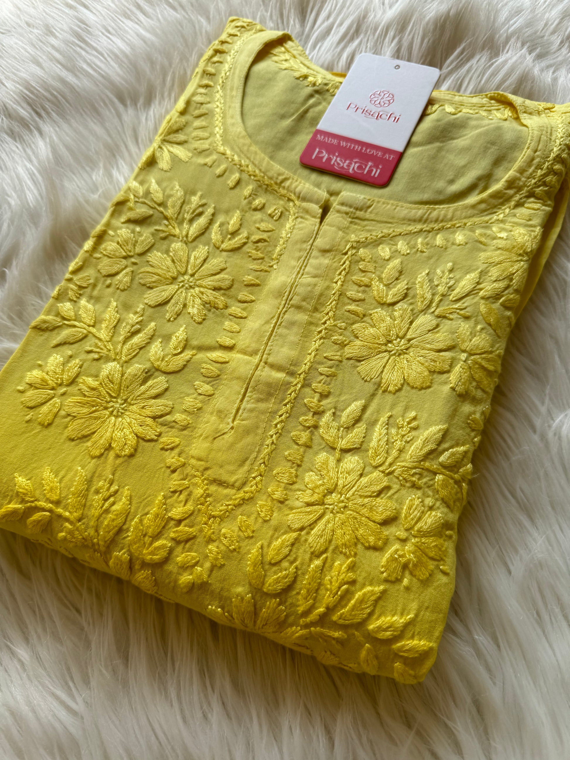 Our Short Chikankari Kurti will enhance your easy elegance. This adaptable garment, which offers comfort and flair, is expertly crafted and contains delicate Chikankari embroidery on soft cotton. Either dressed down or worn casually, it perfectly combines modern and traditional elements, giving your wardrobe's staple pieces a refined touch.