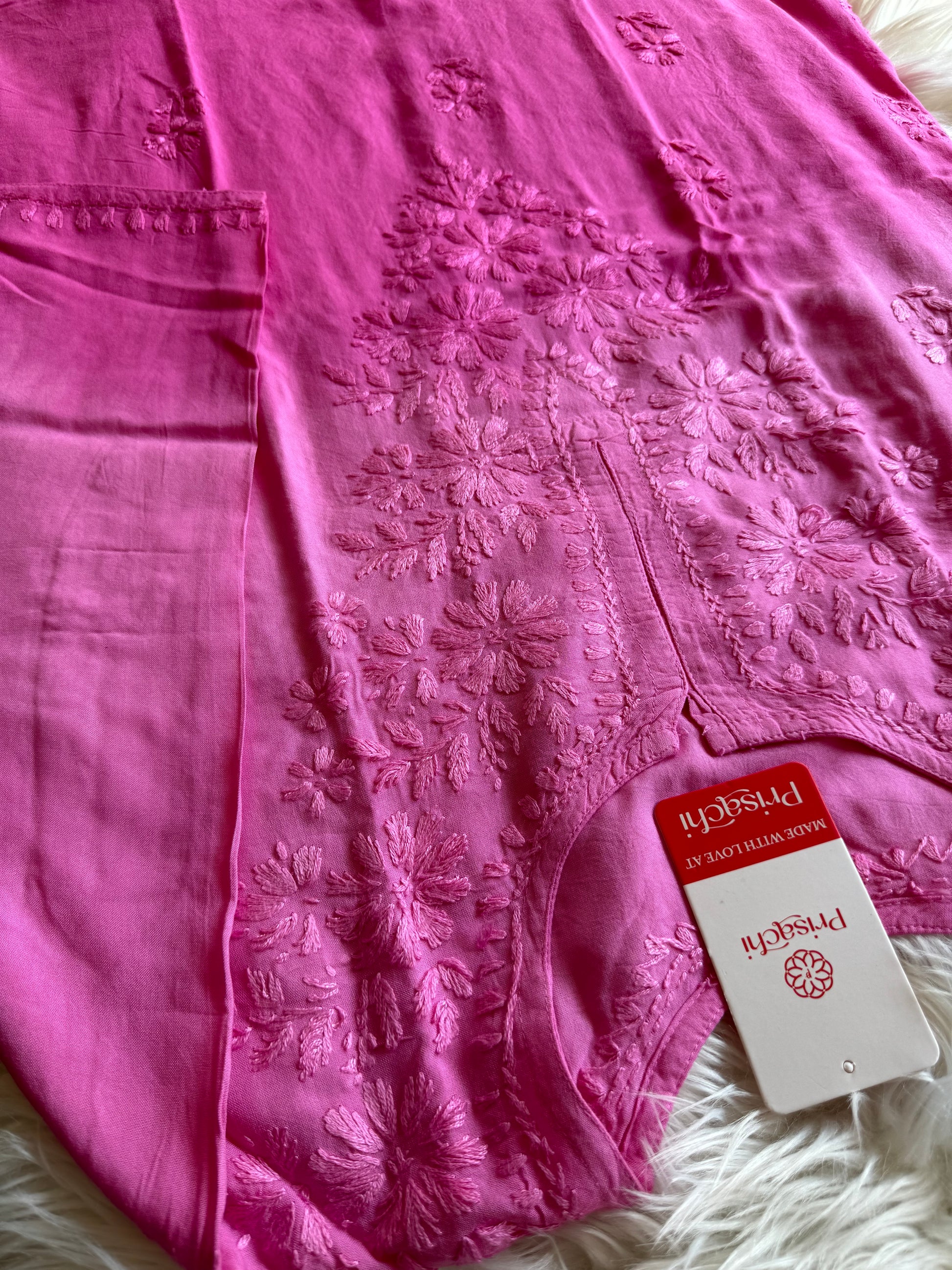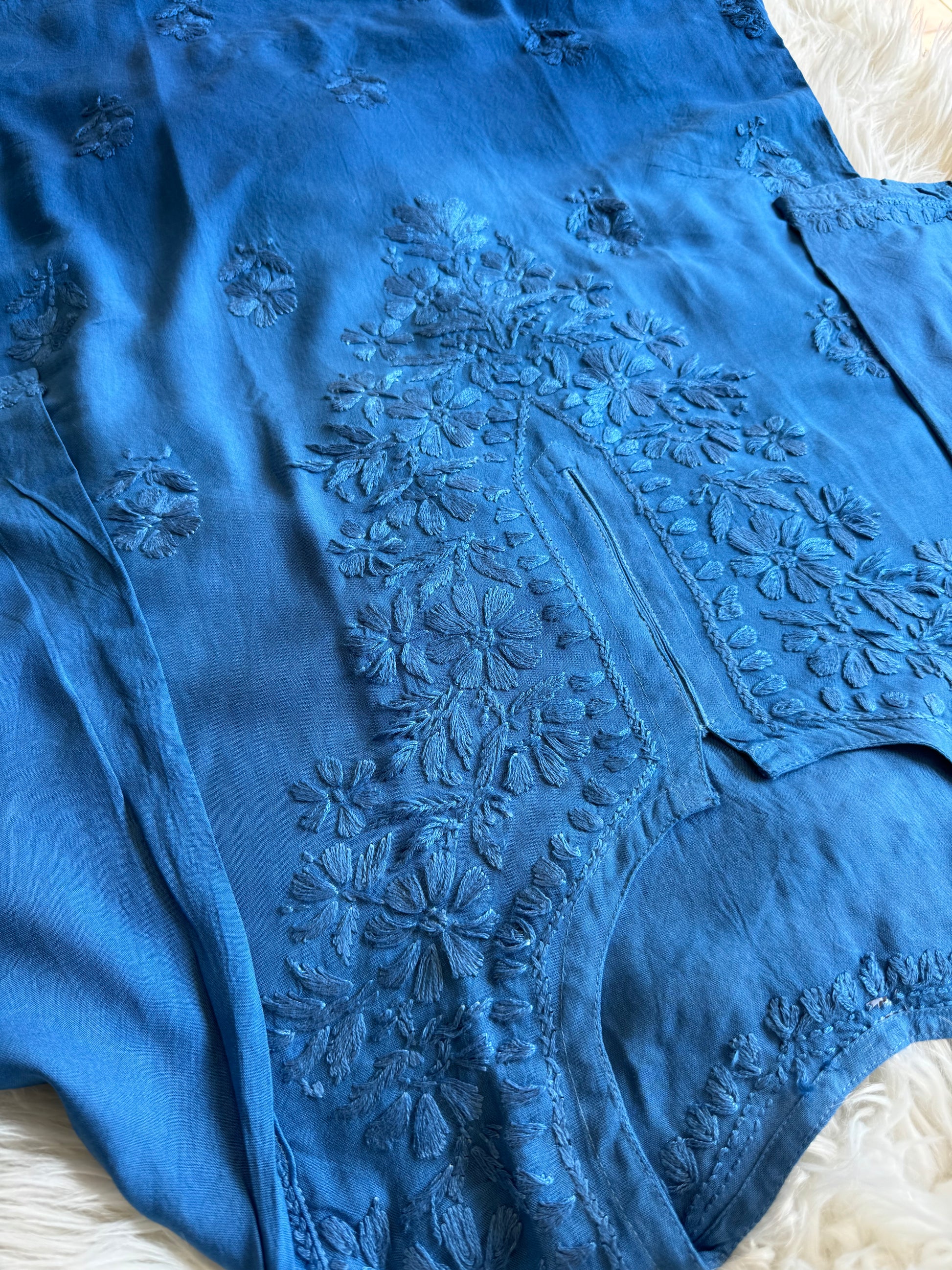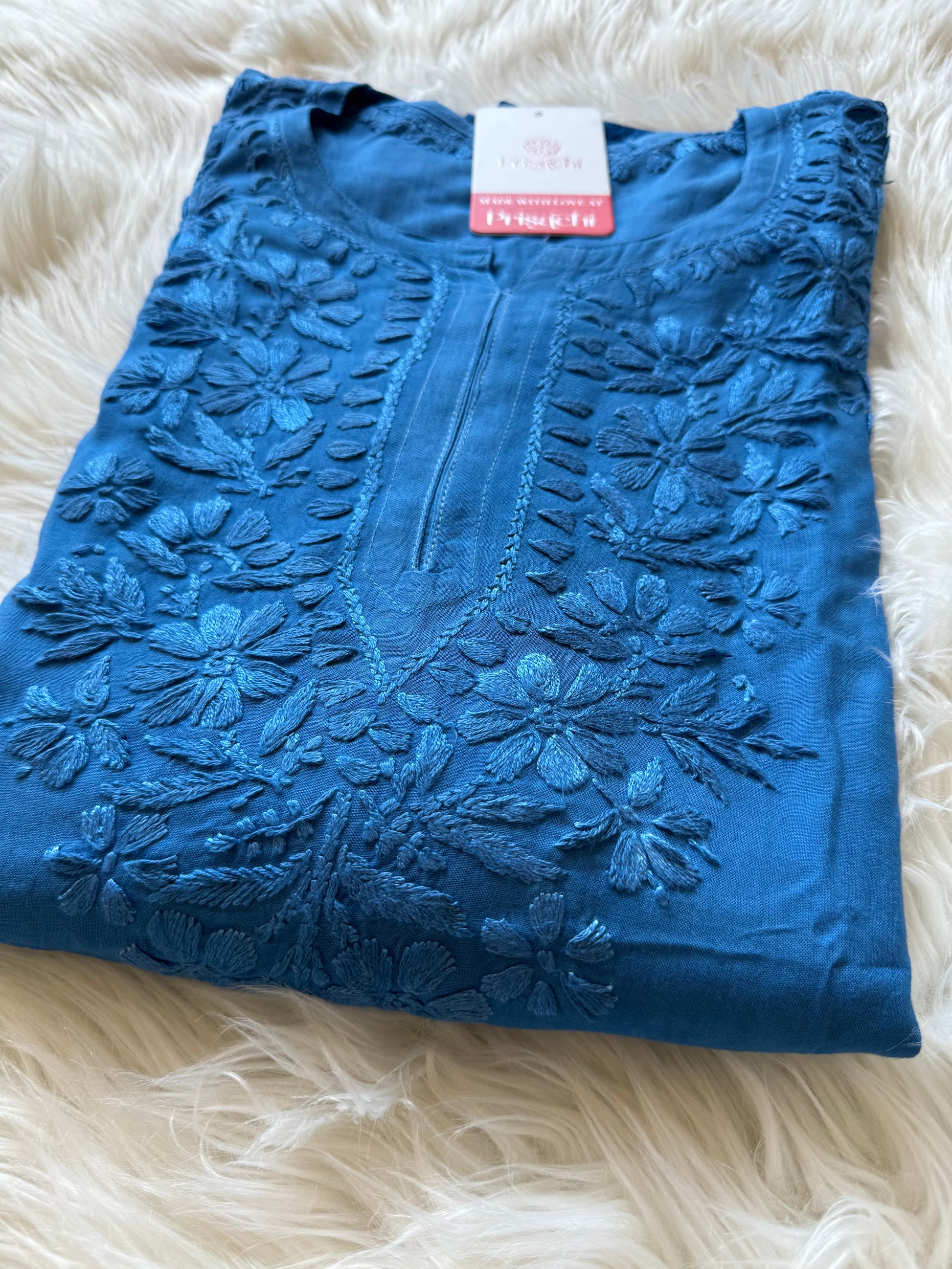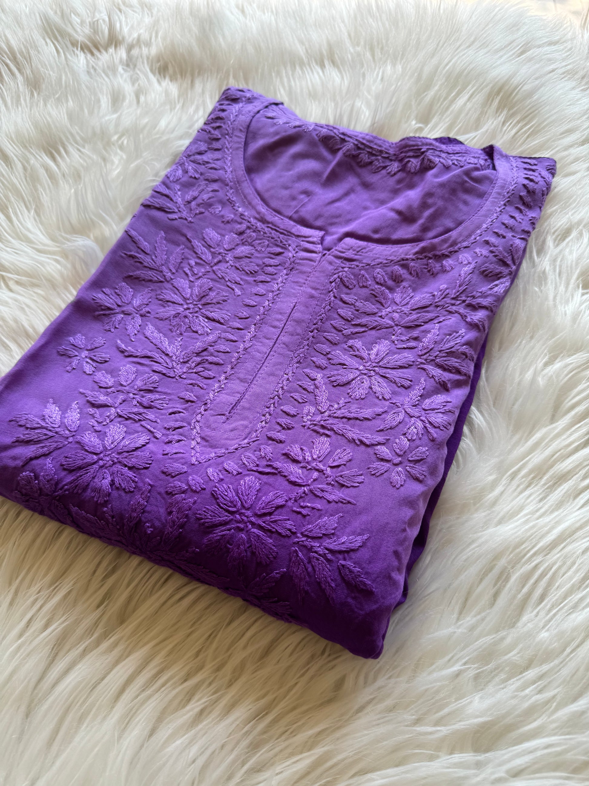 Our Short Chikankari Kurti will enhance your easy elegance. This adaptable garment, which offers comfort and flair, is expertly crafted and contains delicate Chikankari embroidery on soft cotton. Either dressed down or worn casually, it perfectly combines modern and traditional elements, giving your wardrobe's staple pieces a refined touch.